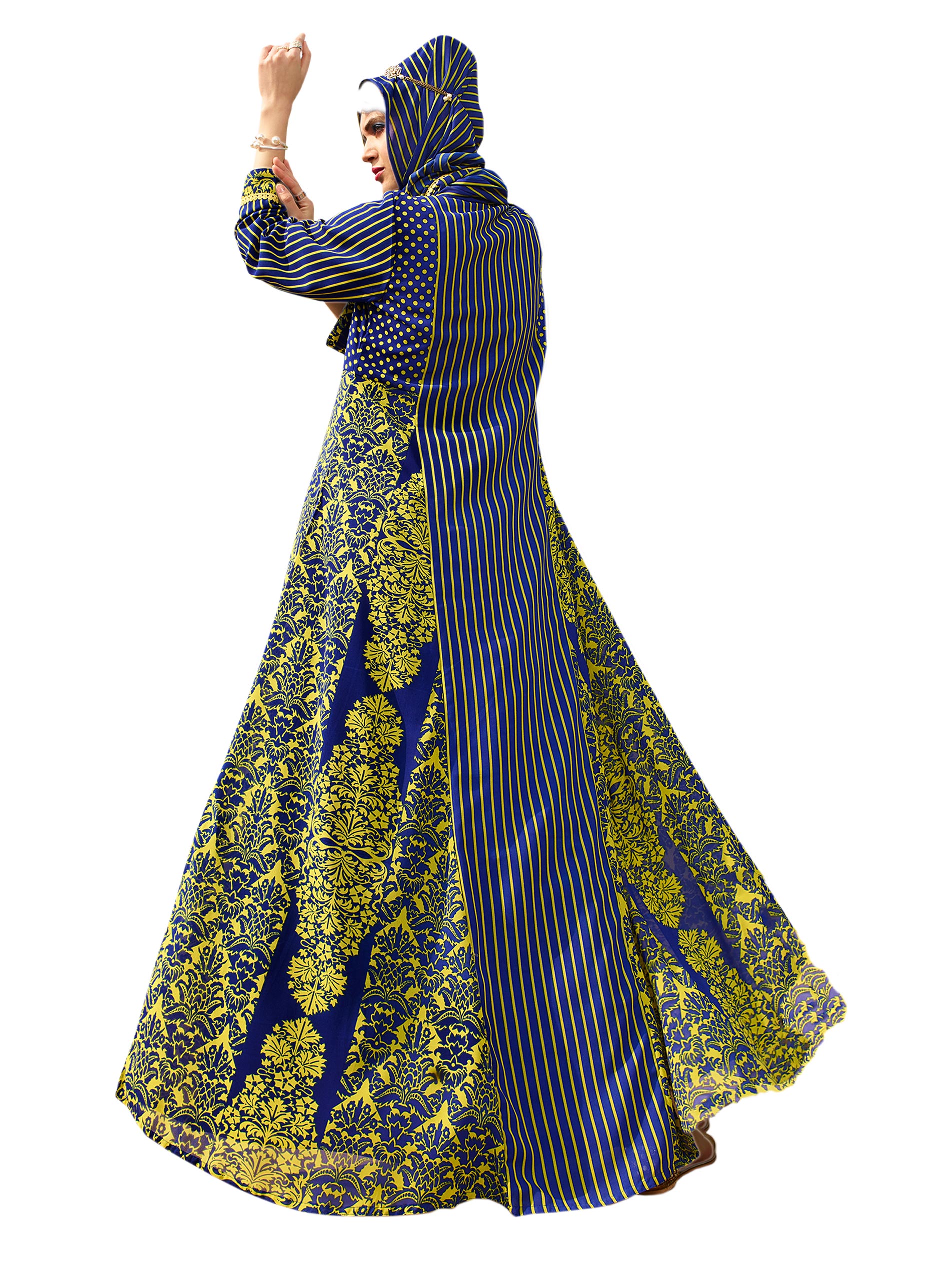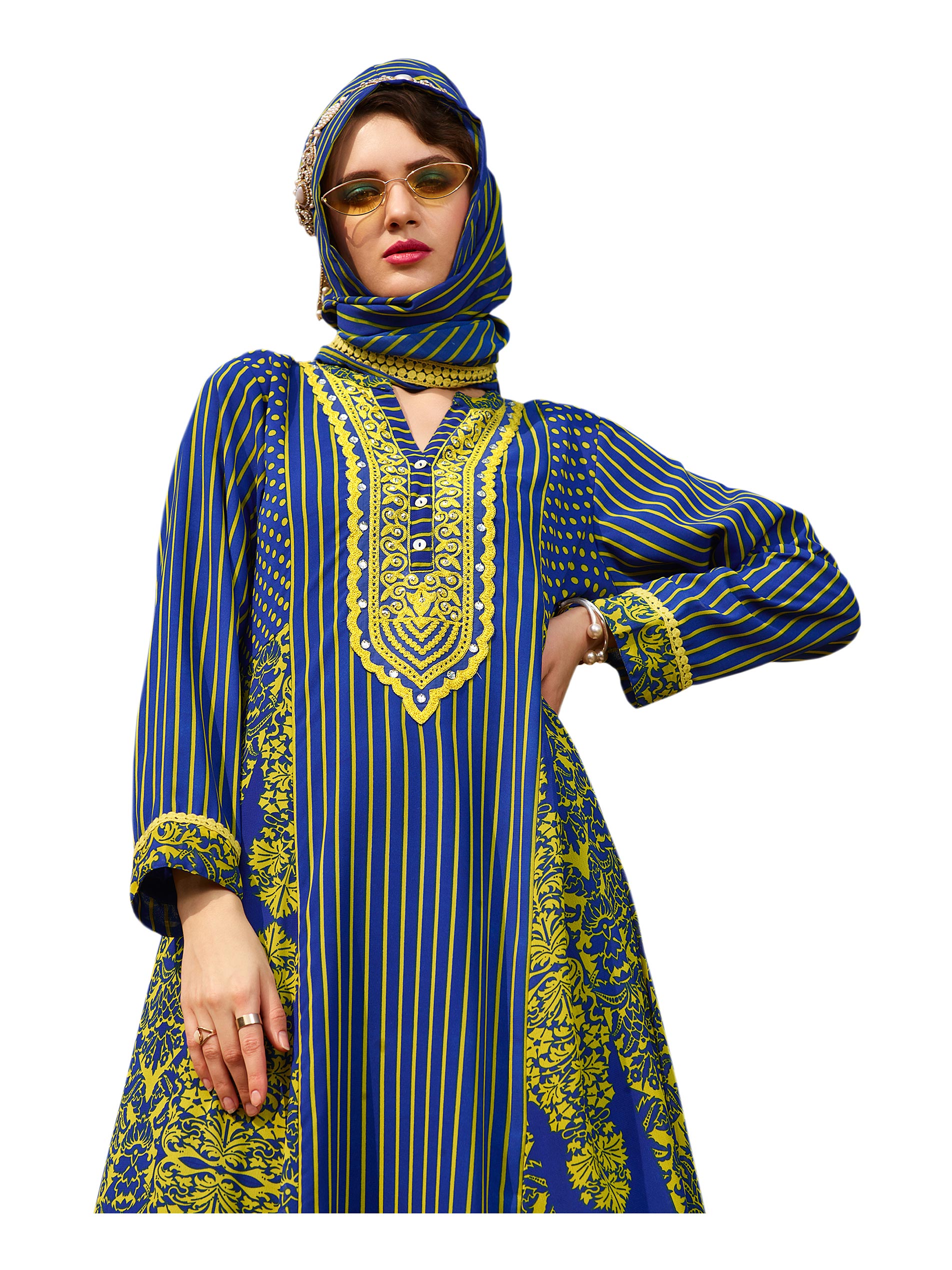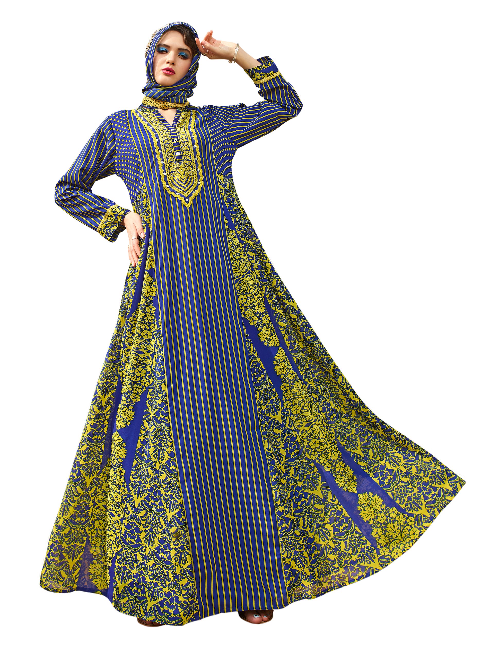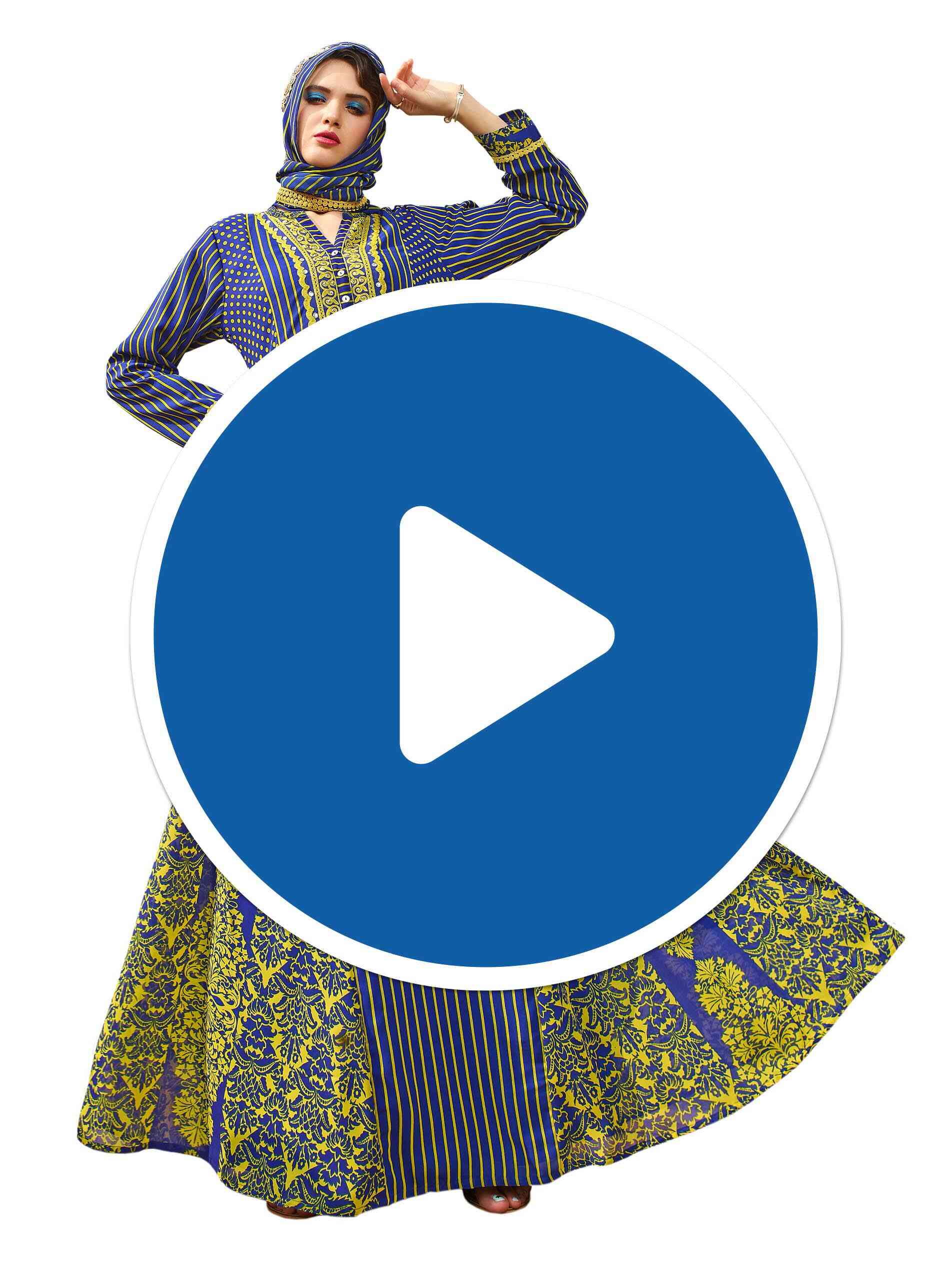 تألقي هذا الصيف بجلابية من الشيفون كاملة الطول بفتحة رقبة على شكل حرف V وأكمام كاملة، مميزة بتصميمها الدمشقي الريفي وألوانها المتعددة ما بين اللونين الأخضر والأزرق لاطلالة لامعة ومميزة عن الاخرين.