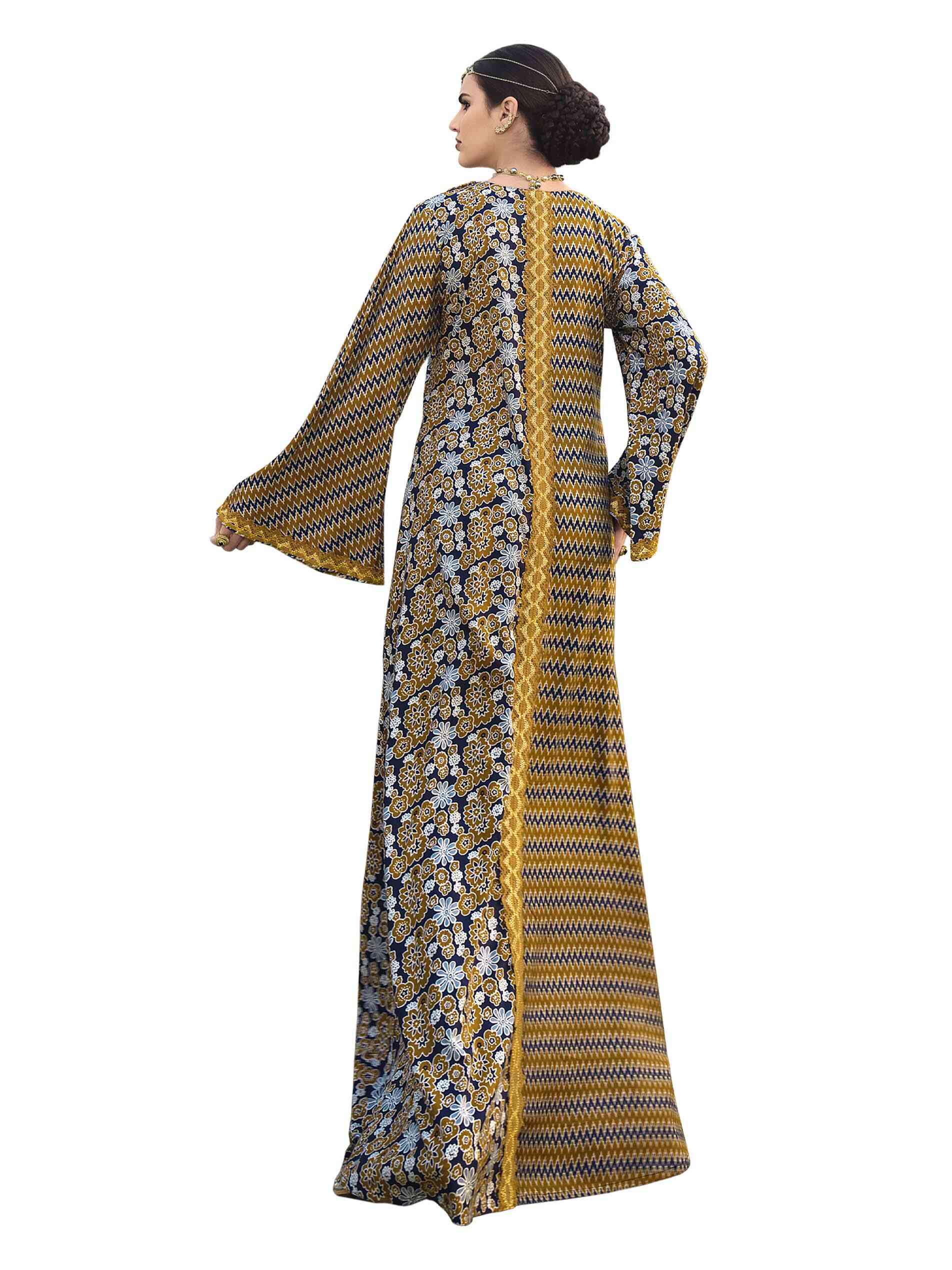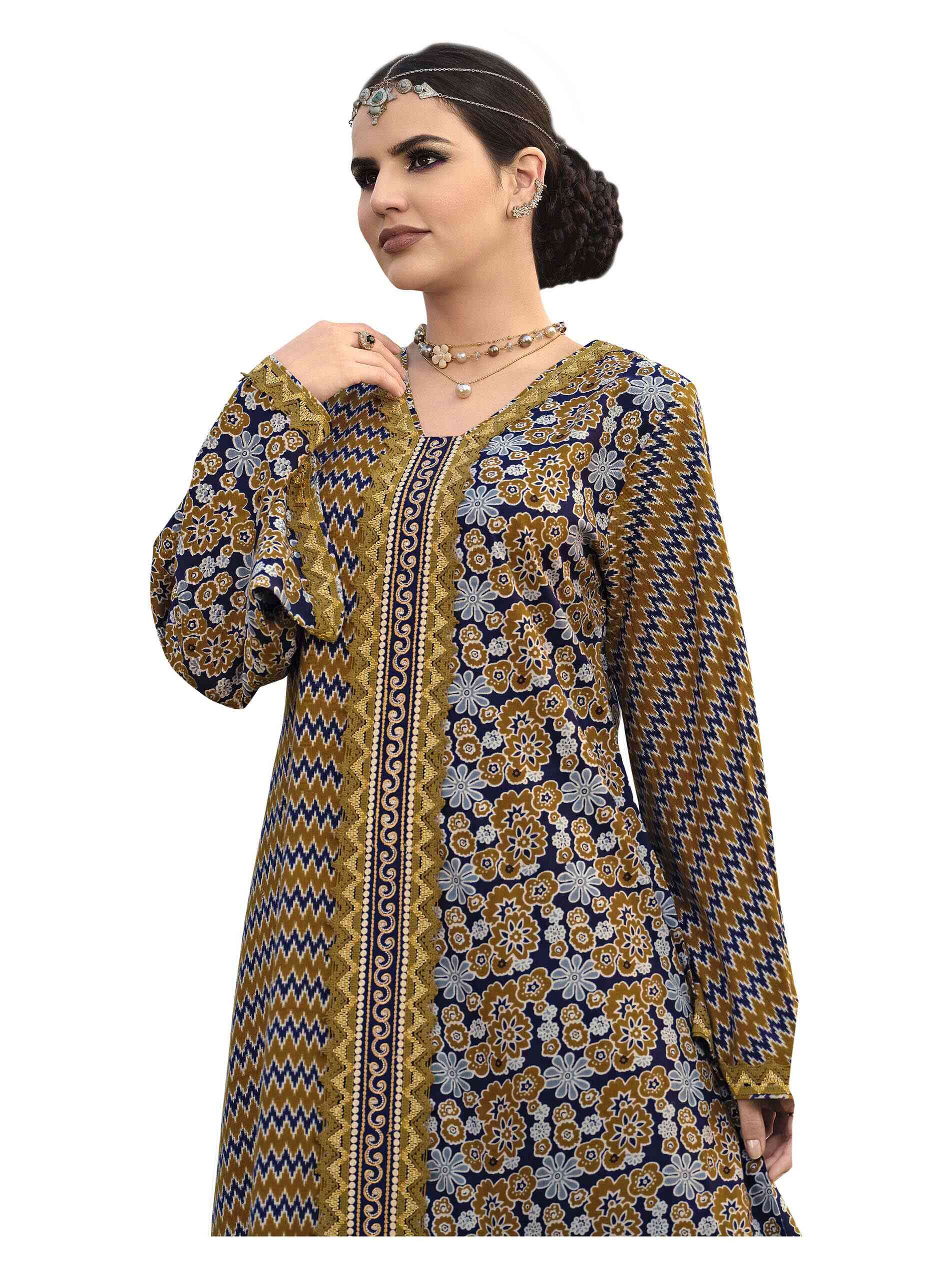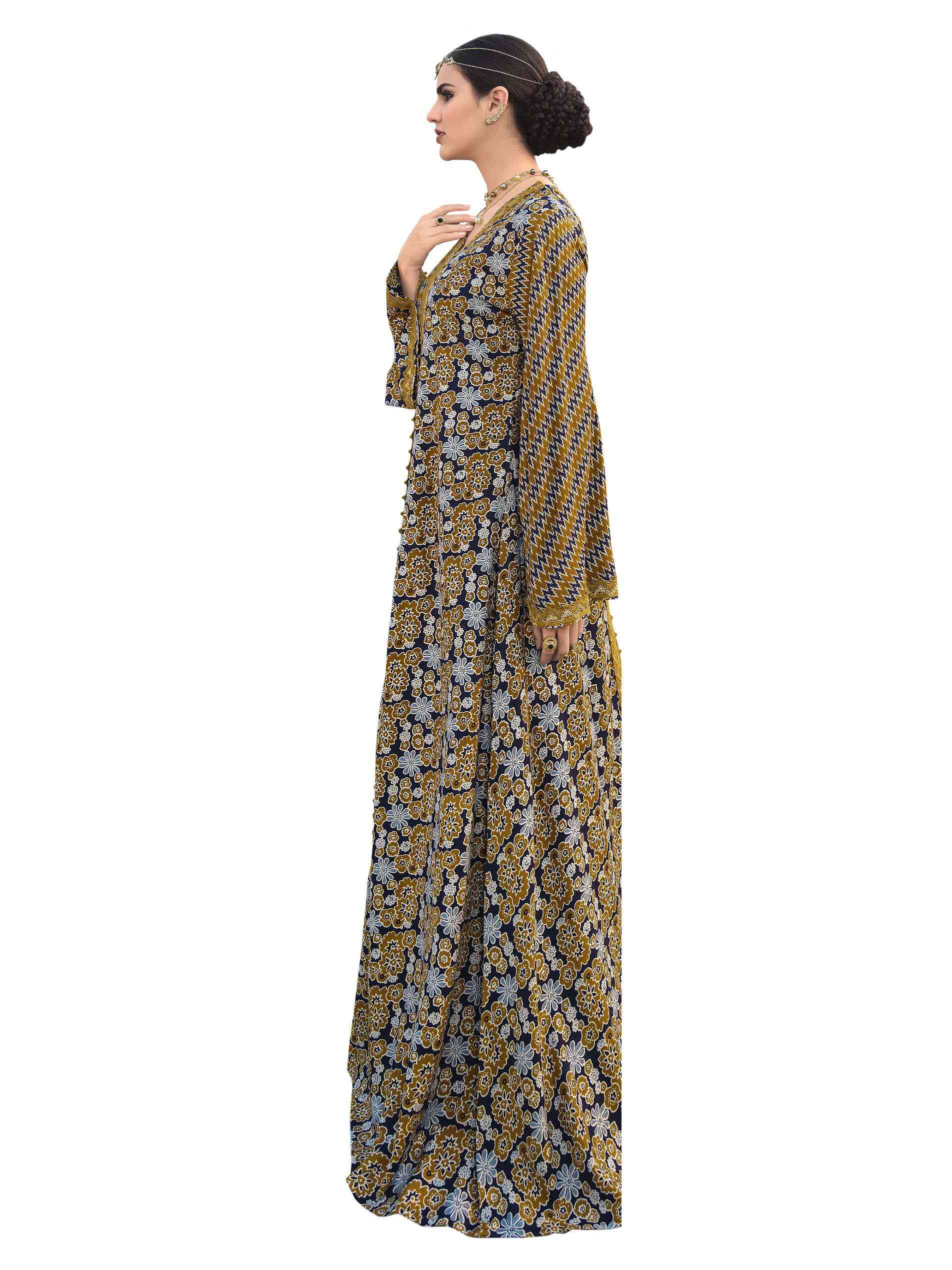 جلابية طويلة من الفيسكوز والبوليستر بنقشة الأزهار وطبعة أيكات مميزة بألوانها المتعددة لمظهر لا يقاوم، مصممة بأكمام كاملة ورقبة على شكل حرف V لاطلالة مثالية في الحفلات!