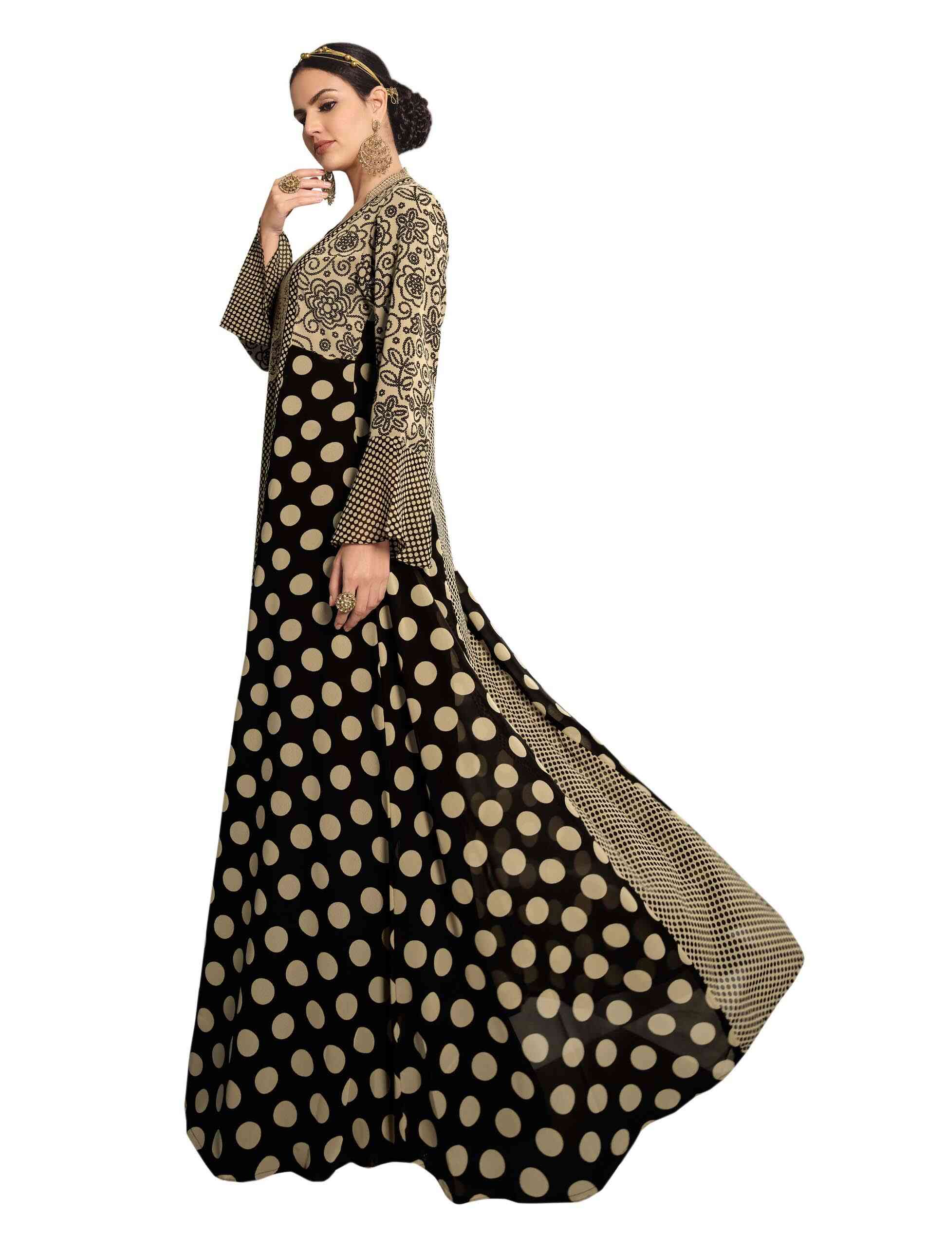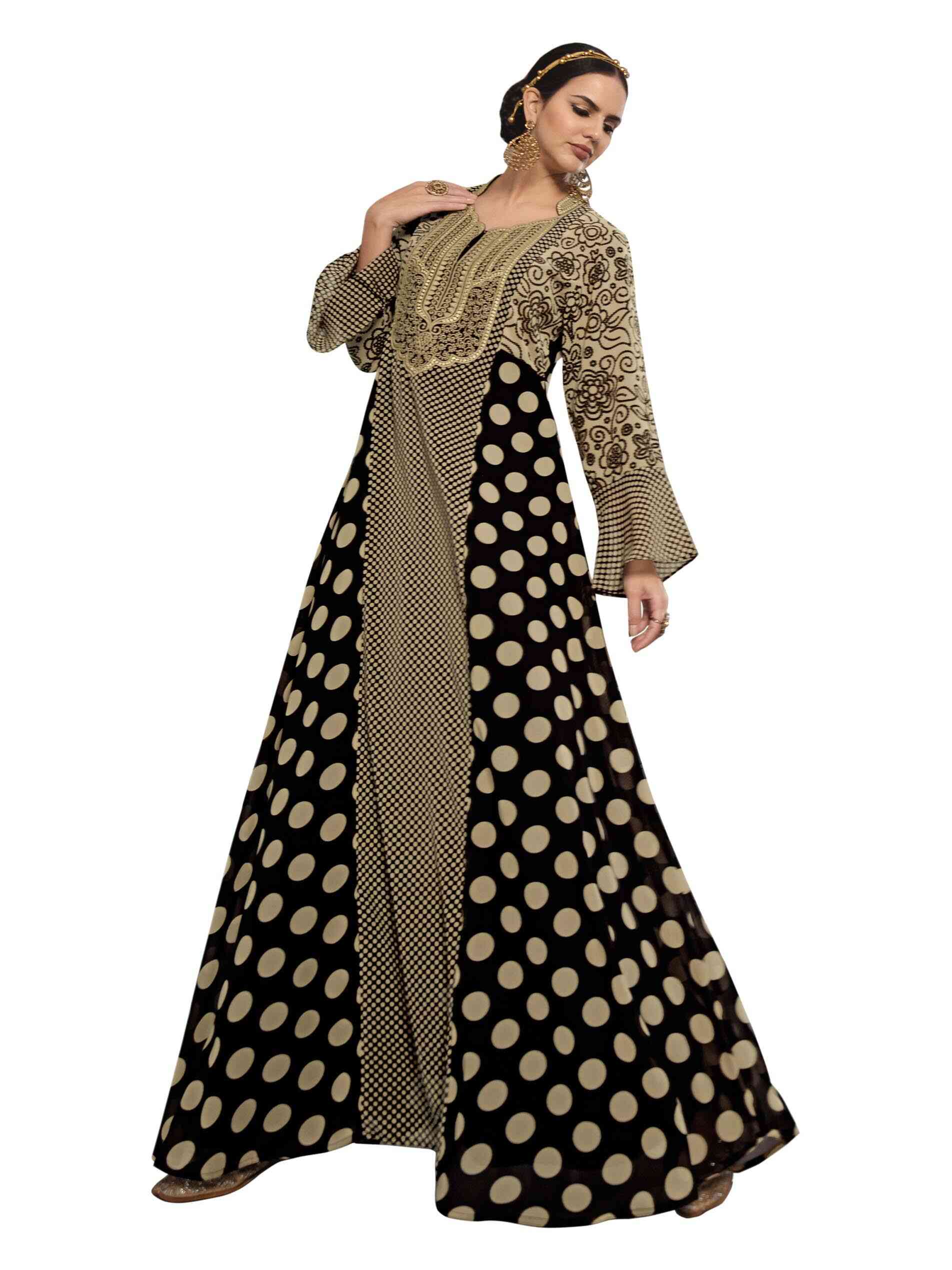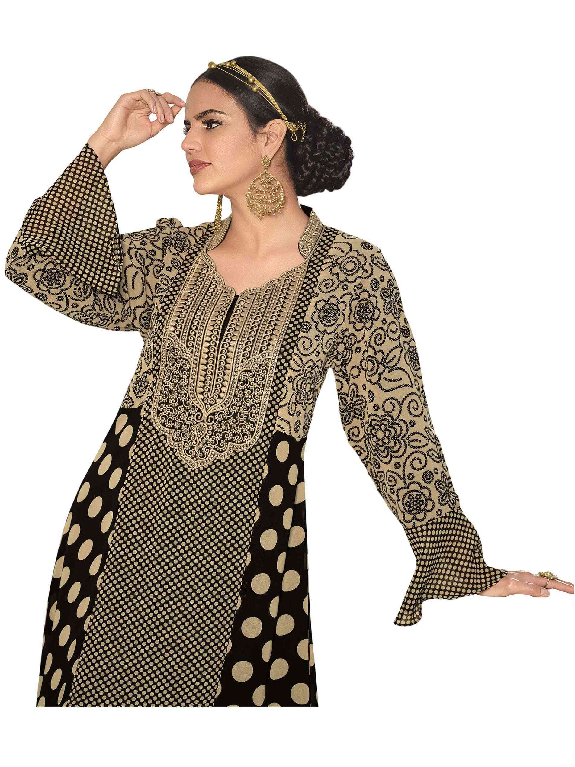 جلابية سوداء كاملة الطول وواسعة مصممة من البوليستر بنقاط البولكا وطبعات الزهور مع أكمام كاملة ورقبة على شكل حرف V لاضفاء لمسة جذابة تبرز جانبك الجريء في الحفلات الصيفية.
