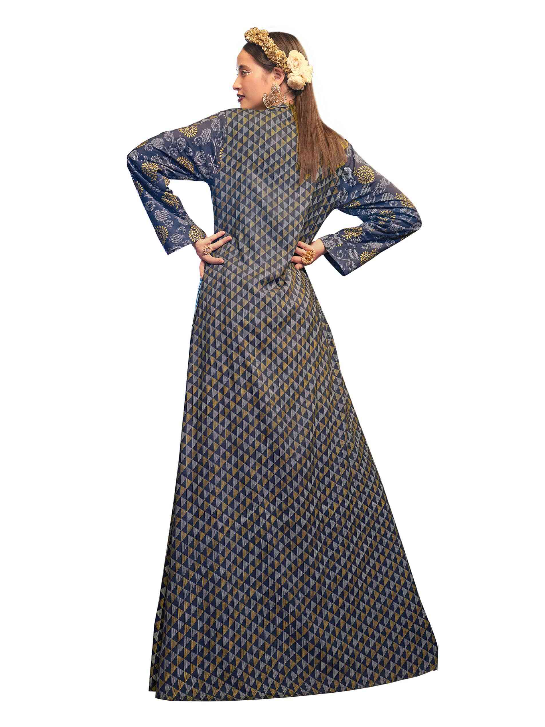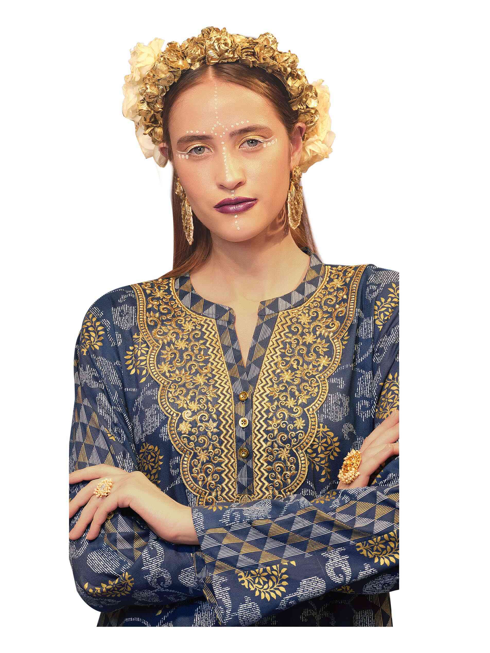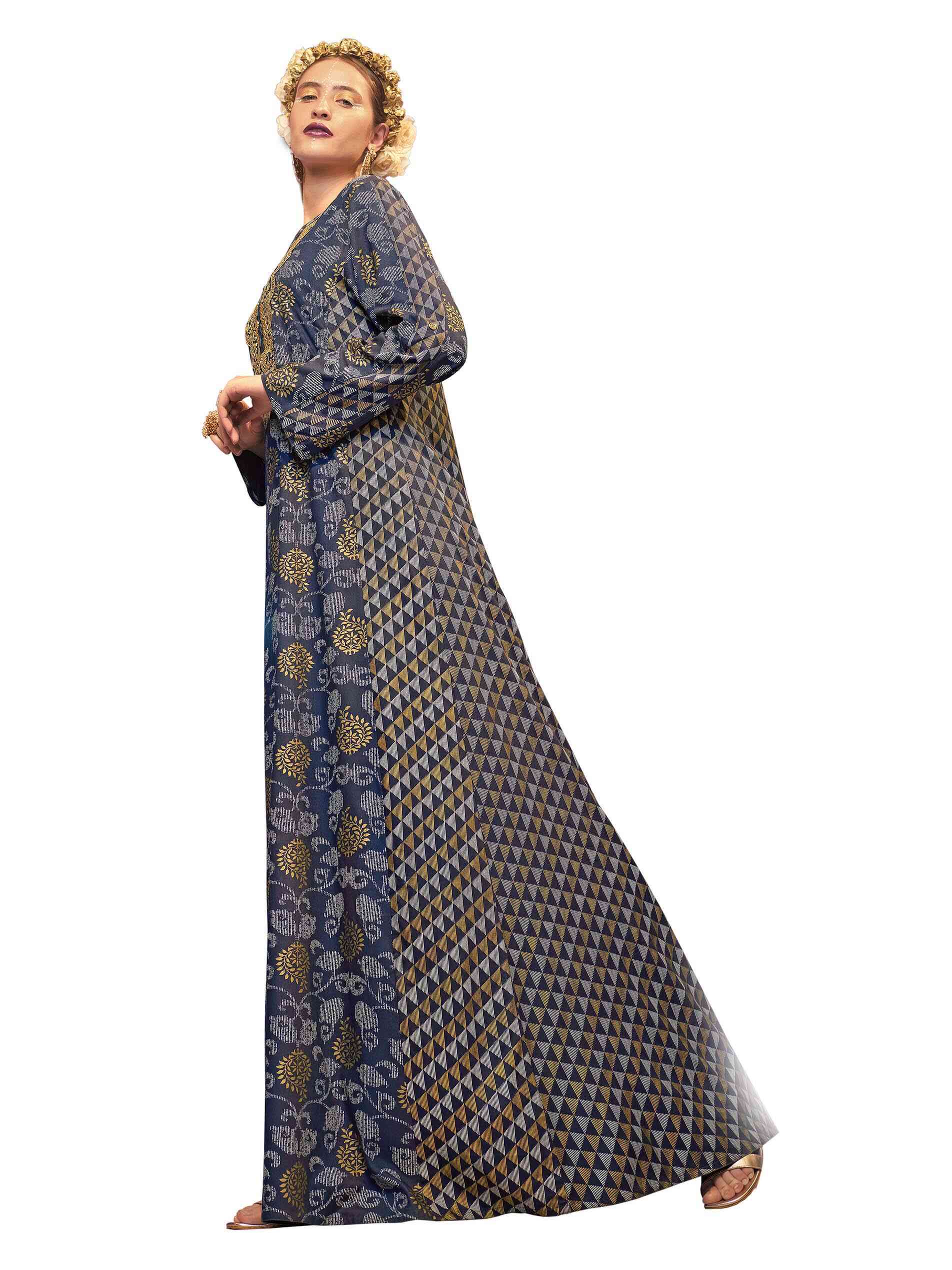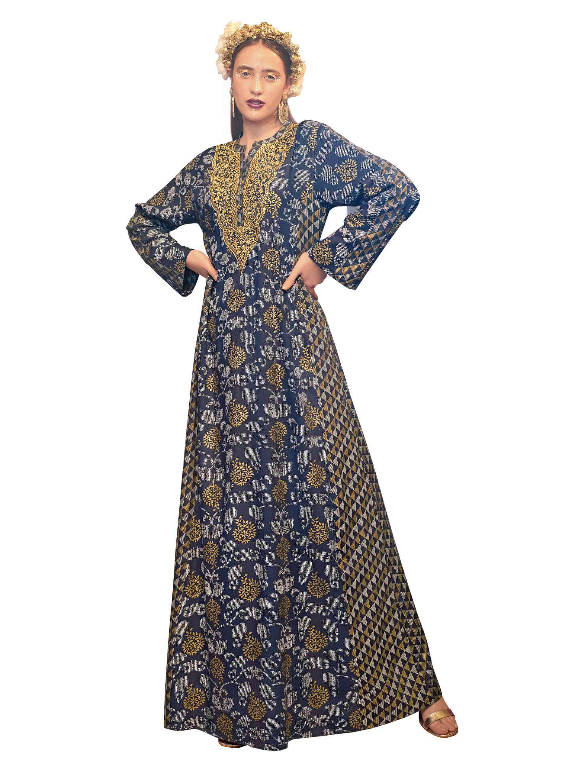 جلابية أنيقة كاملة الطول من الفسكوز بنقوشات متنوعة من المثلثات و الأزهار ممزوجة باللونين الأزرق والذهبي لتتألقي بشكل رائع. تأتي مع أكمام كاملة ورقبة على شكل حرف V لتضيف لمسة من البراعة على الدراعة بأكملها.
