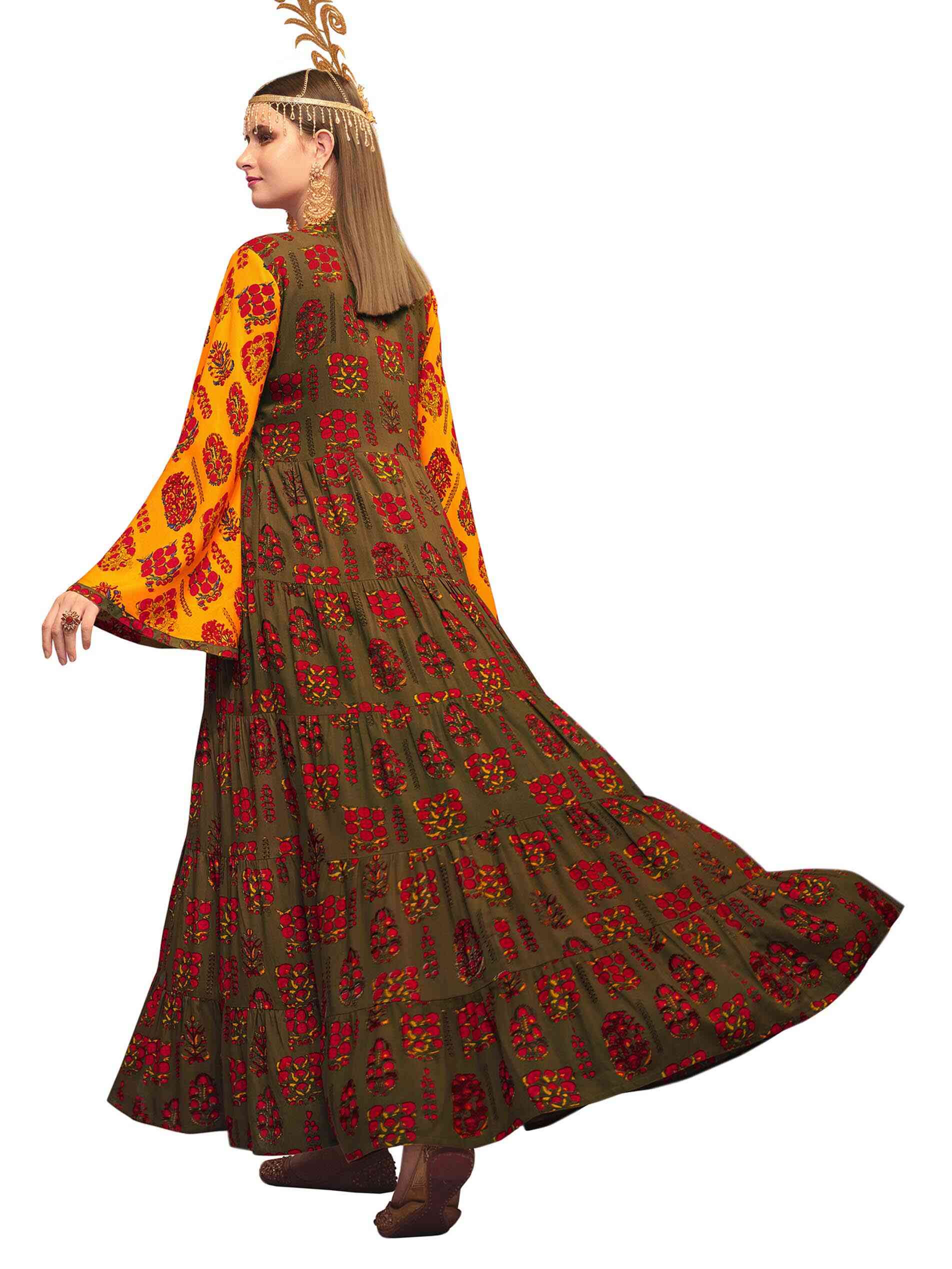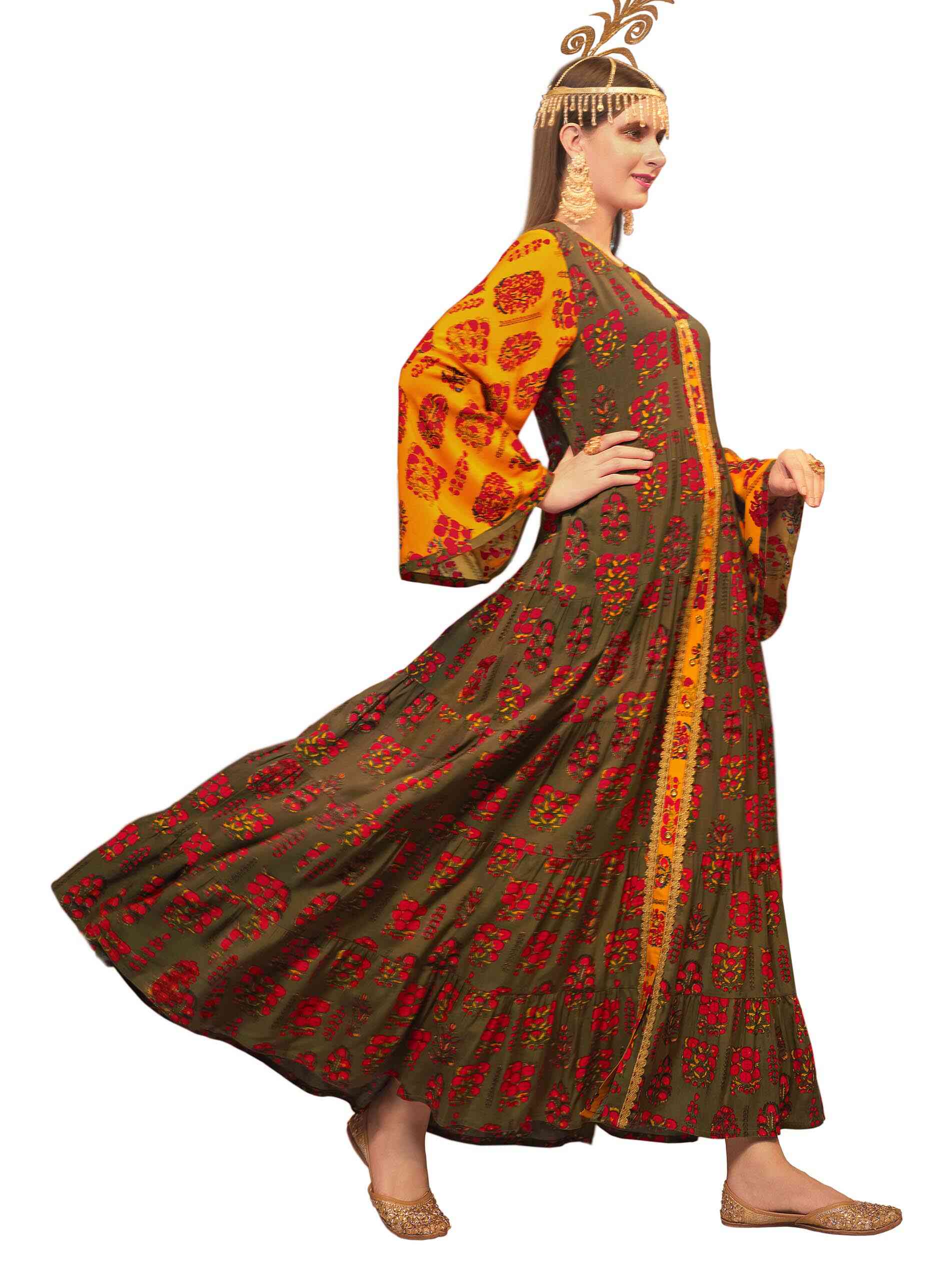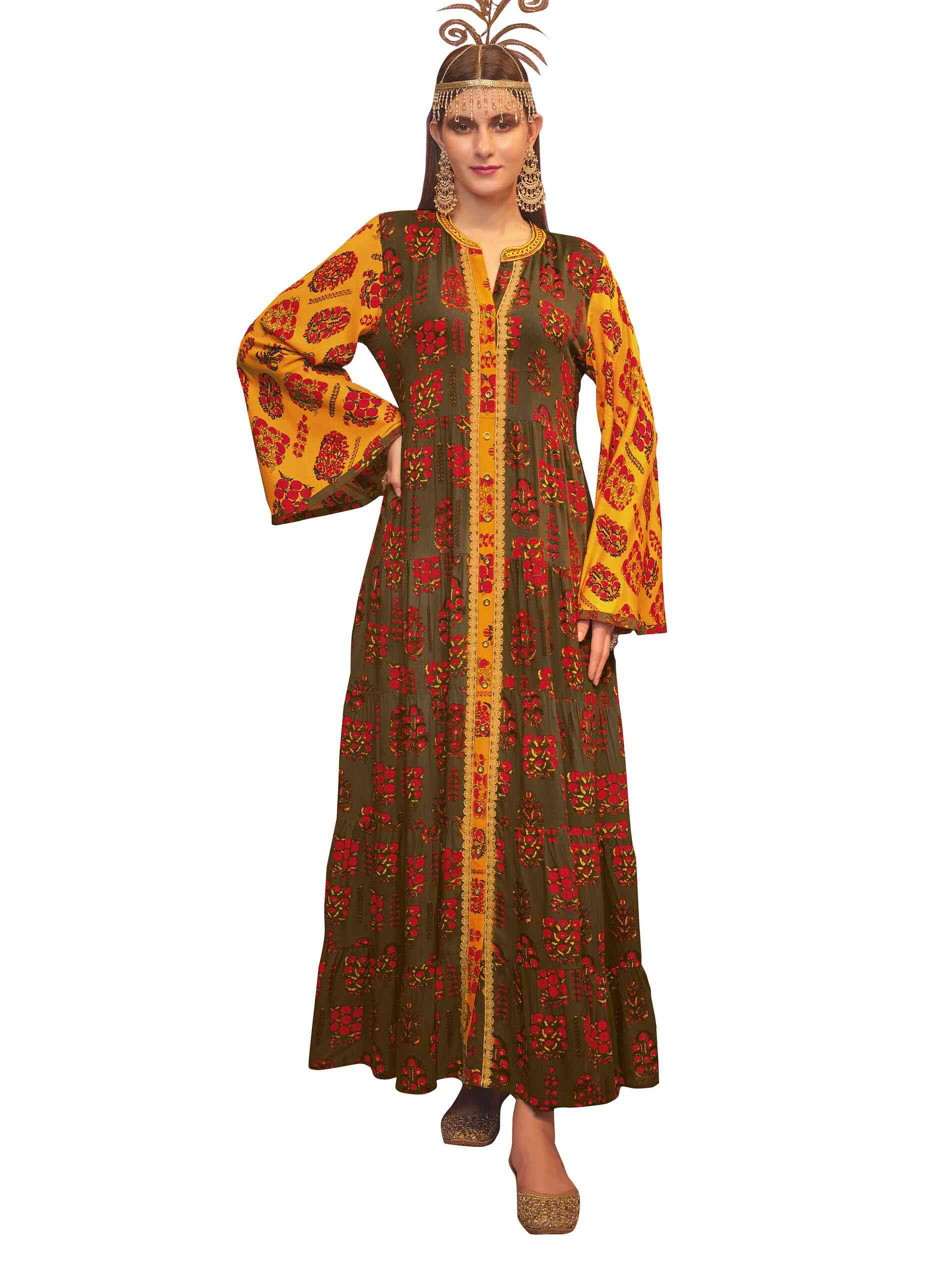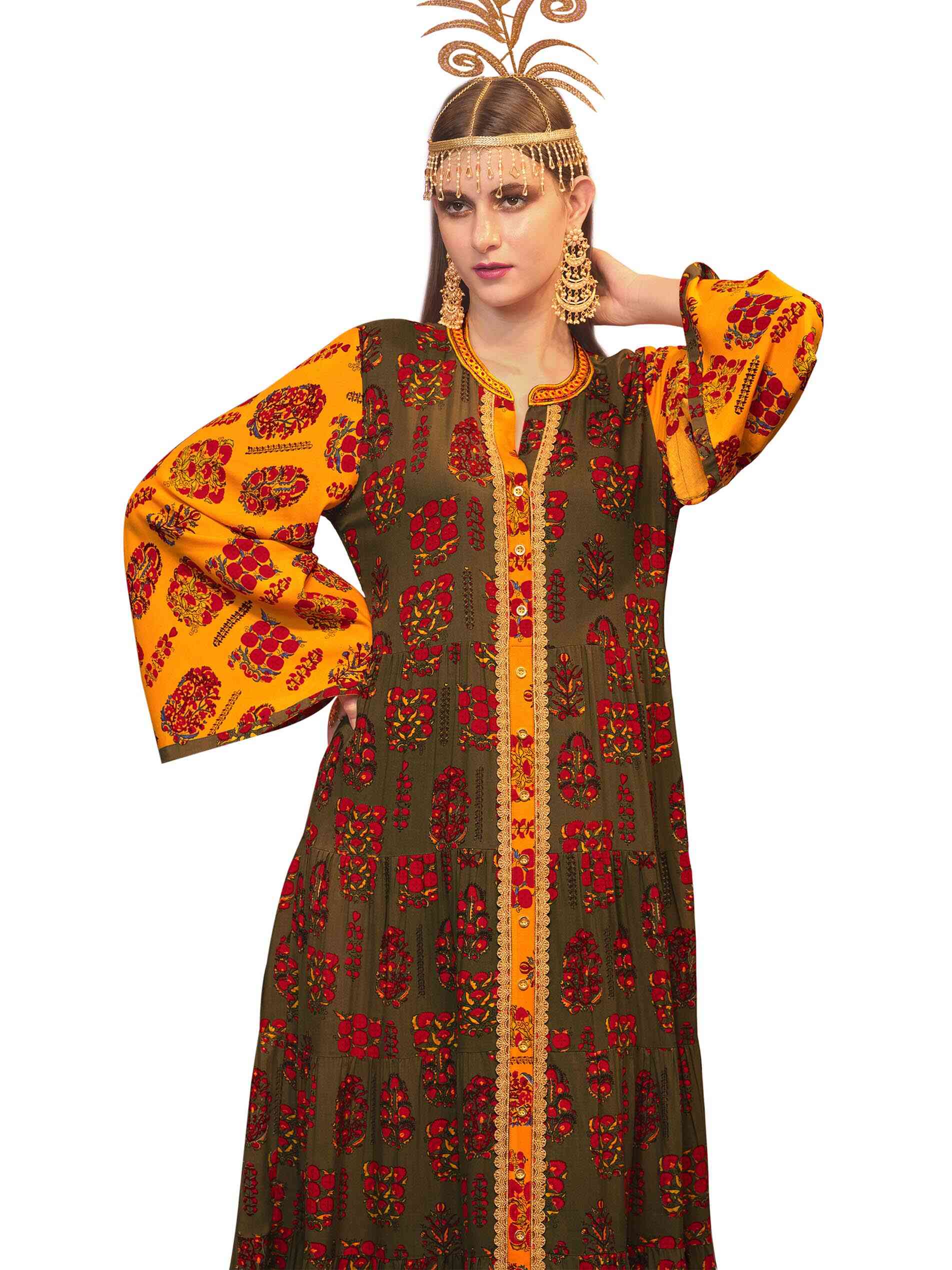 اجتمع اللون الأخضر والخردلي الأصفر والأحمر على قماش من الفيسكوز ليمنحك جلابية طويلة رائعة اللون بتصميم رائع مع أكمام طويلة وفتحة رقبة على شكل حرف V وأزرار مبطنة باللون الذهبي لاطلالة مبهجة في الاحتفالات.