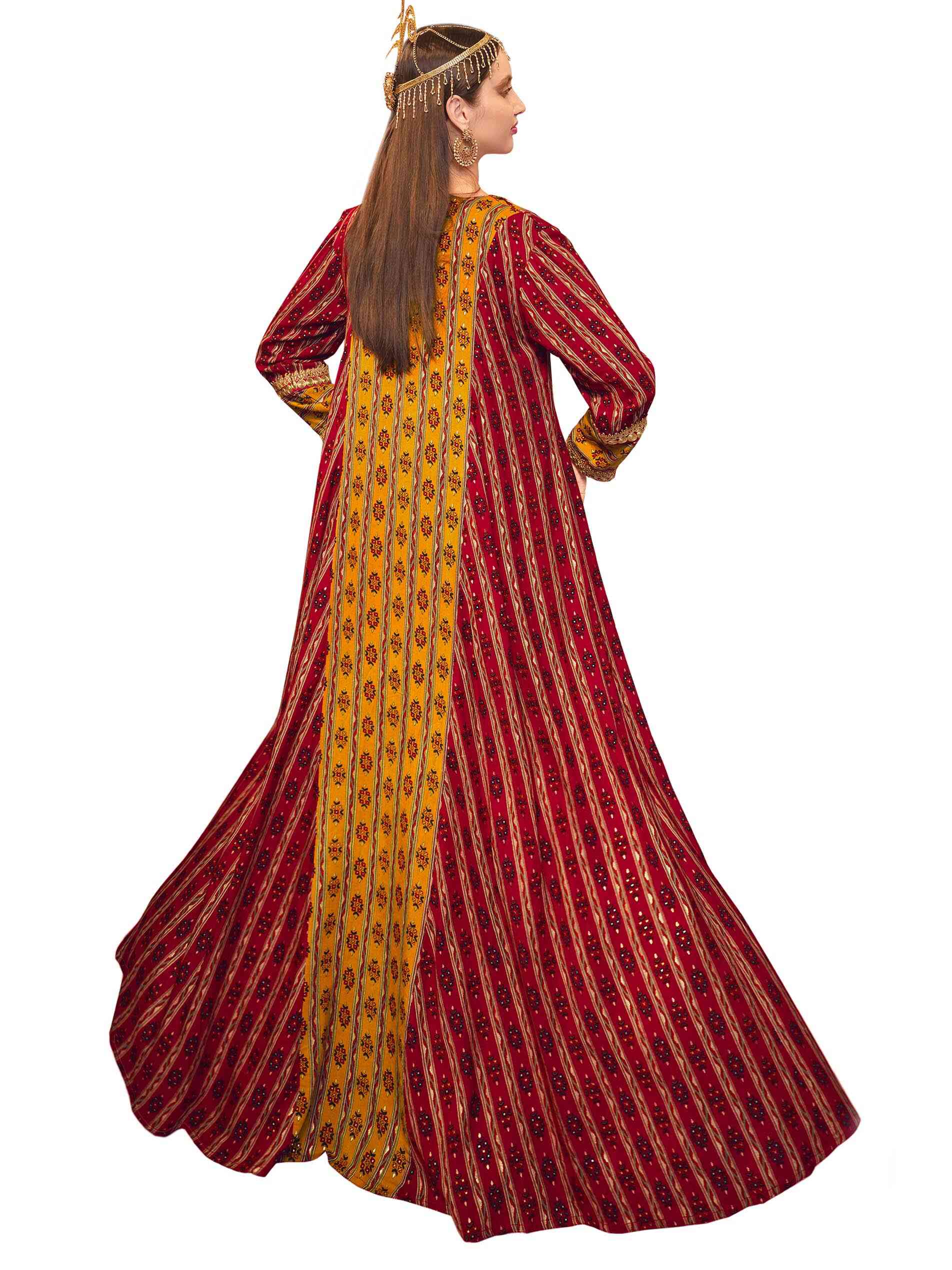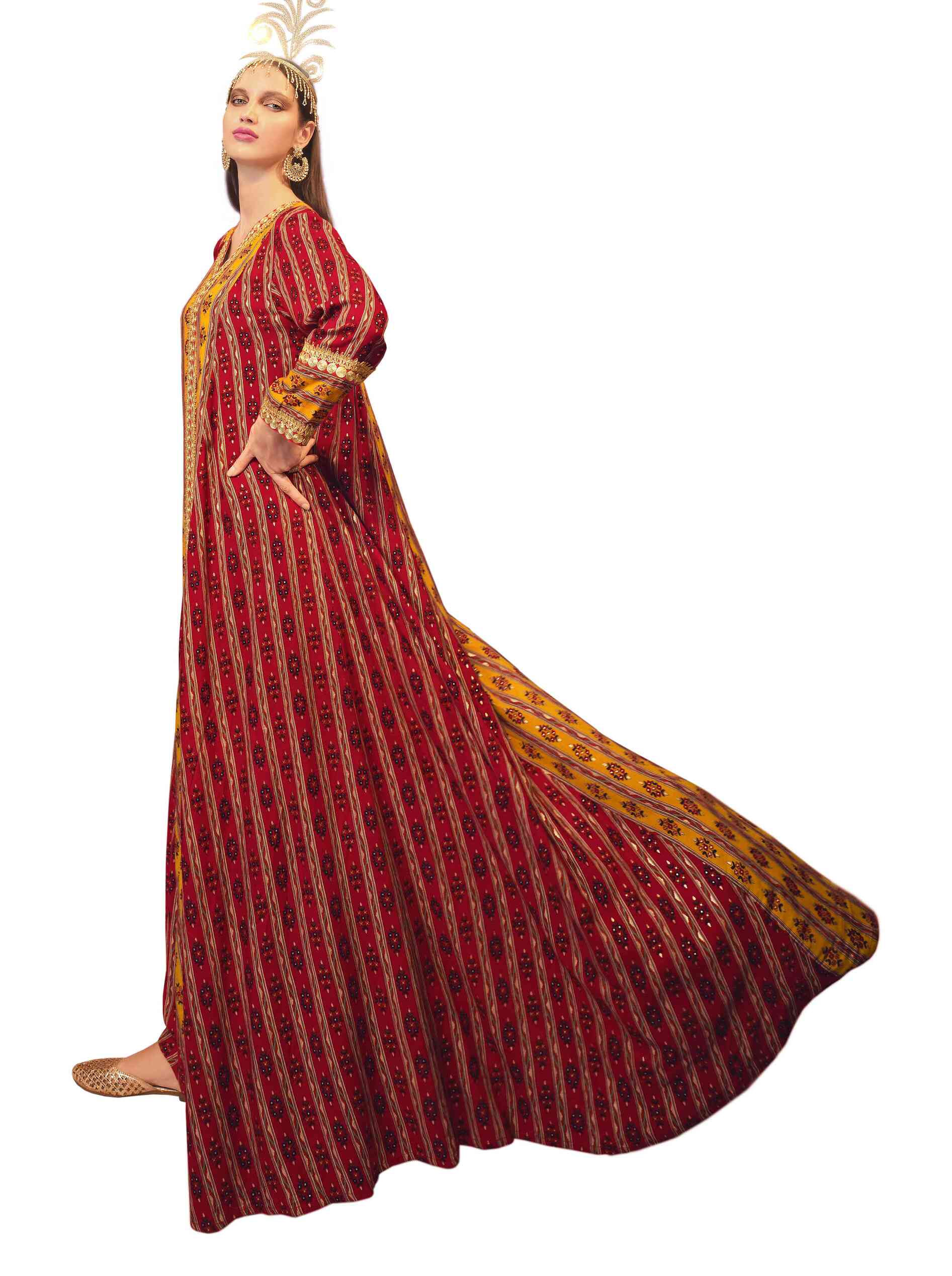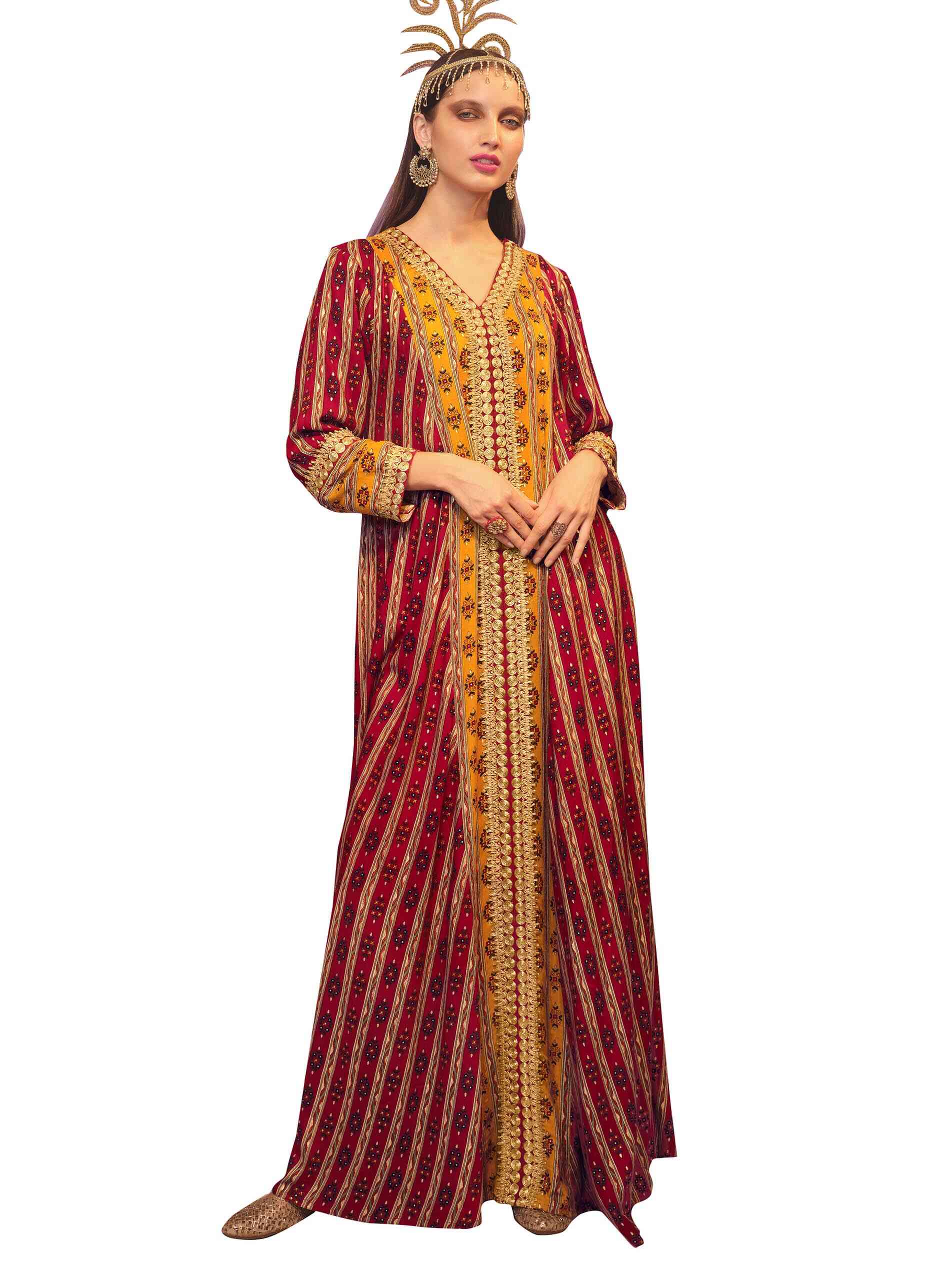 تألقي في جلابية طويلة من الفيسكوز الأحمر بقصة A-line مصممة بخطوط مطبوعة من اللون البرتقالي مع أكمام طويلة وفتحة رقبة على شكل حرف V باللون الأصفر وتمتد الى أسفل بطول الجلابية لتكون شريطاً مما يخلق تحفة فنية بمزيجاً رائعاً من الألوان لاطلالة جذابة في الاحتفالات.