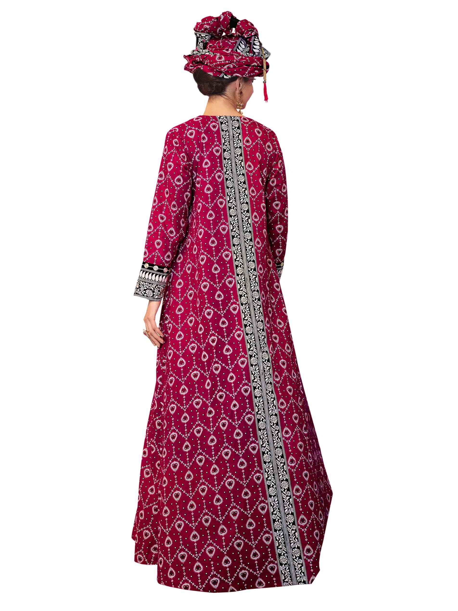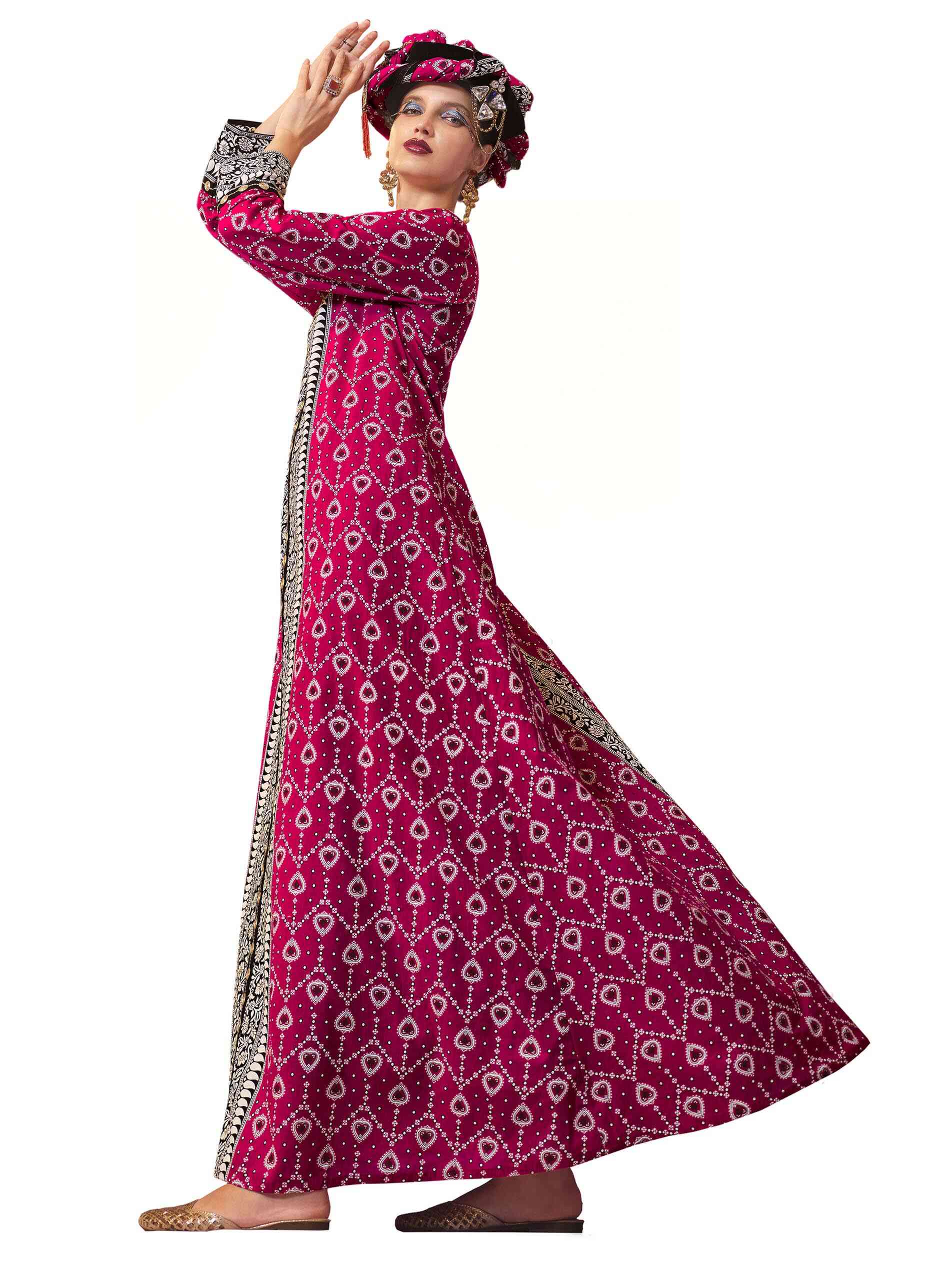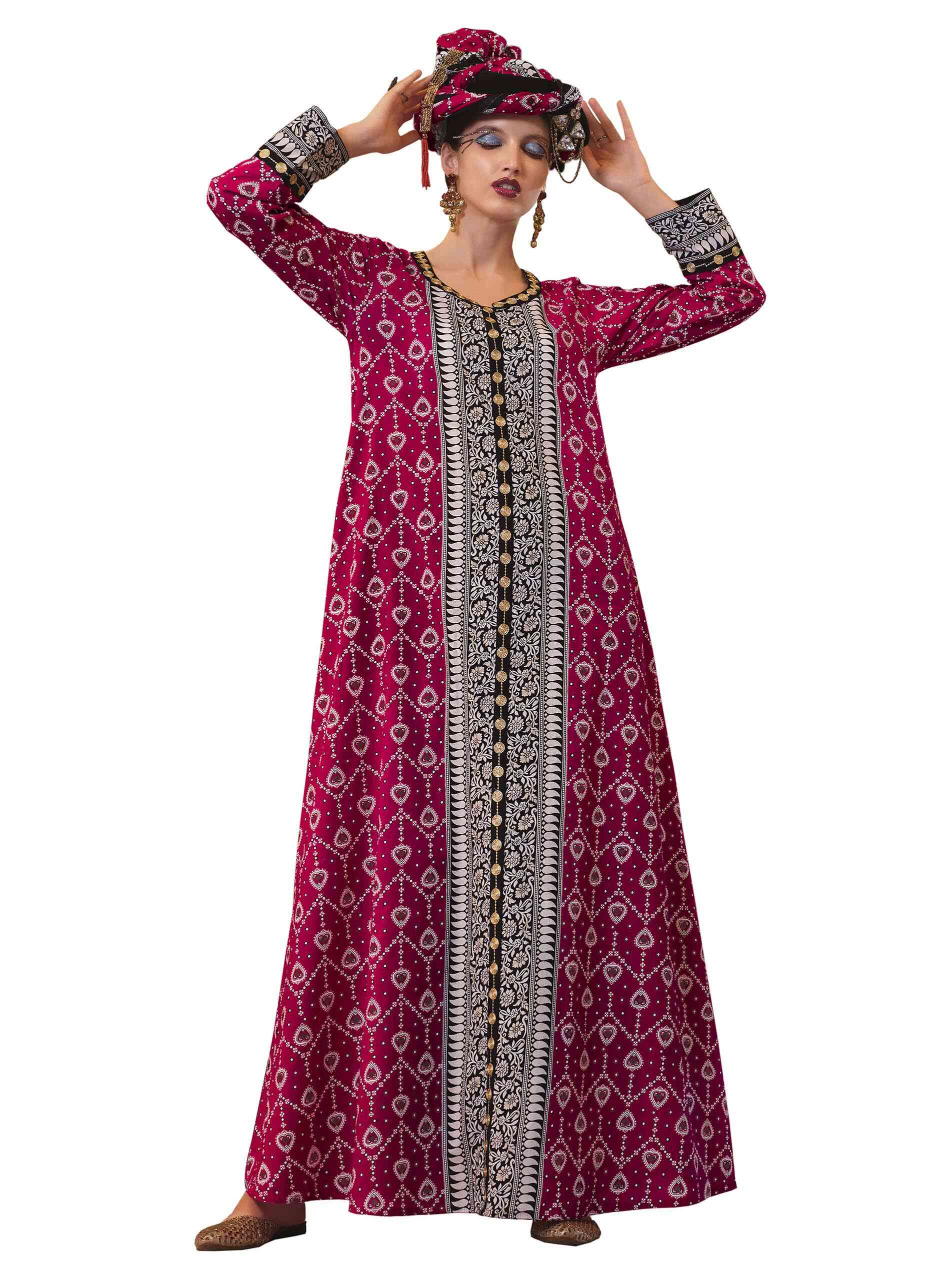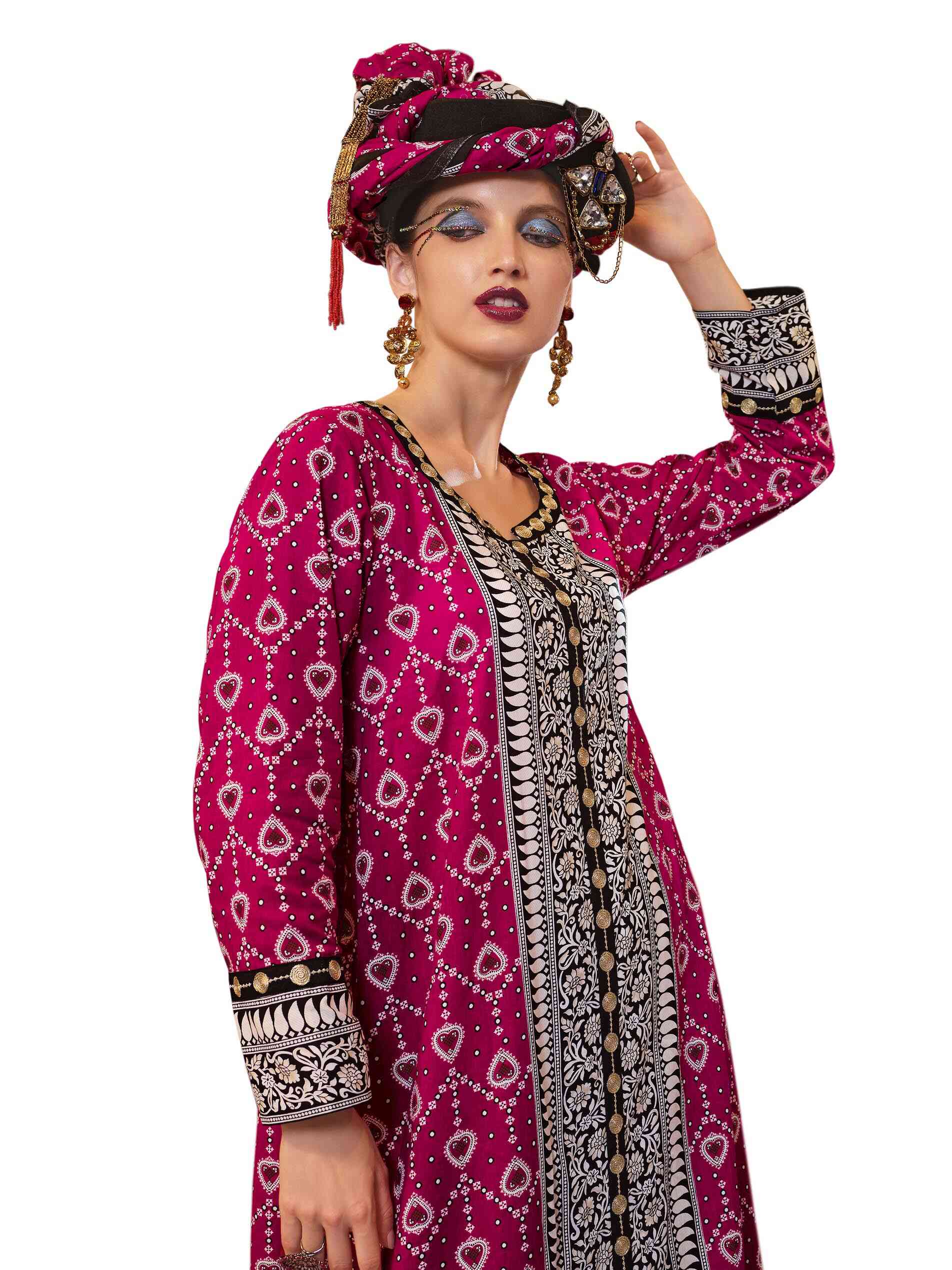 تألقي باطلالة وردية في قصة واسعة وساحرة من طبعات الأيكات على جلابية قطنية مع تطريز بارز بالطول وعلى الأساور وعلى الأطراف وفتحة رقبة على شكل حرف V مصممة بدوائر من الذهب تمتد بطول الجلابية لاكمال أناقتك.