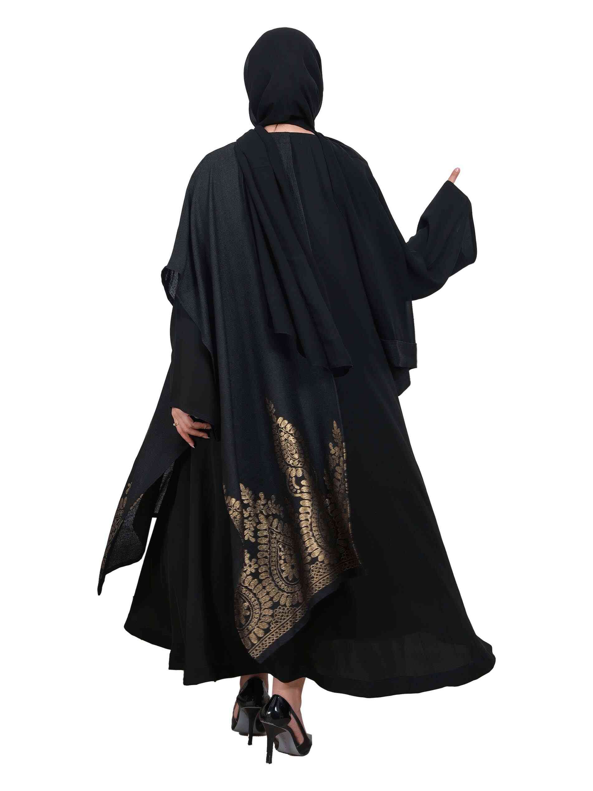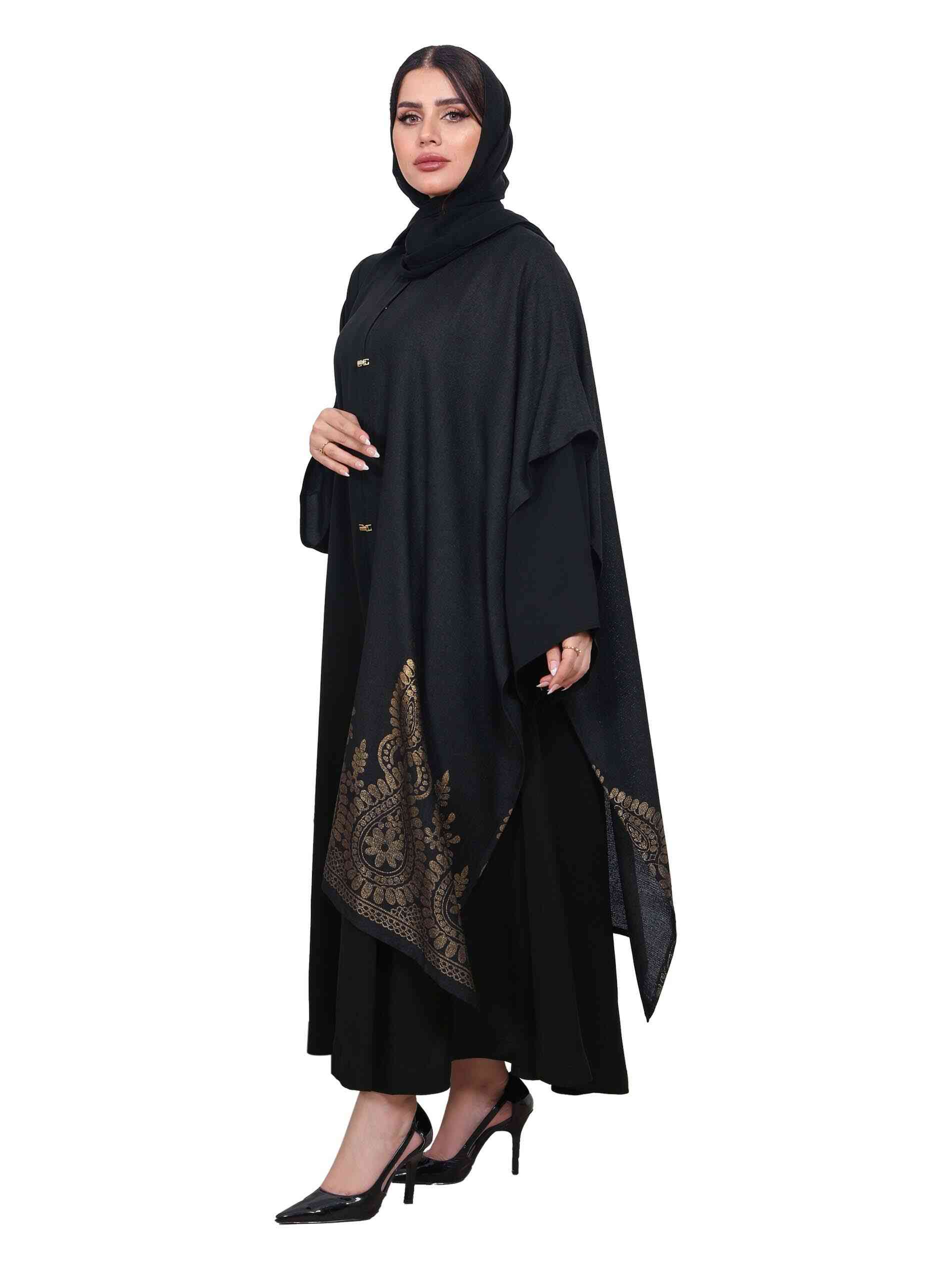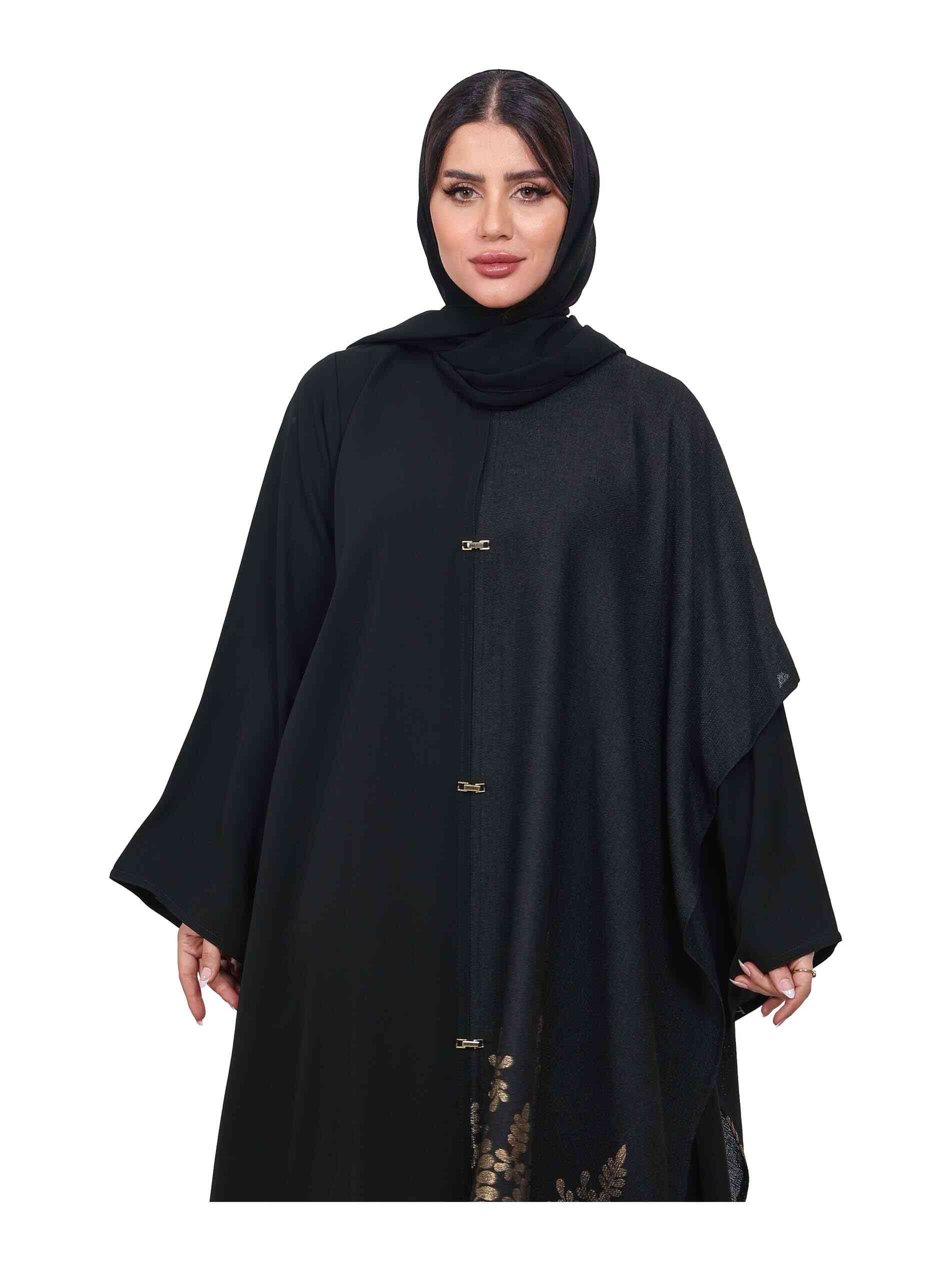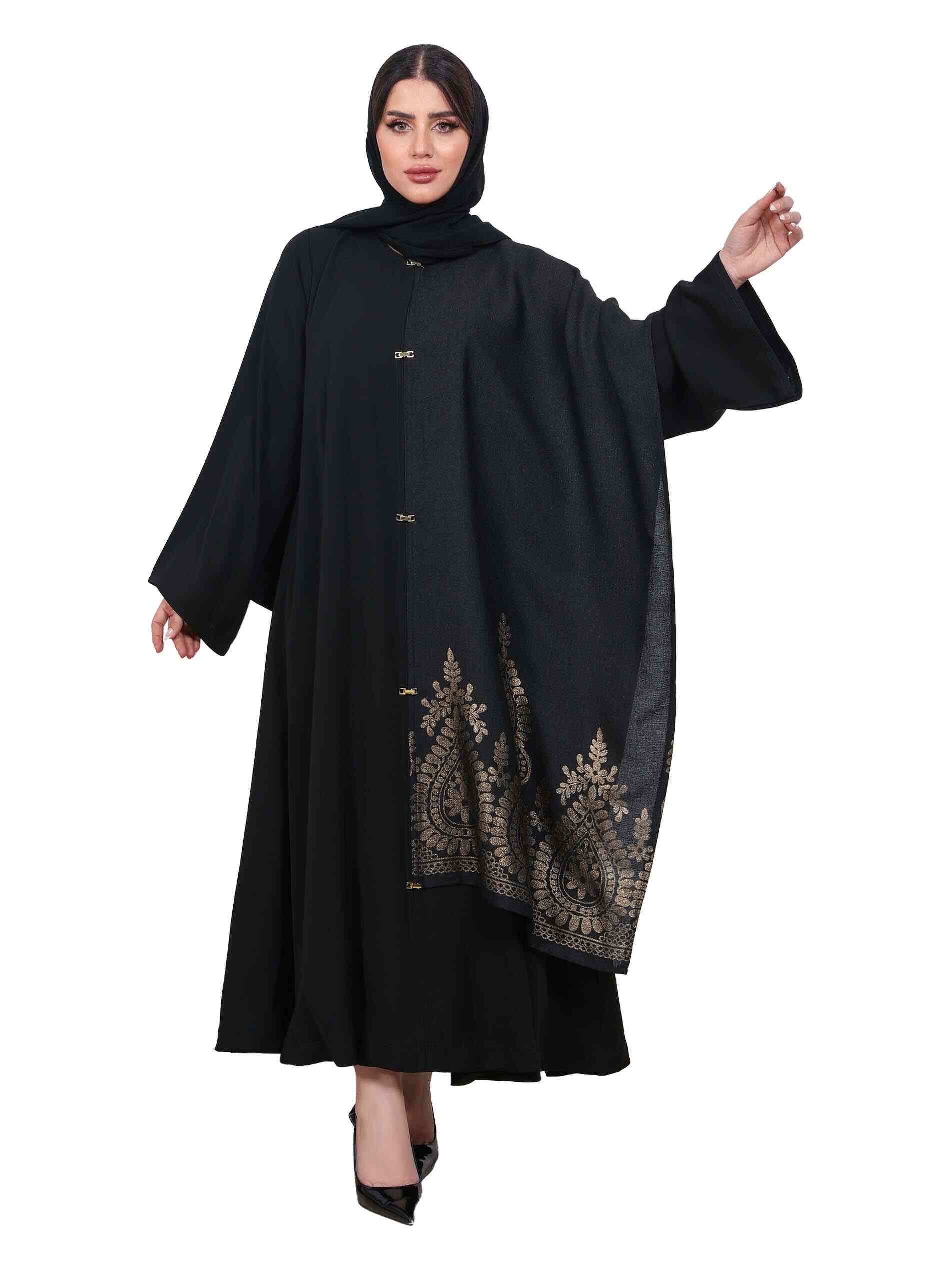 عباية مغلقة من قماش الأنترت بتطريز ذهبي لامع وأزرار فاخرة مع أكمام كاملة لاطلالة مثالية في الحفلات والمناسبات.