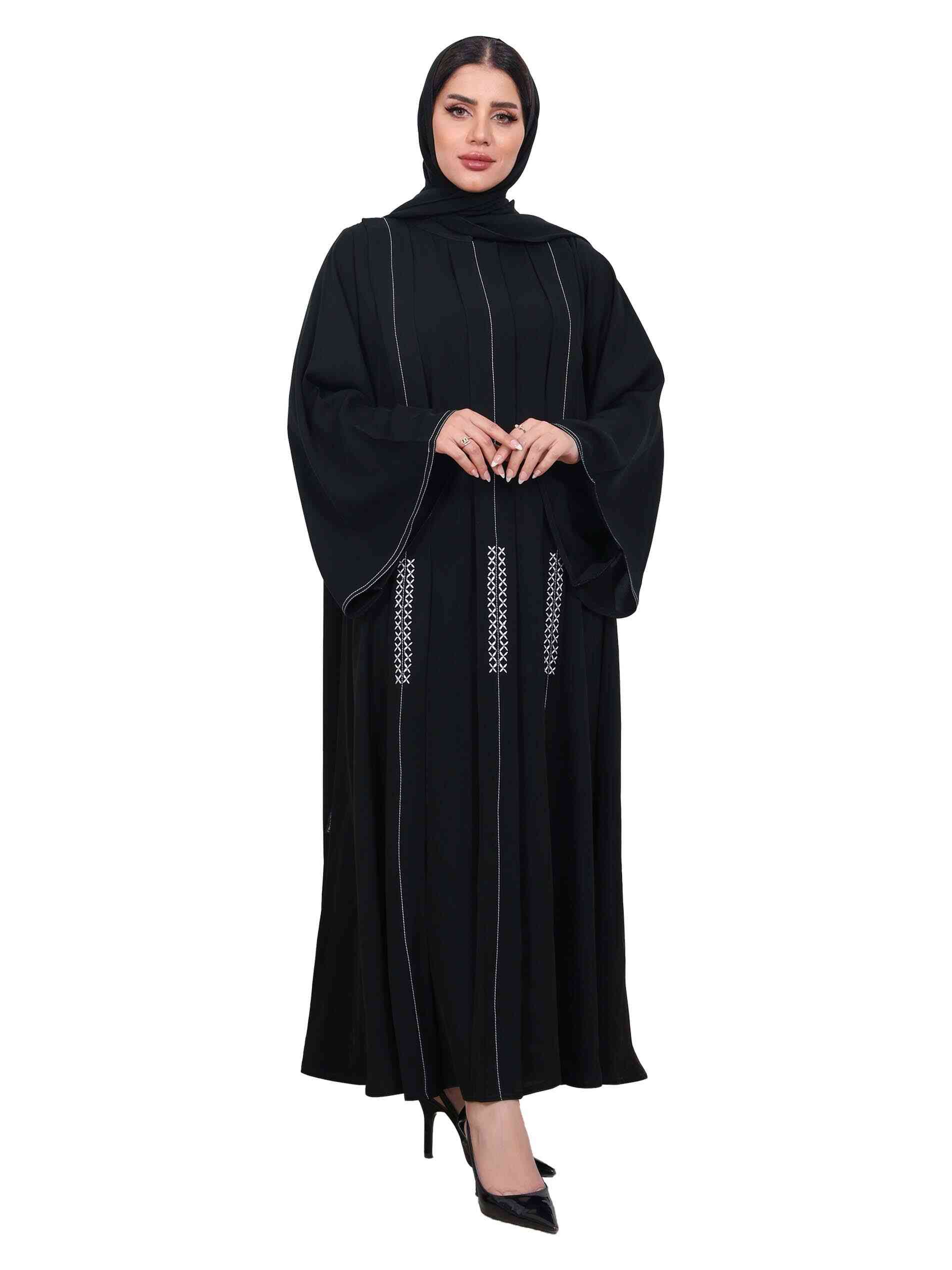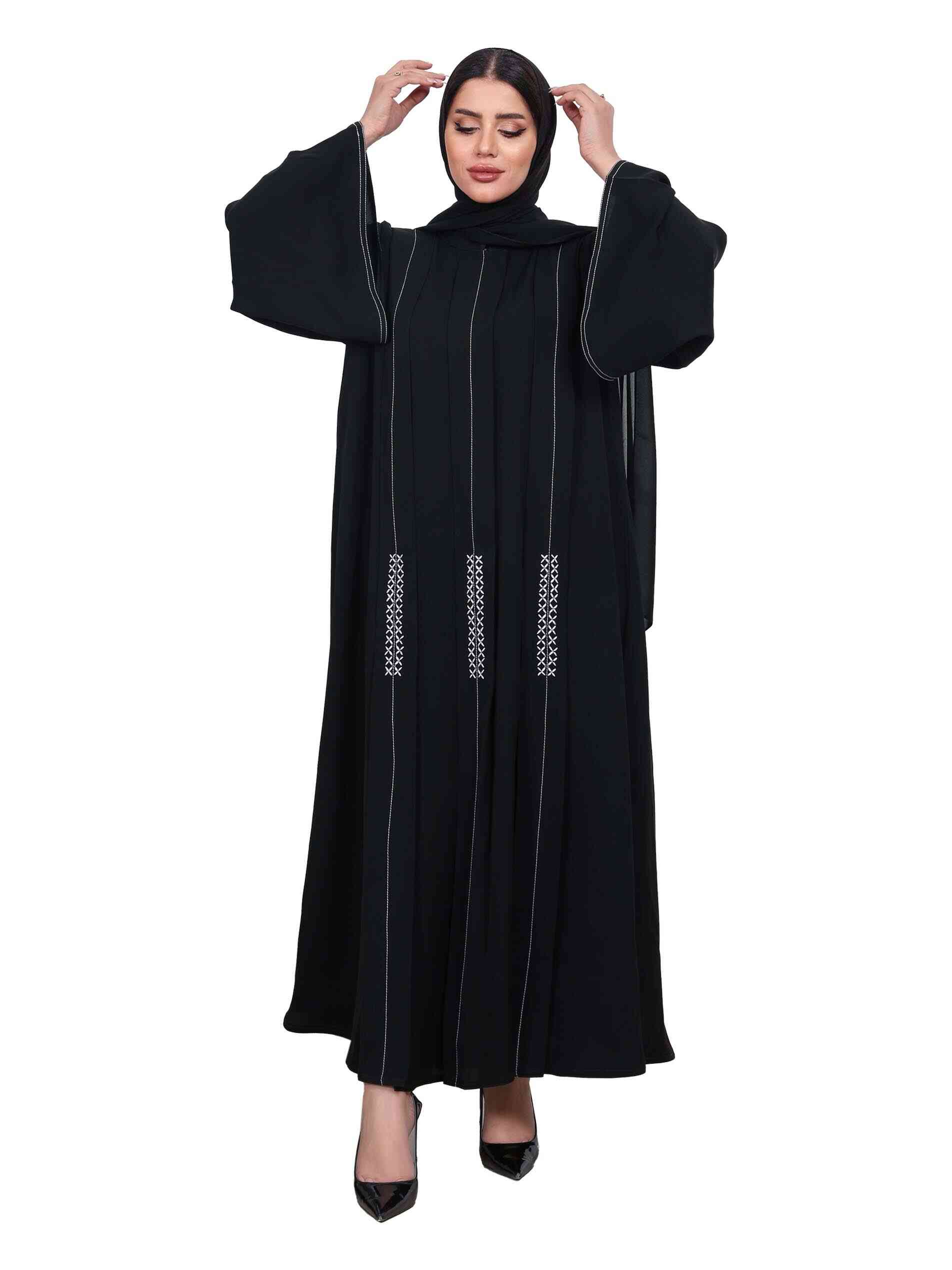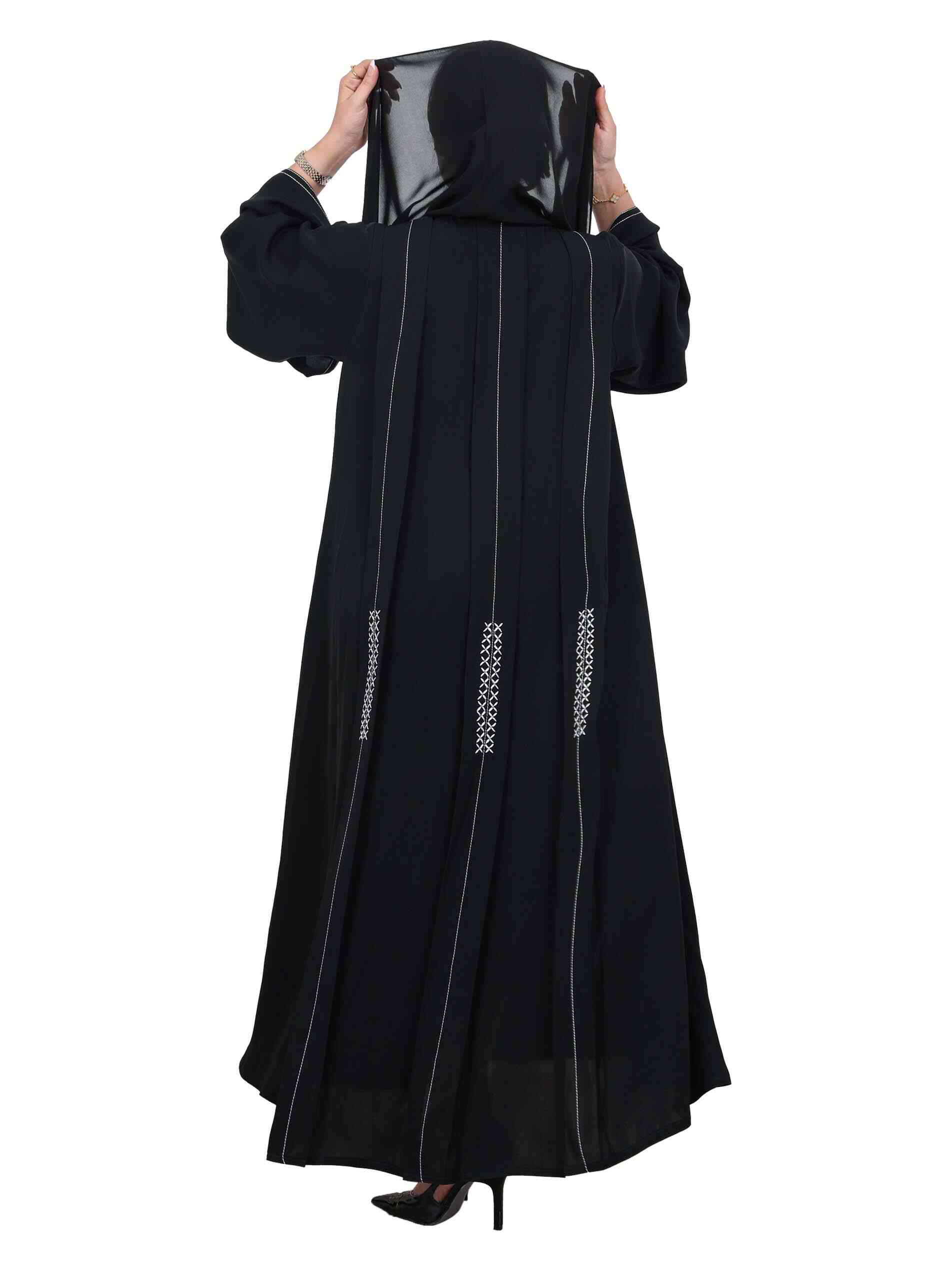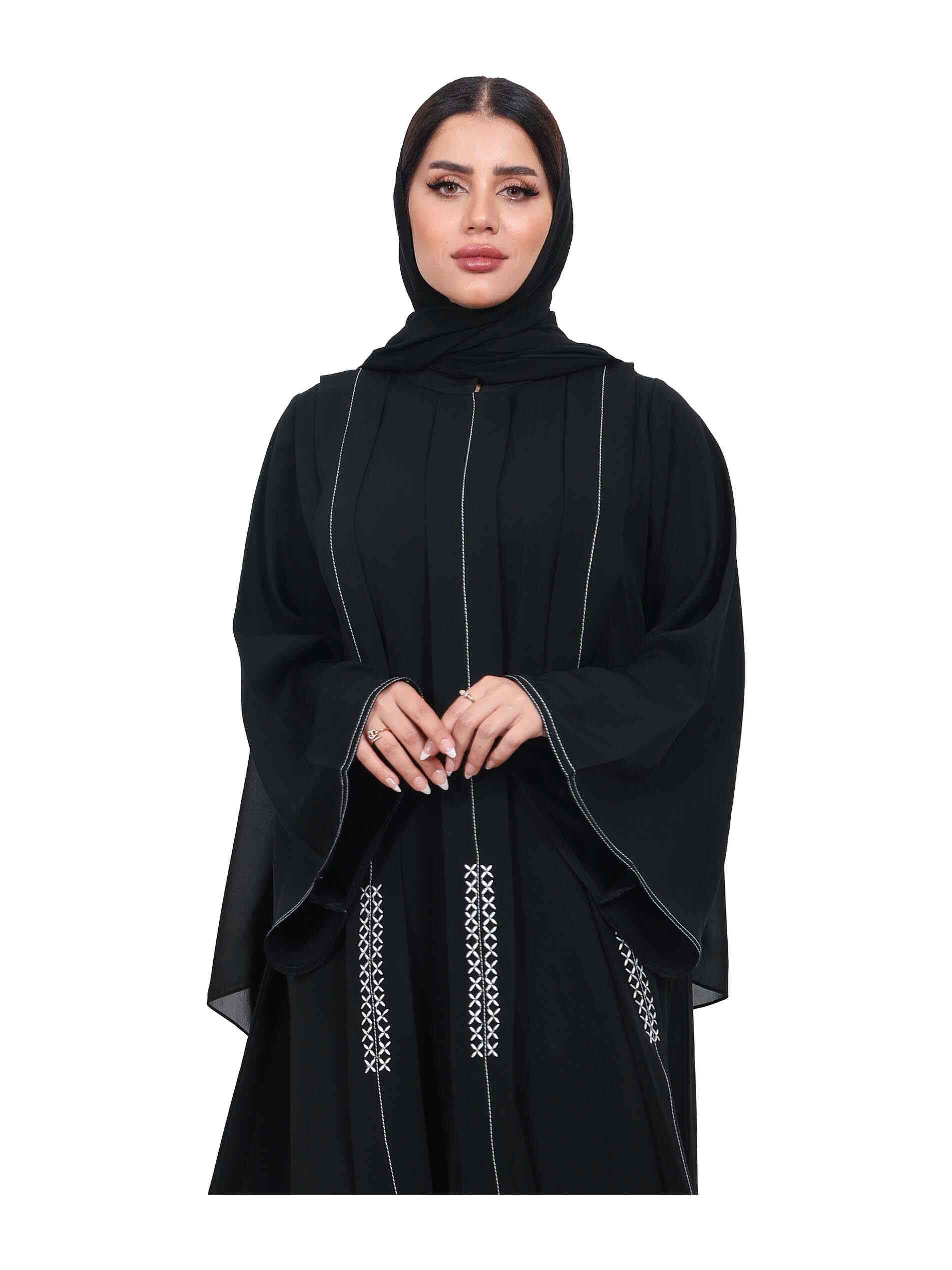 عباية سوداء اللون بطول كامل وتطريز بسيط مصممة بـأكمام طويلة وفتحة عنق مغلقة لاطلالة أنيقة.