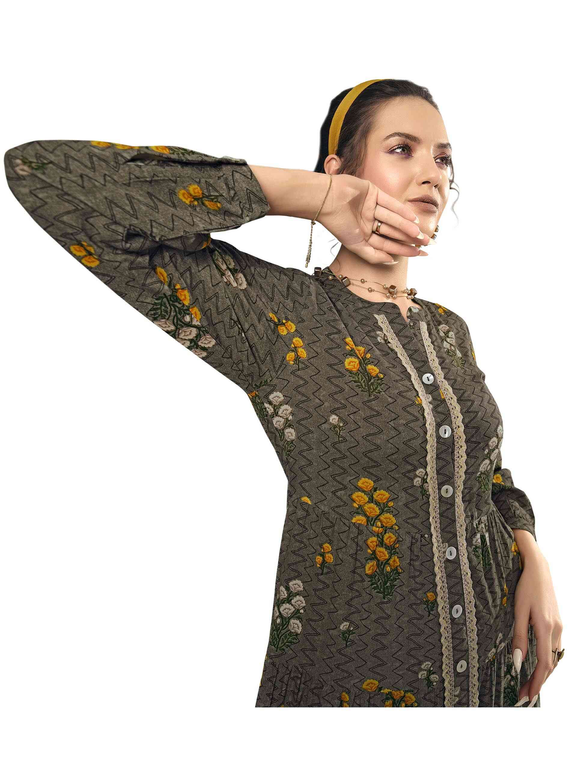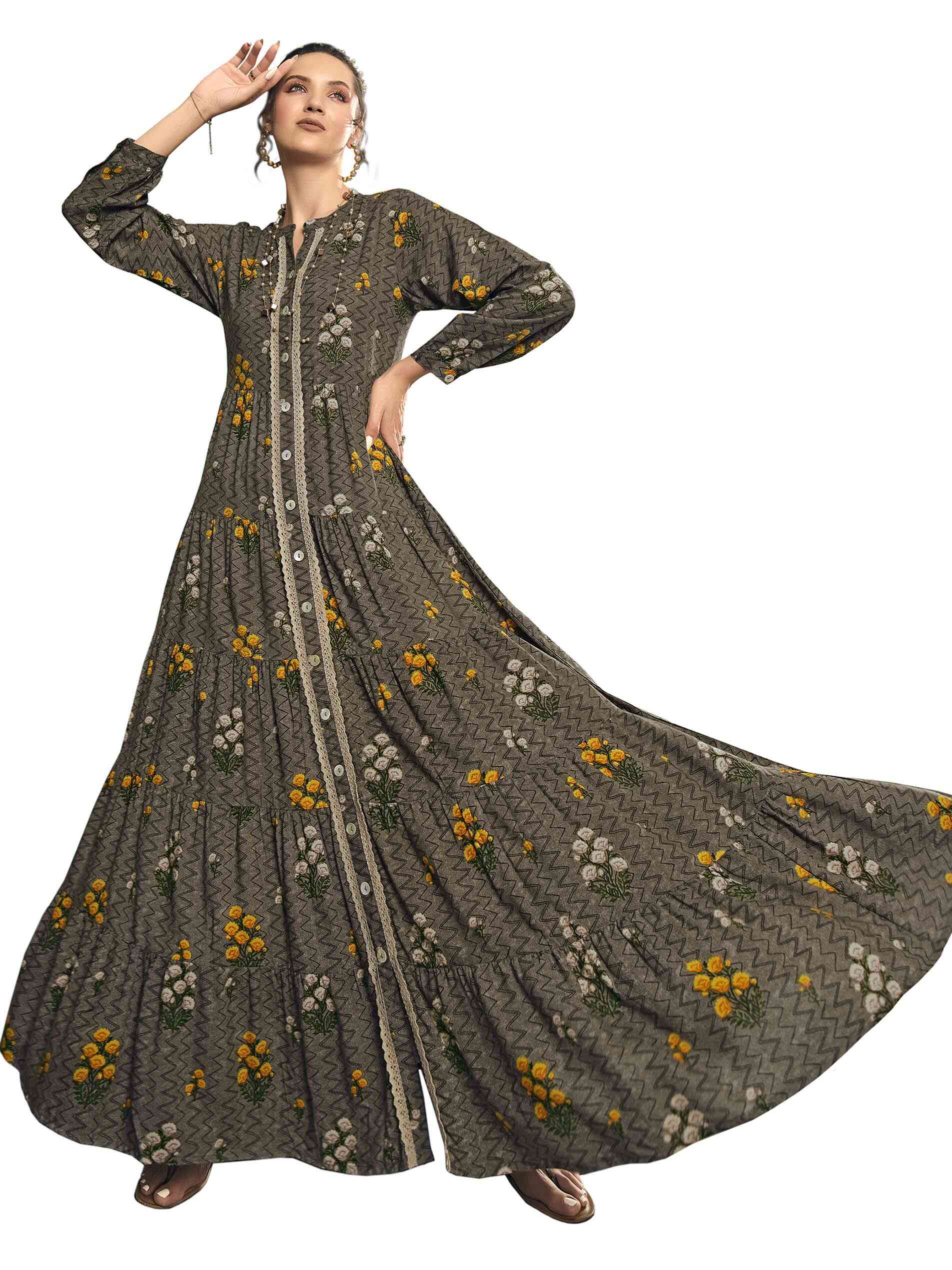 جلابية طويلة من الحرير الصناعي البني مع طبعات متعرجة من الزهور البيضاء والصفراء الجميلة تنبعث منها مشاعر مبهجة مصممة بأكمام طويلة وفتحة رقبة على شكل حرف V مع رباط وأزرار أنيقة.