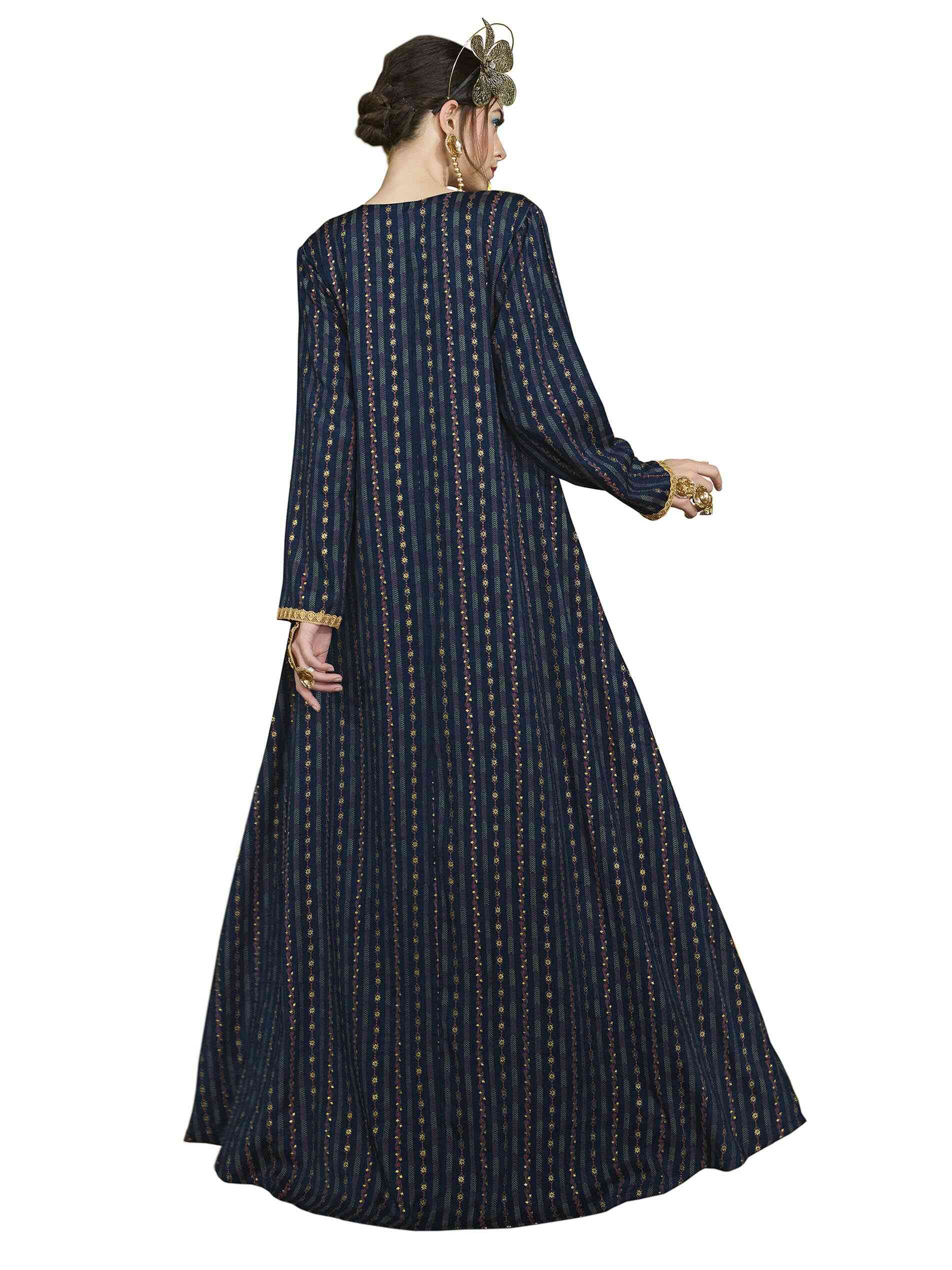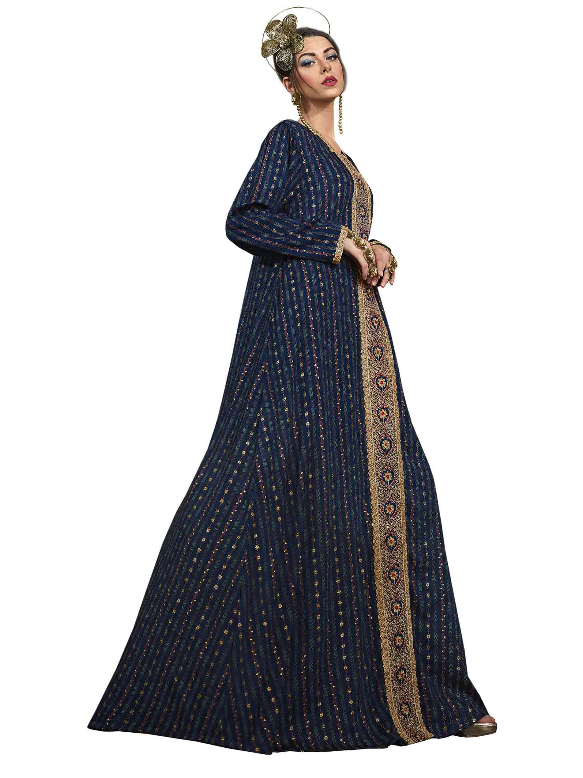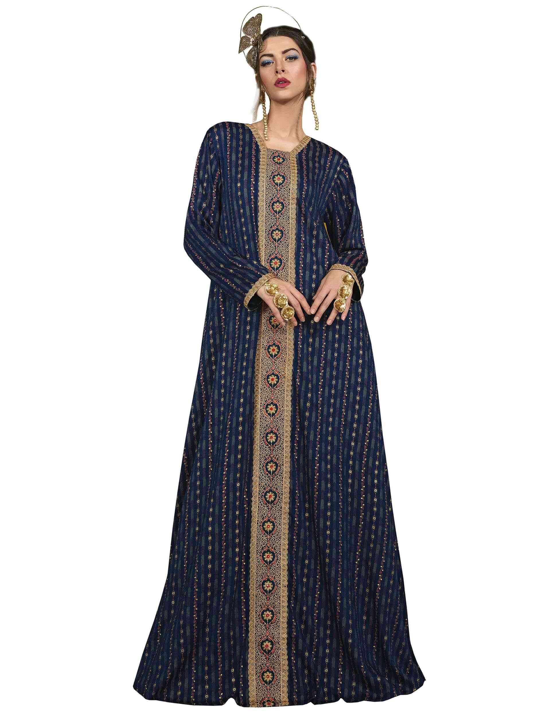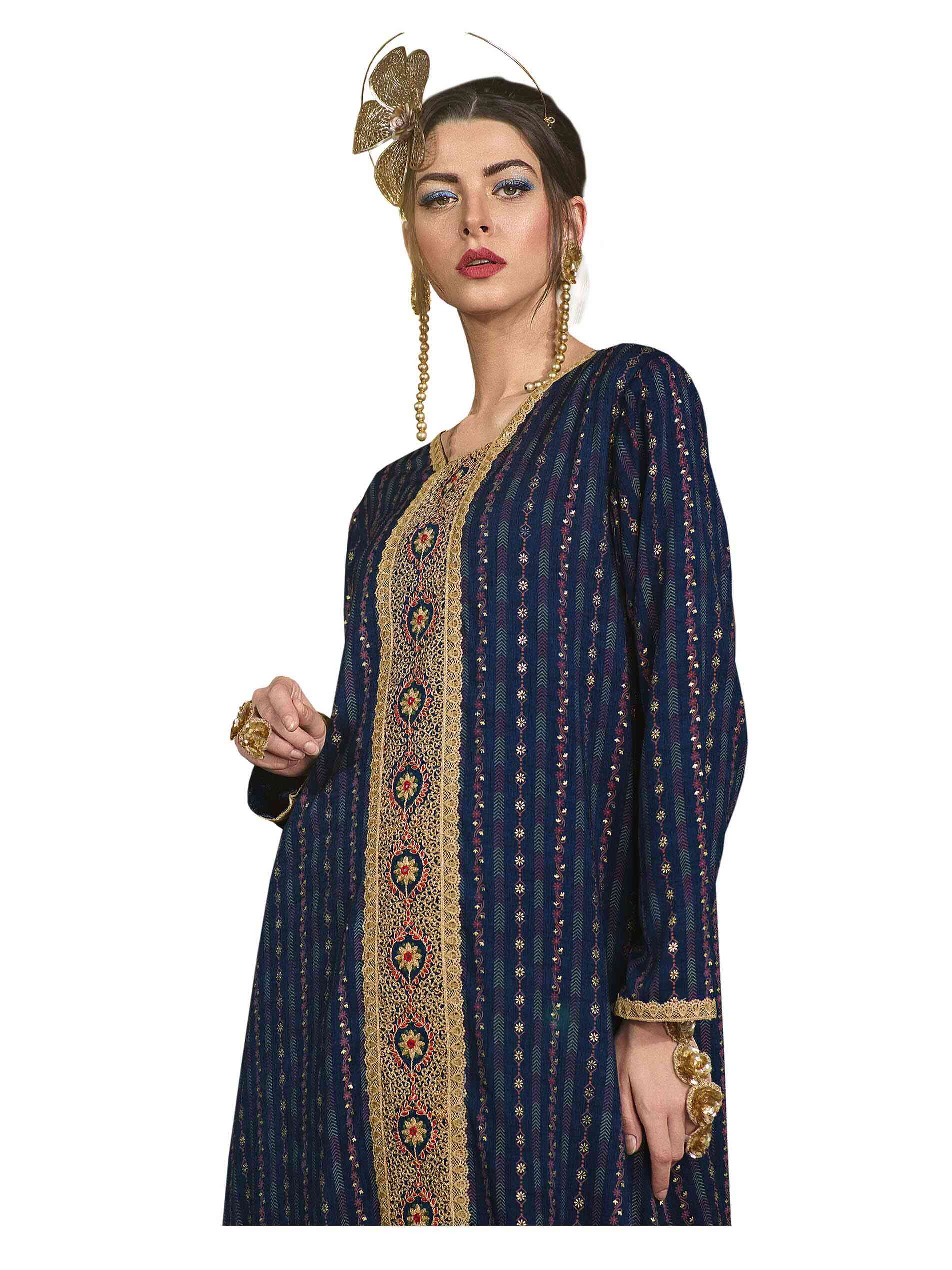 جلابية طويلة زرقاء اللون مصممة باطار ذهبي يمتد بطول الجلابية الى أسفل ومزود بطبعة الأزهار مع أكمام طويلة ورقبة مربعة لتتألقي في مناسباتك كالملكة بروح مبهجة.