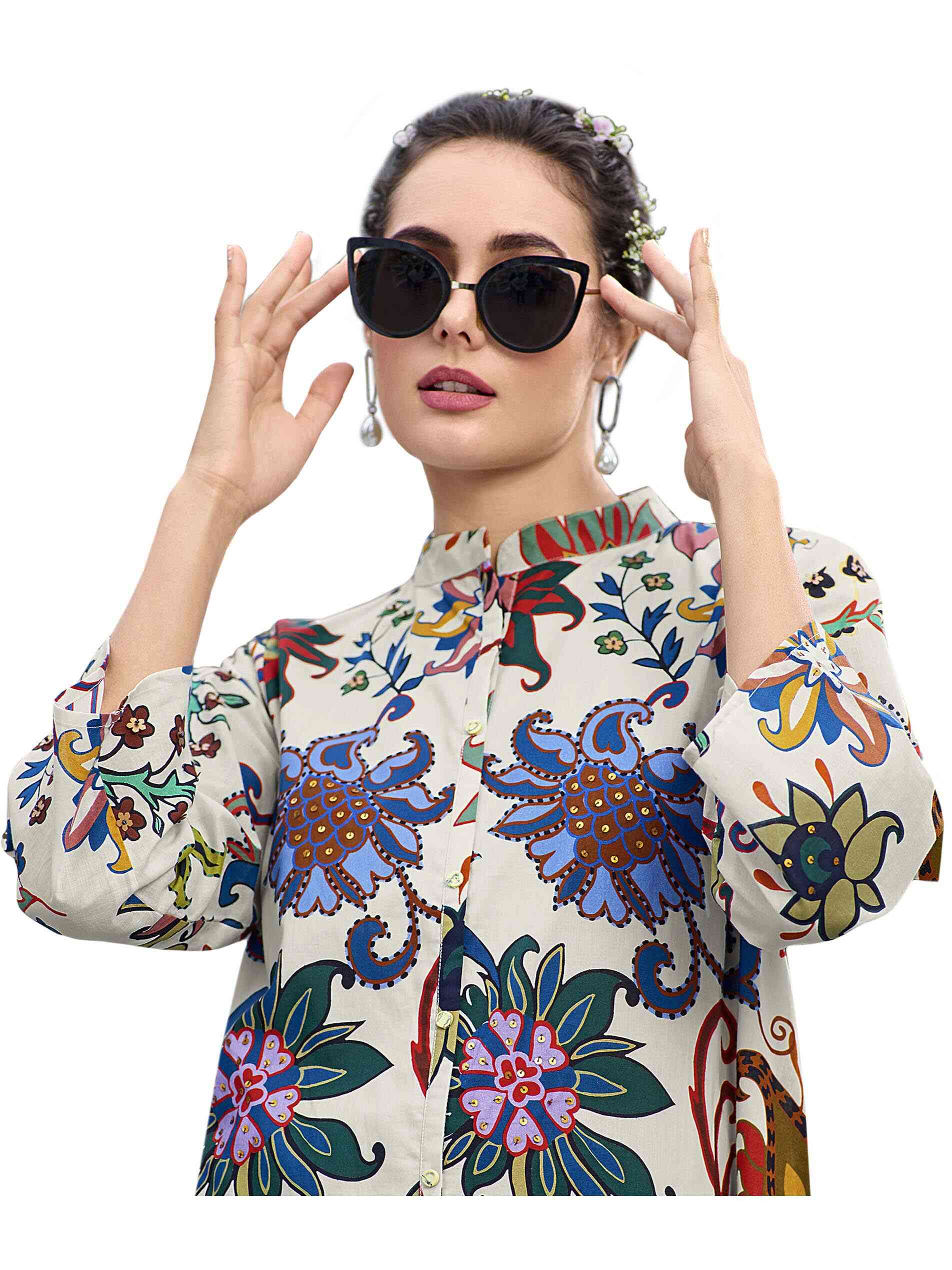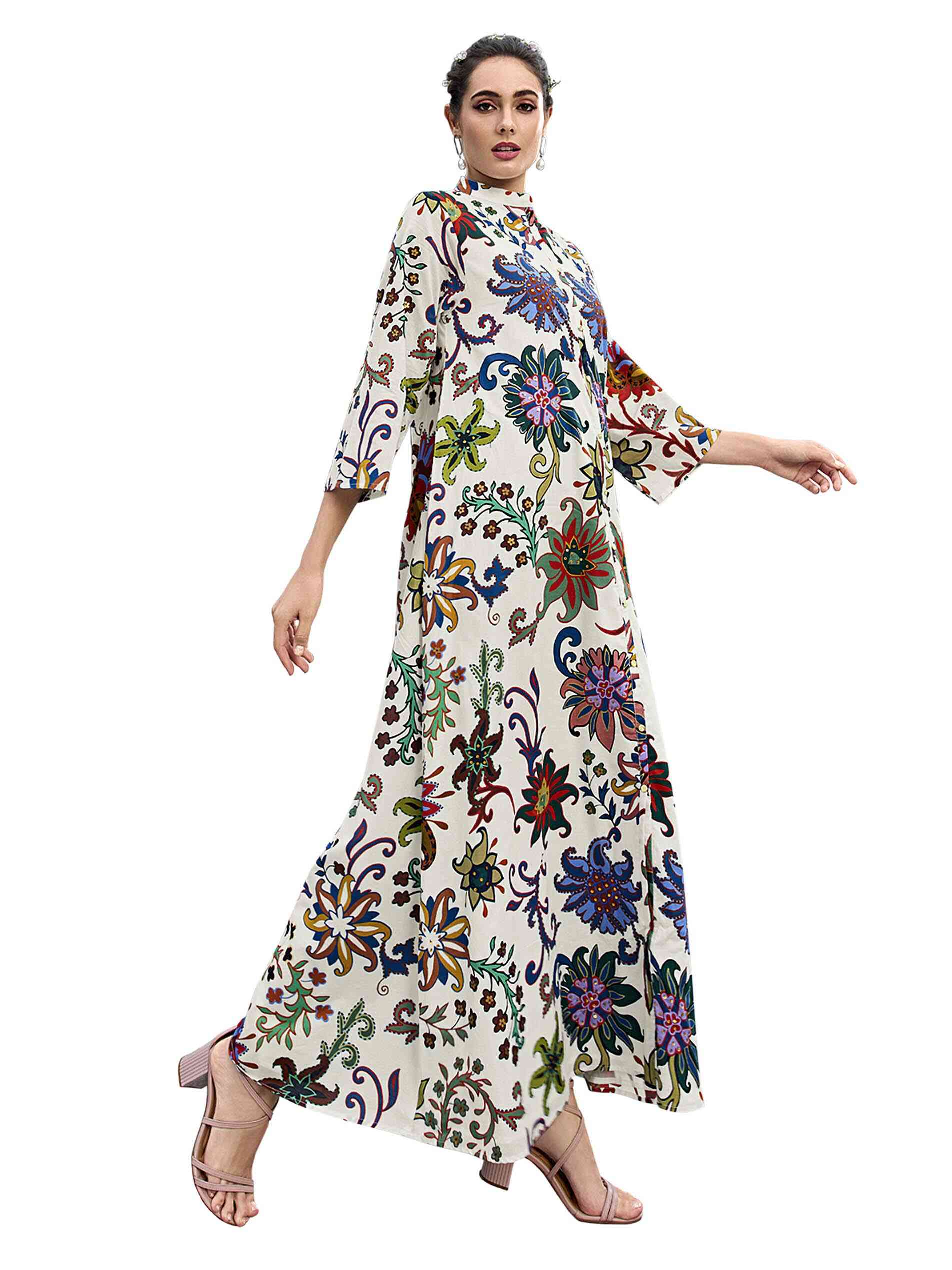 جلابية طويلة كريمية اللون مصممة بطبعة الأزهار متعددة الألوان مع أكمام 3/4 وياقة ملونة لتستمتعي بألوان البهجة.