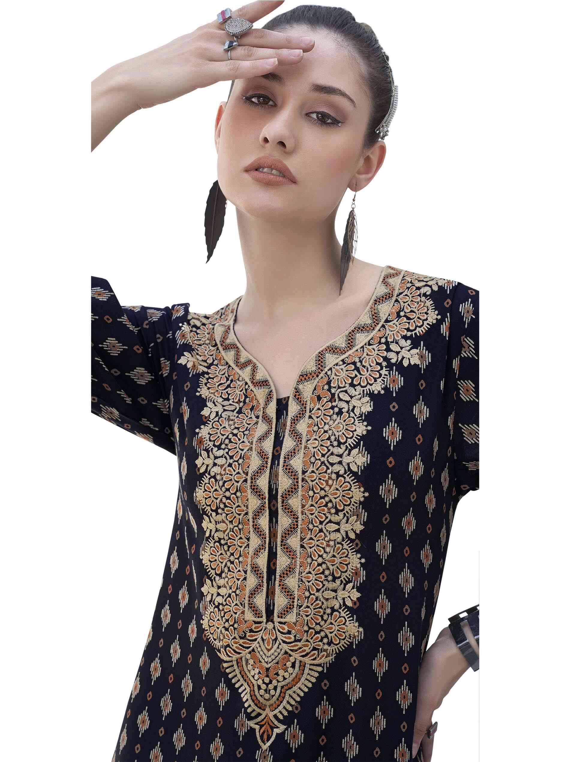 جلابية منقوشة من البوليستر / الرايون / القطن سوداء اللون مع أكمام طويلة وفتحة رقبة على شكل حرف V مصممة من الدانتيل باللون الكريمي ودرجات البني والذهبي لتمنحك الشعور بالراحة في فصل الصيف.