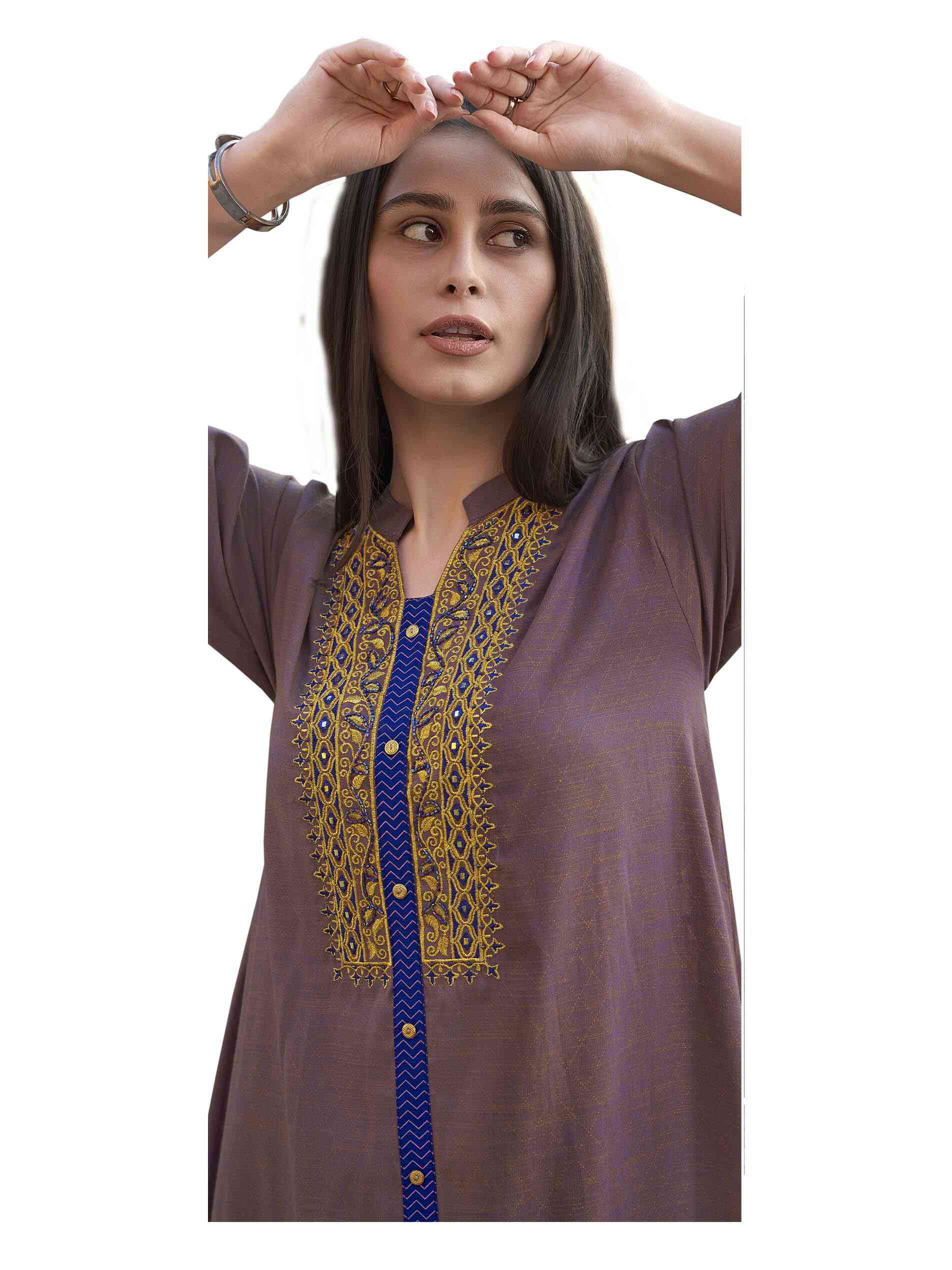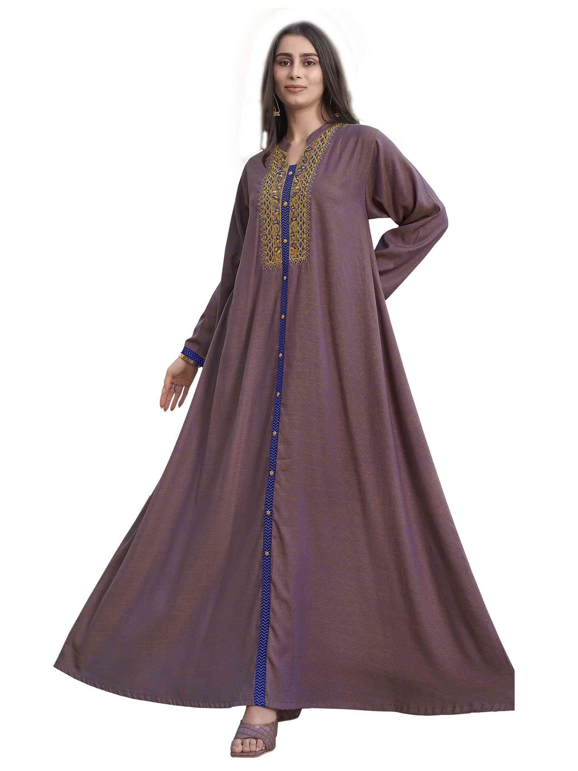 جلابية بتصميم واسع وطويل ملونة باللون الأرجواني مع أكمام طويلة وطية صدر مطرزة باللون الذهبي وينسدل منها شريط مخطط وملون باللون الأزرق مع أزرار ذهبية تكمل أناقتك.