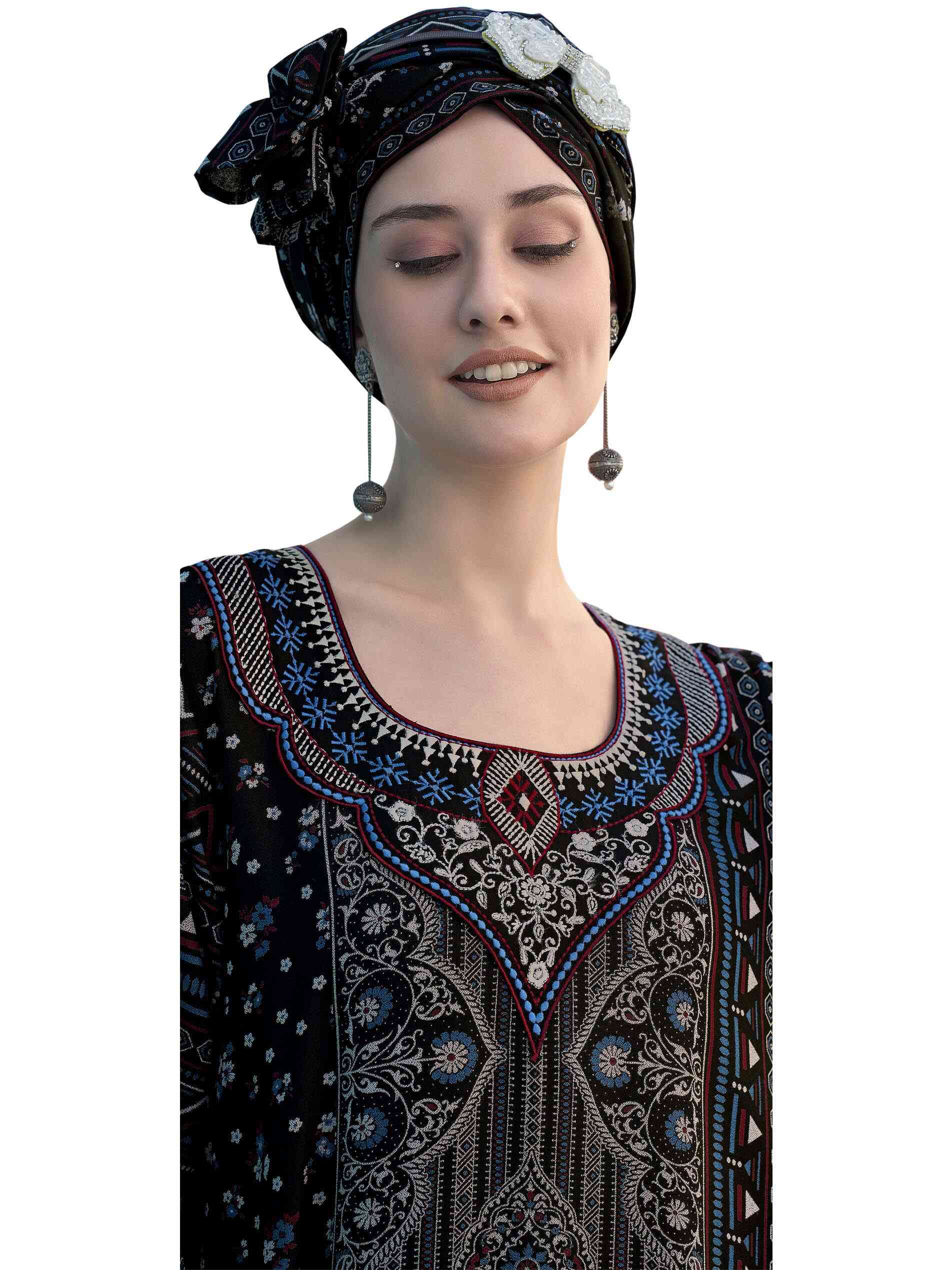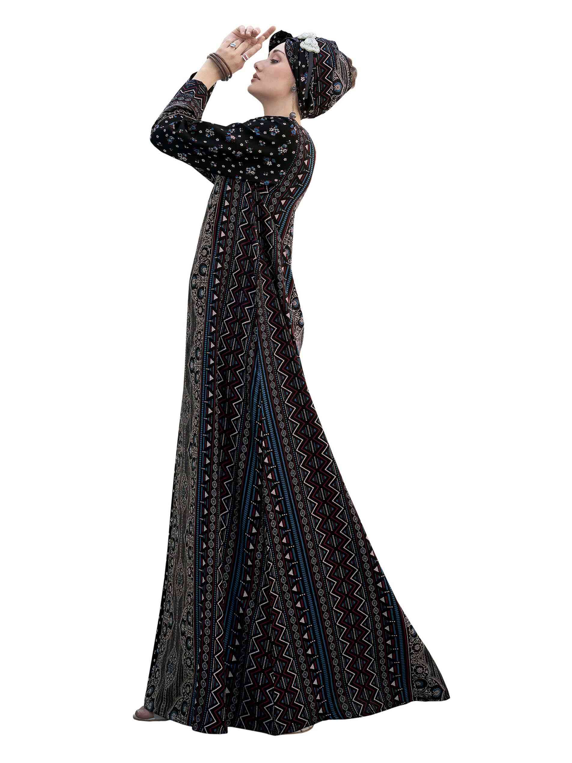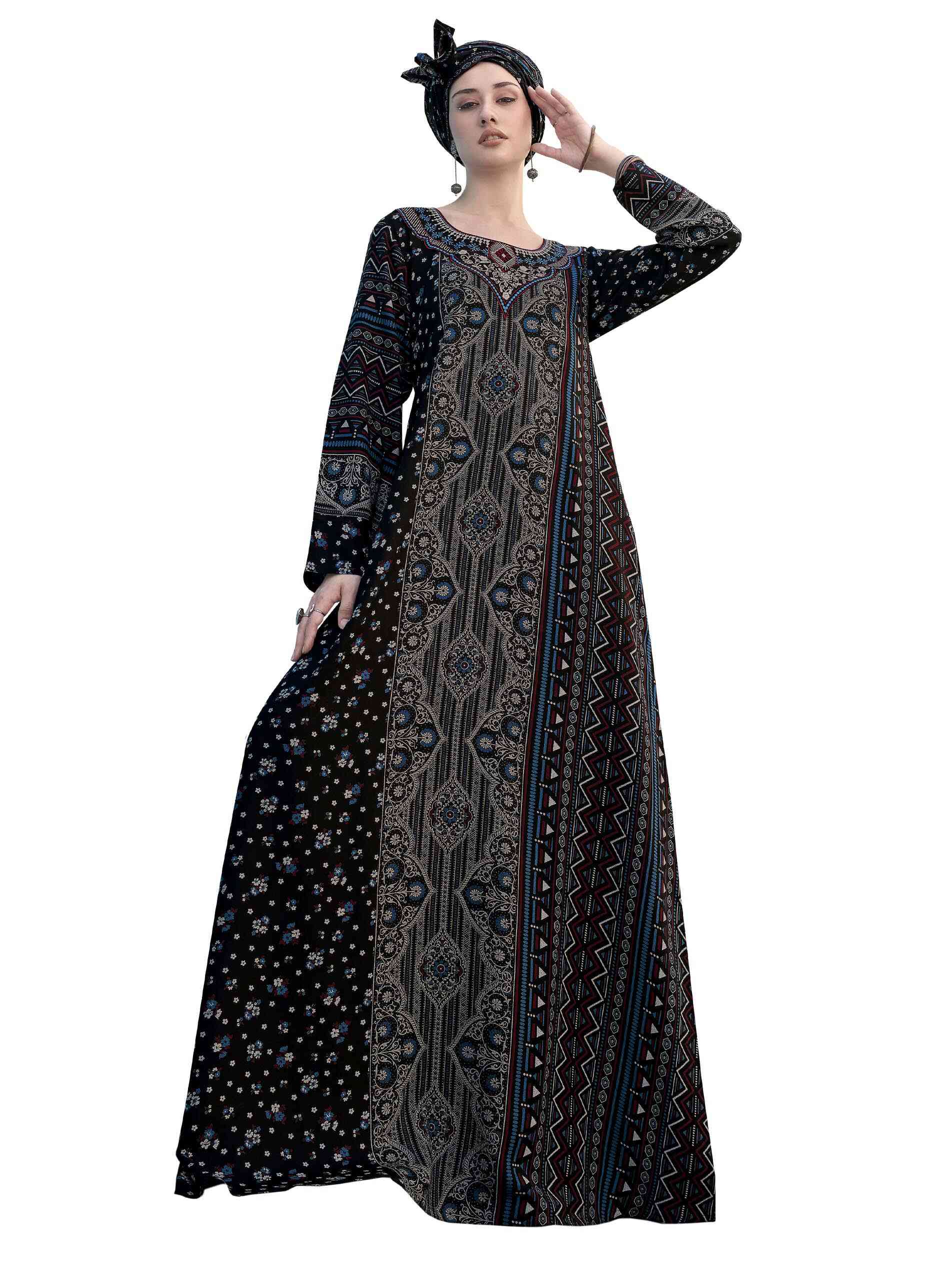 جلابية سوداء اللون من البوليستر والرايون والقطن بتصميم طويل من مزيج الزهور والأشكال الهندسية يتخللها خطوط وتصاميم عربية باللون الأحمر والأزرق والأبيض مع أكمام طويلة ورقبة مستديرة لاطلالة مبهجة في الصيف.