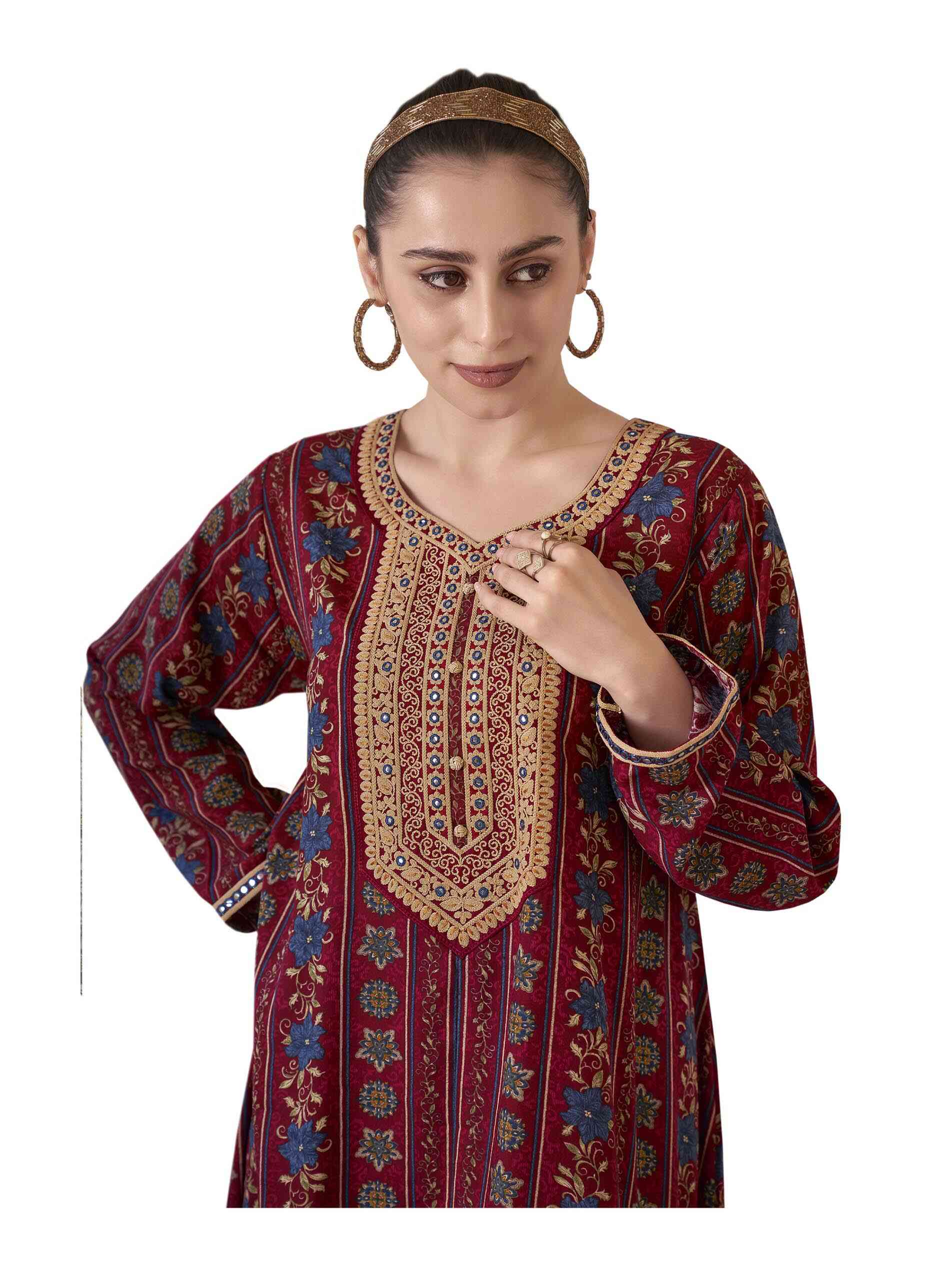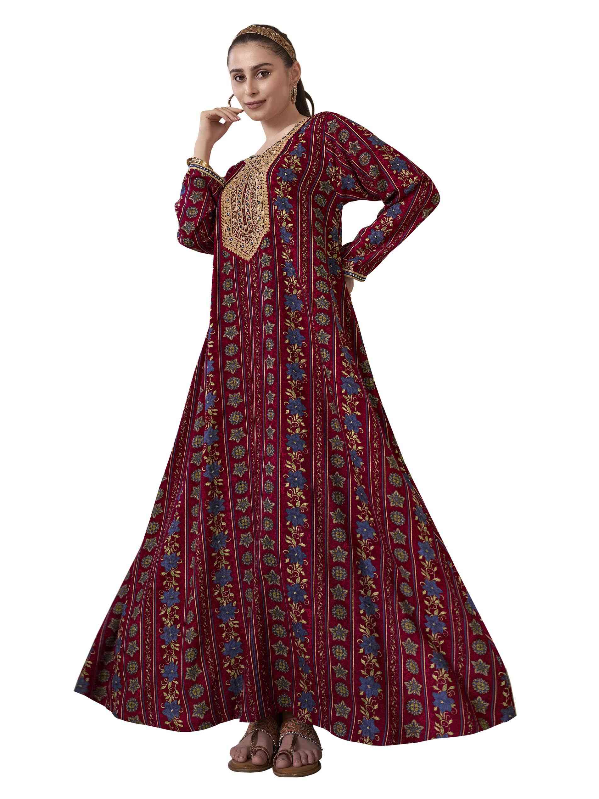 جلابية طويلة وواسعة مصممة بنقشة الأزهار الزرقاء وملونة باللون الماروني مع أكمام طويلة وتطريز على الصدر باللون الذهبي لاطلالة صيفية رائعة.