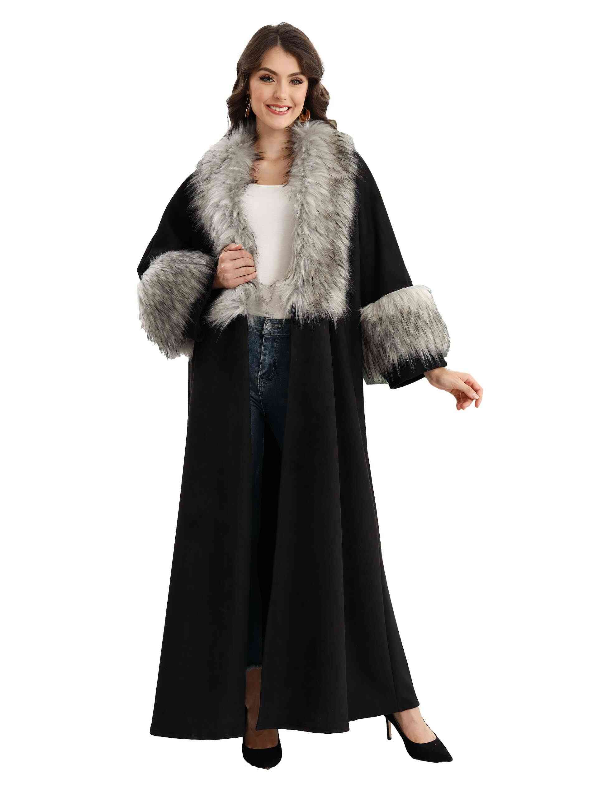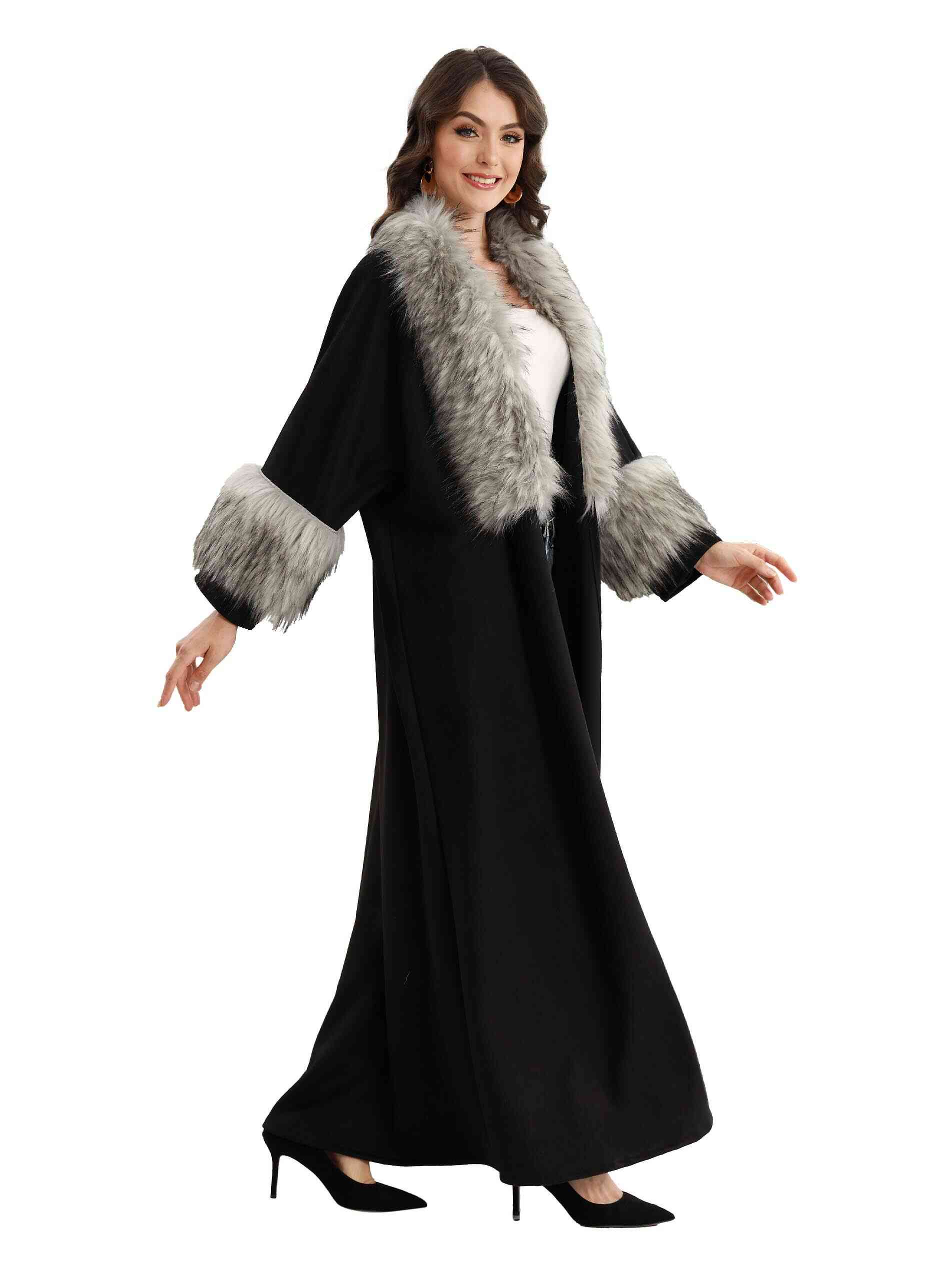 استقبلي الشتاء بأجواء تتناغم مع ذوقك بارتدائك جلابية سوداء طويلة مصممة من الفرو مع أكمام طويلة تنتهي بحدود من الفرو أيضاً لابراز مزاجك الشتوي.