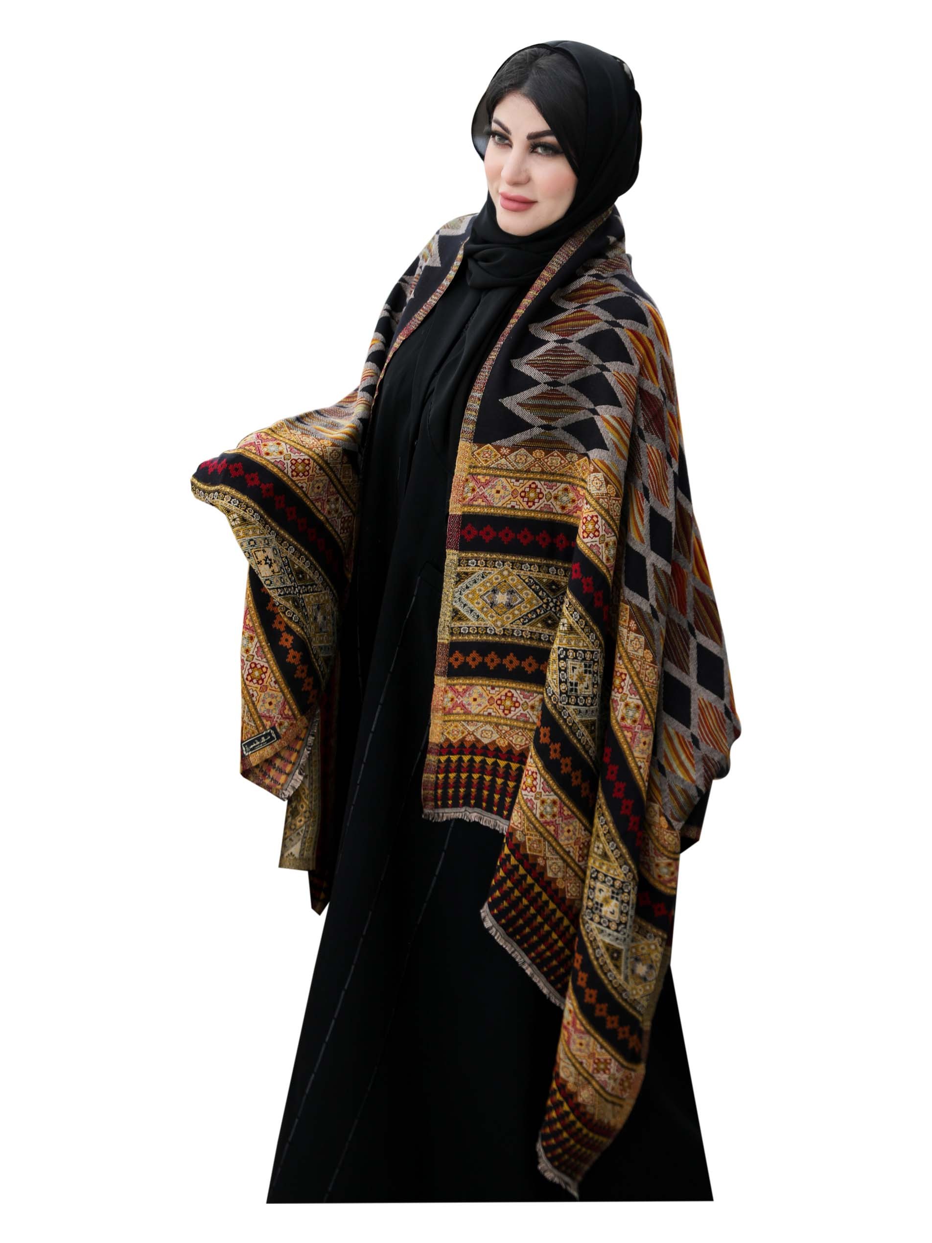 شال كشميري بطبعات متنوعة وألوان تتنوع بين الأسود والرمادي والأصفر والأحمر مع لمسة من اللون البرتقالي.