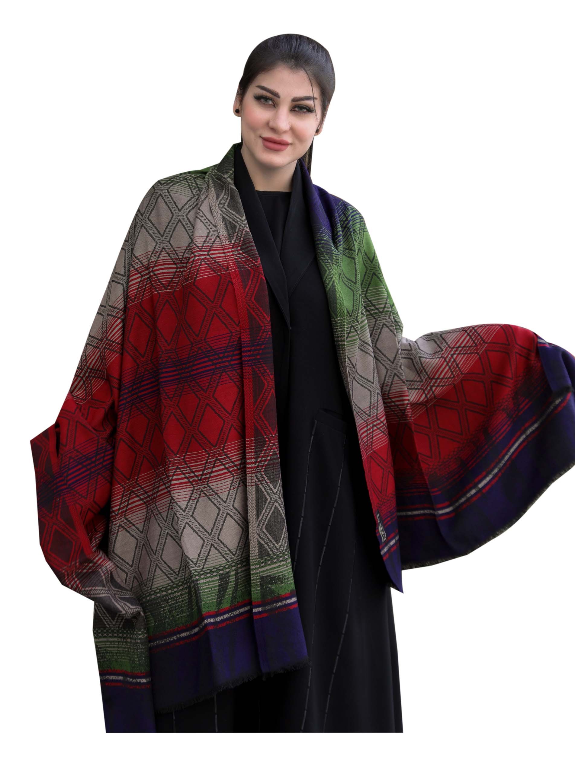 شال كشميري متعدد الألوان مصمم بطبعة هندسية مميزة ليمنحك الشعور بالتميز والدفء في الشتاء.