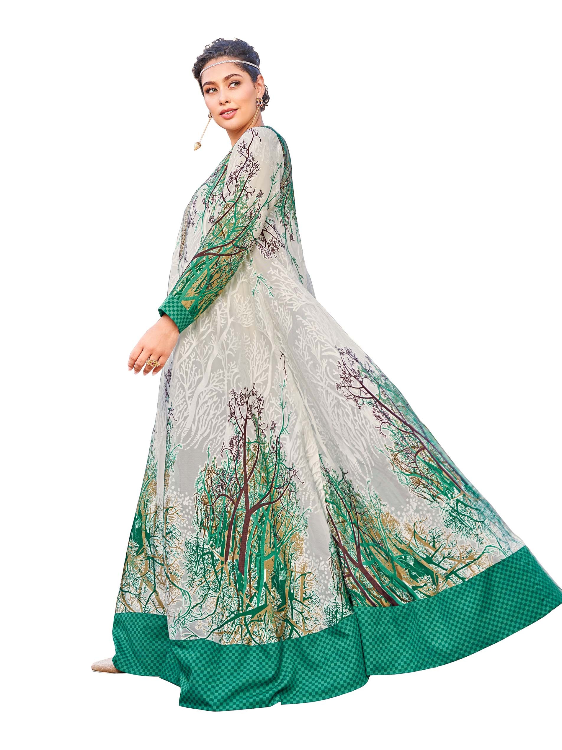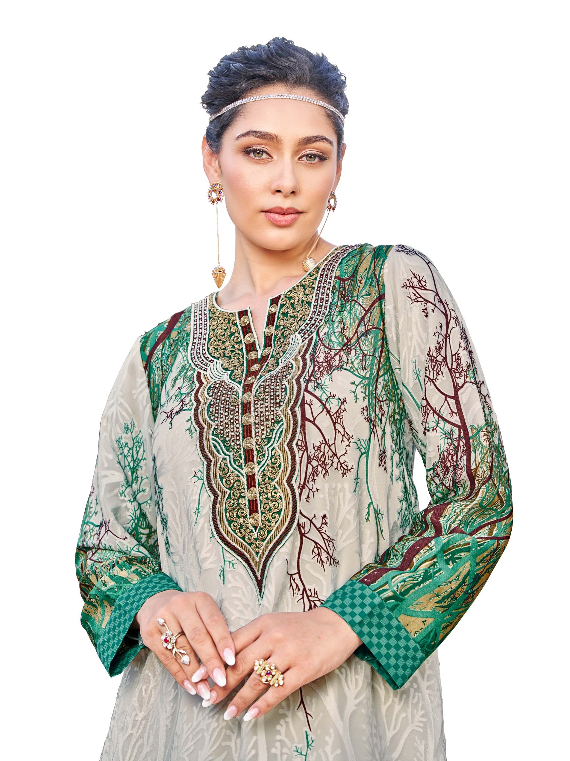 جلابية من القطن باللون السكري مزخرفة باللون الأخضر والبني والأصفر مع أكمام طويلة وتطريز مميز على الصدر يكتمل بأزرار أمامية.