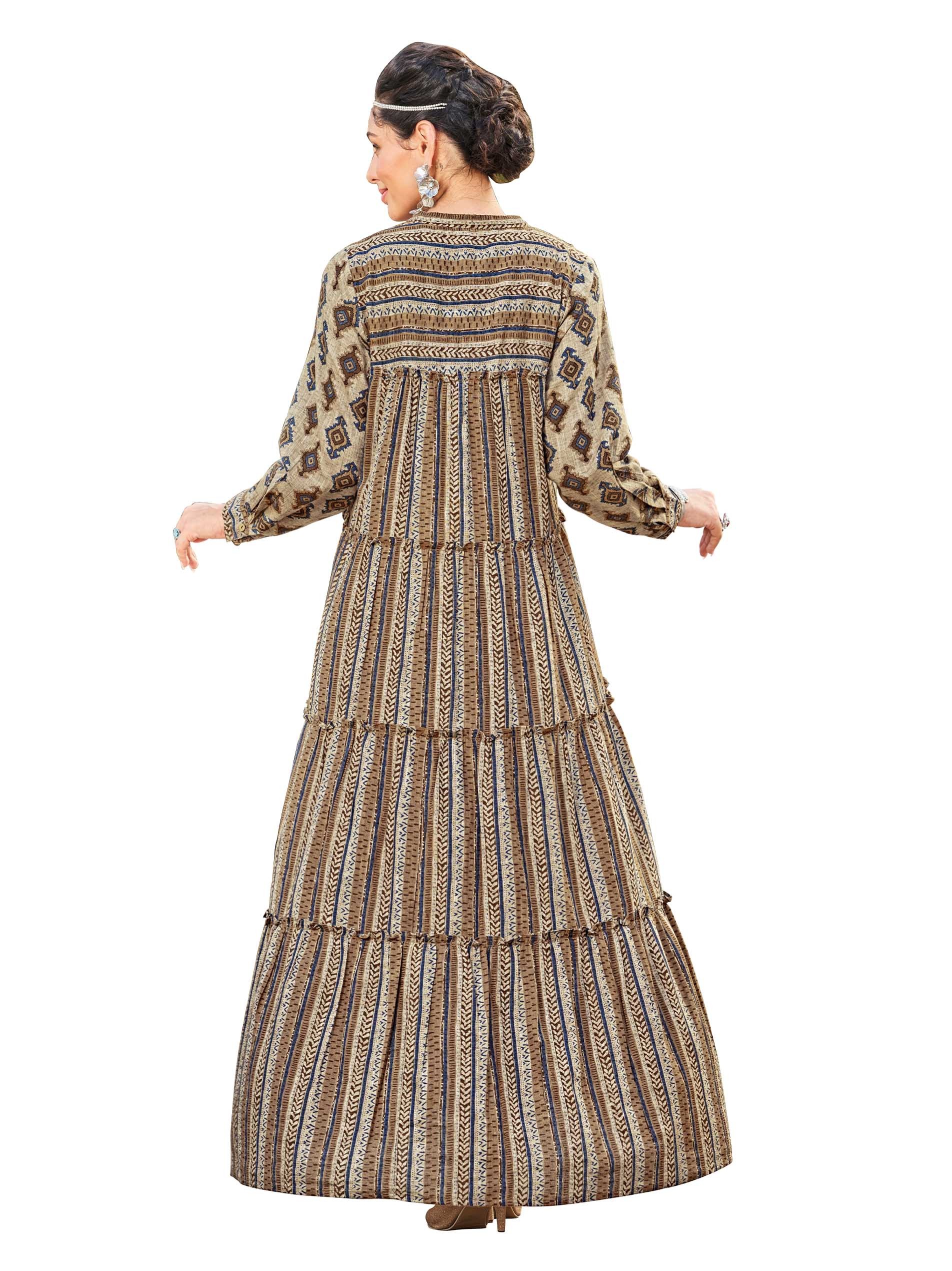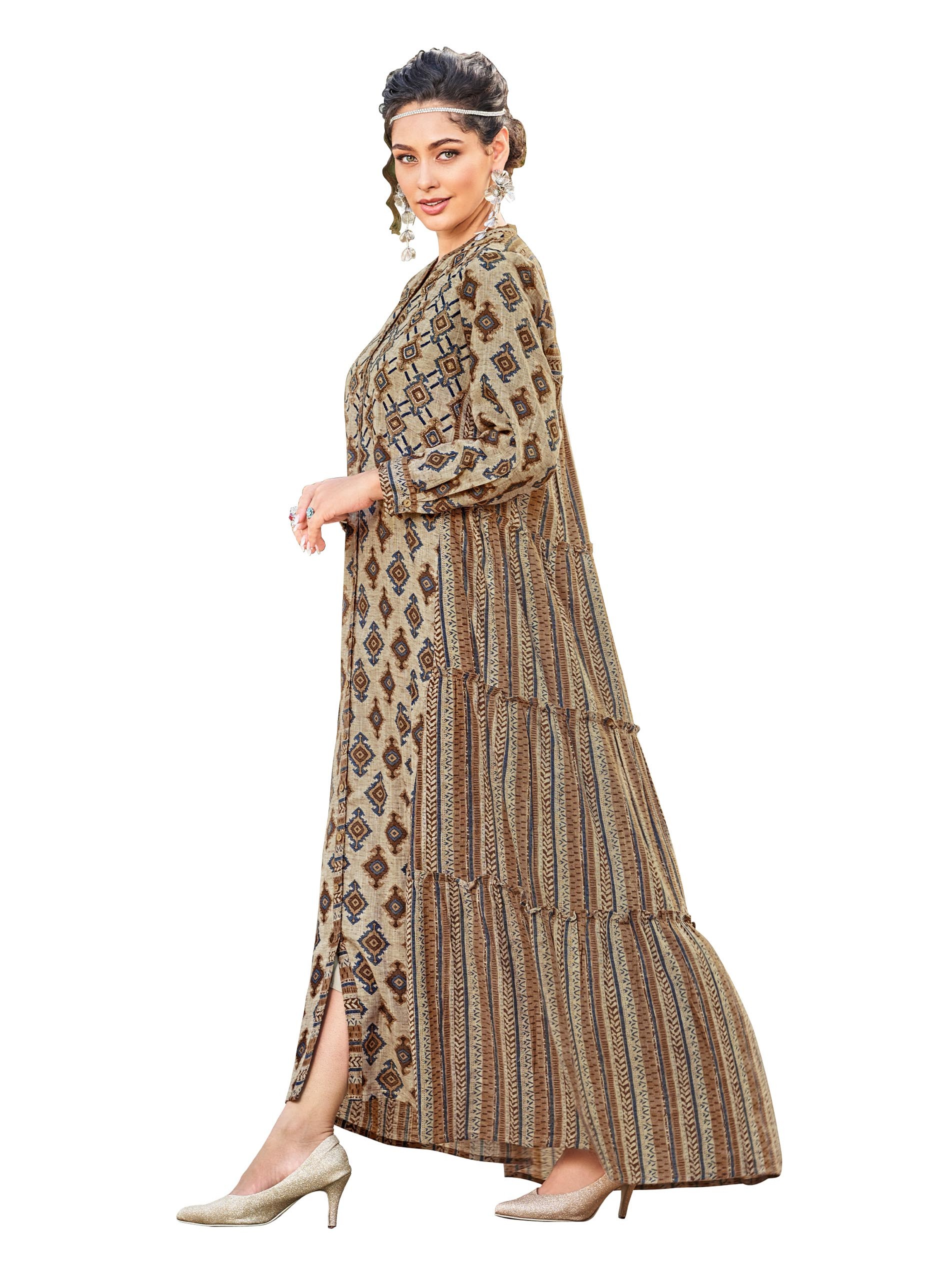 تألقي في جلابية كاجوال من القطن مصممة بدرجات متنوعة من اللون البني ومزودة بنقوشات مميزة لاكمال طلتك.