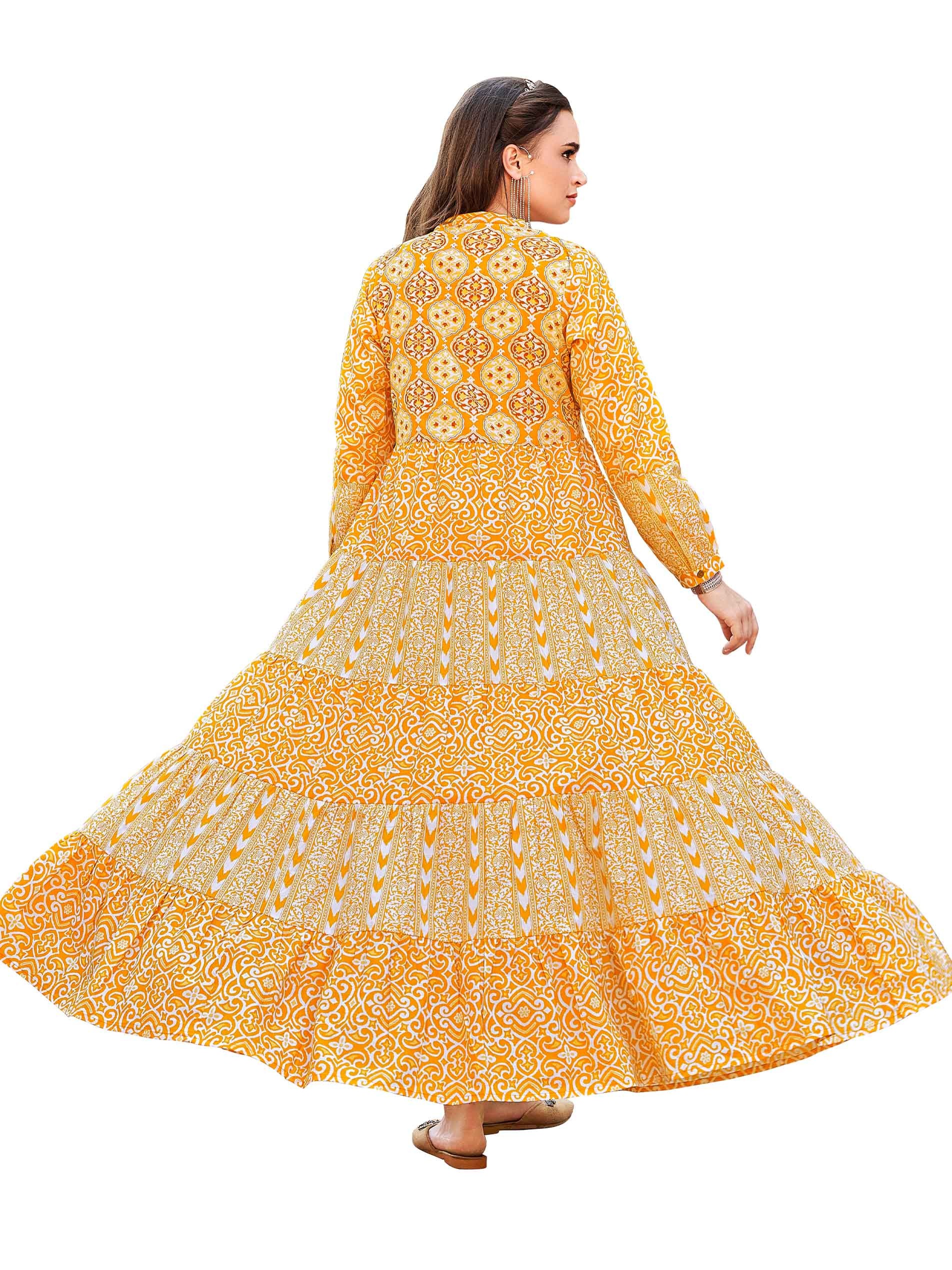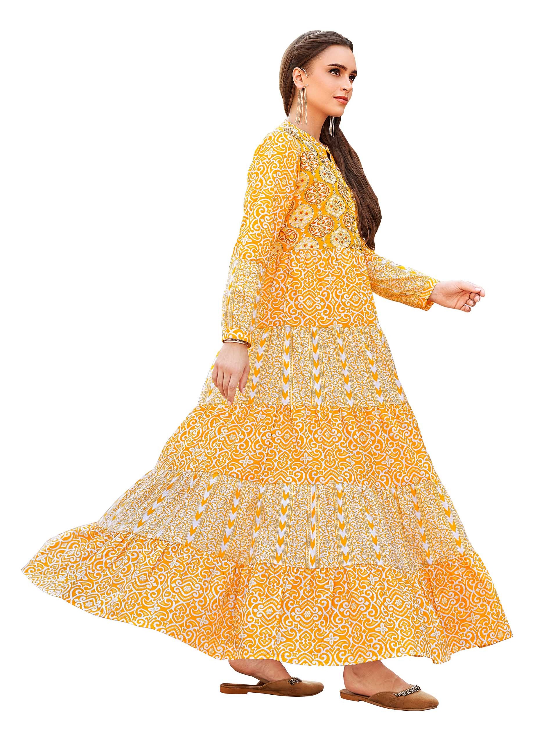 جلابية كلوش عصرية رائعة بقصة A-line مصممة باللون البرتقالي ومزودة بنقوشات بيضاء اللون مع أكمام طويلة وفتحة رقبة على شكل حرف V لتتألقي بثقة في مناسباتك.