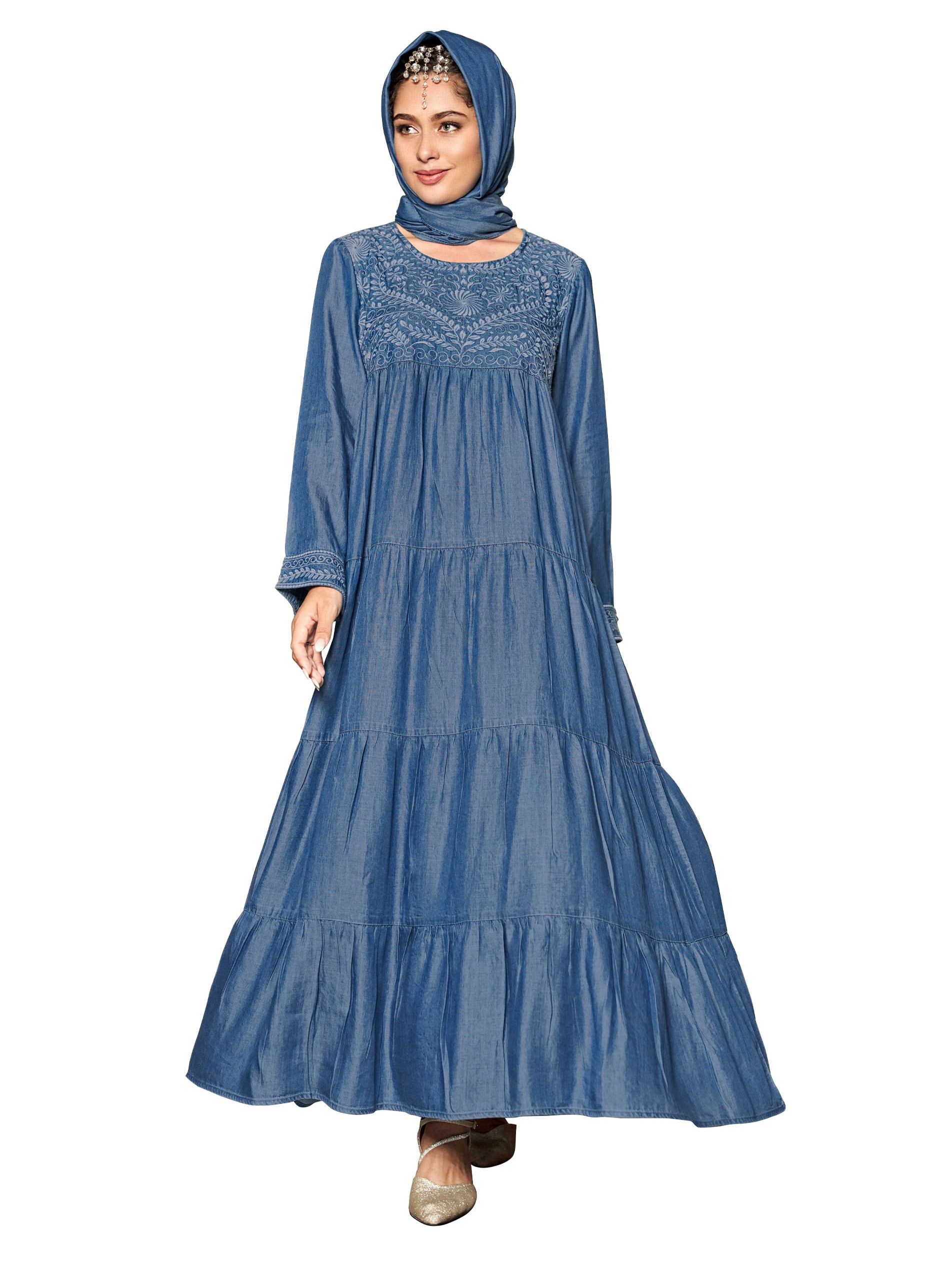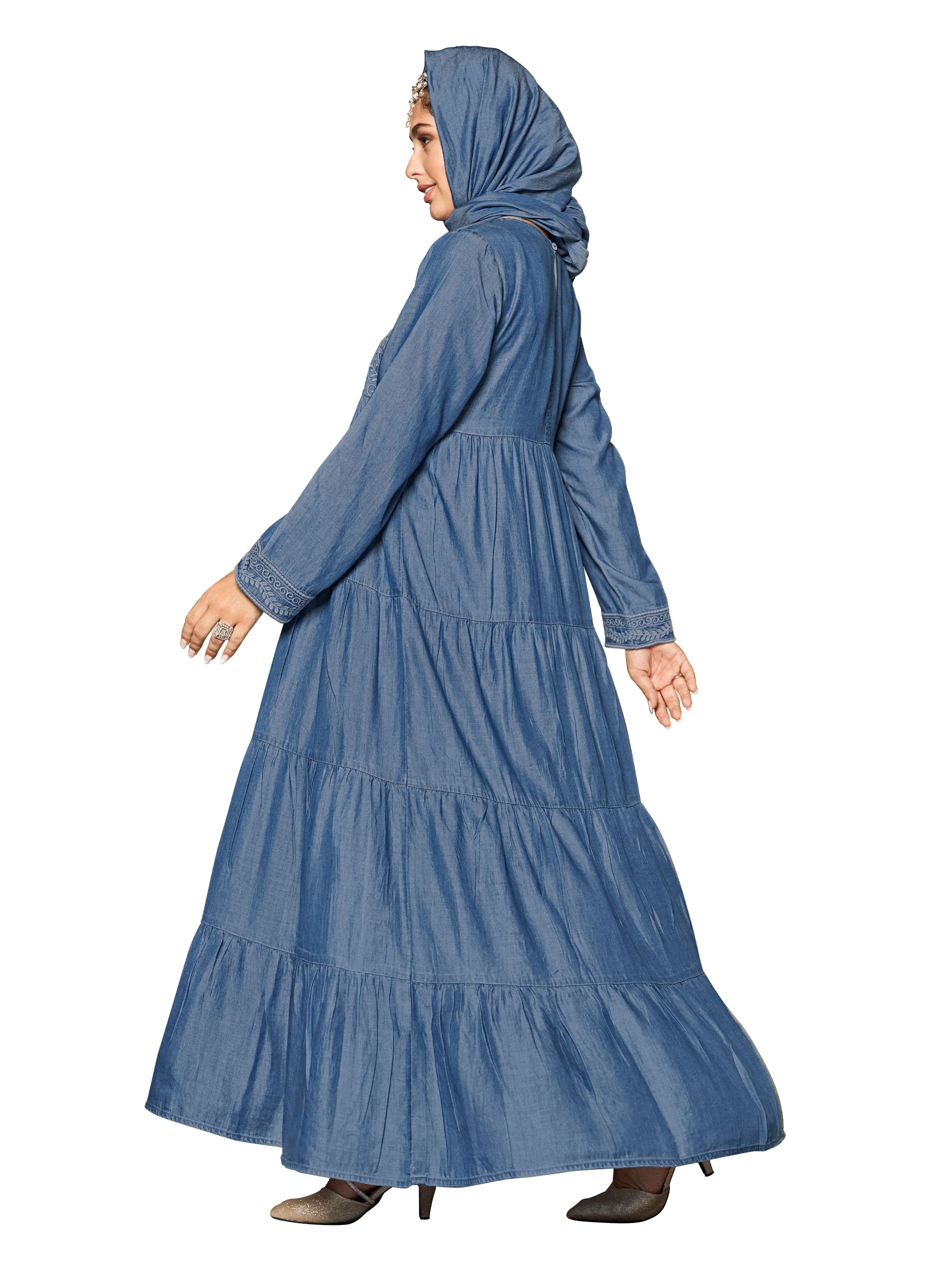 تألقي في جلابية سادة زرقاء اللون مصممة بقصة A-line مع أكمام طويلة وفتحة رقبة دائرية. ويكتمل التصميم بتطريز منقوش على الصدر باللون الأبيض