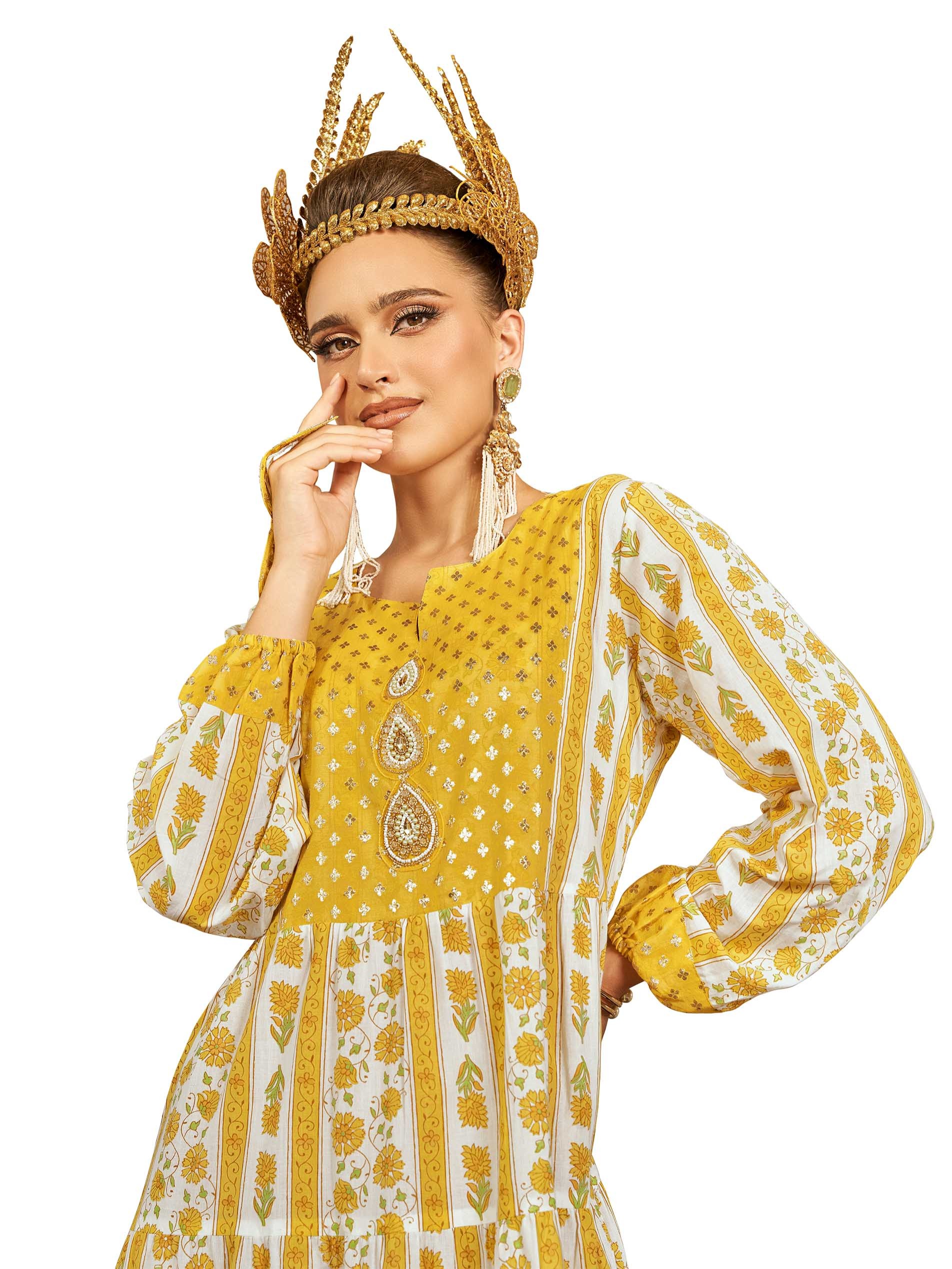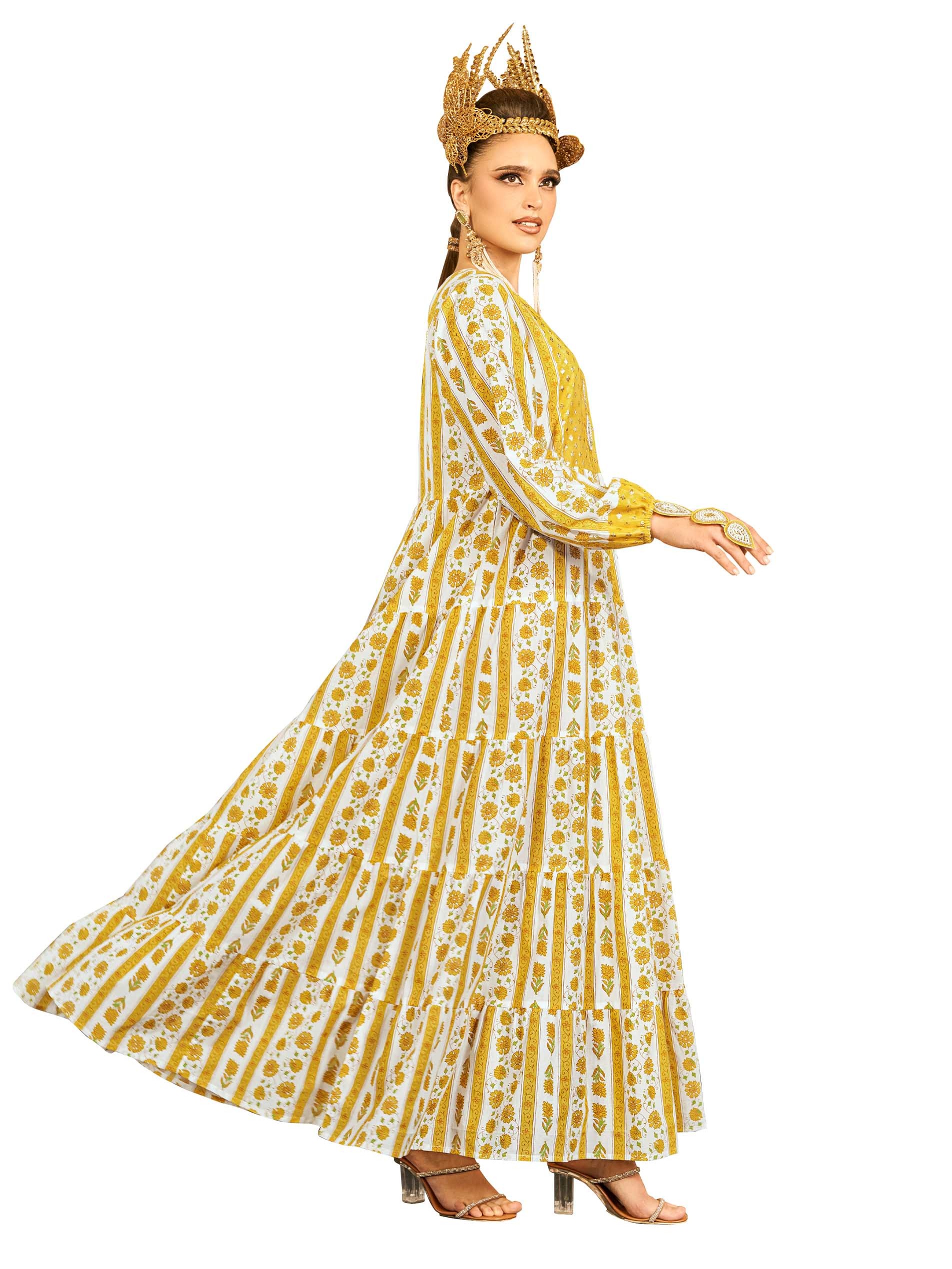 الأصفر يليق بك! تألقي في جلابية كلوش بنقشة الزهور ملونة باللونين الأصفر والأبيض مع أكمام طويلة وتطريز مميز على الصدر مرصع بالأحجار لاطلالة أكثر تميزاً في رمضان.