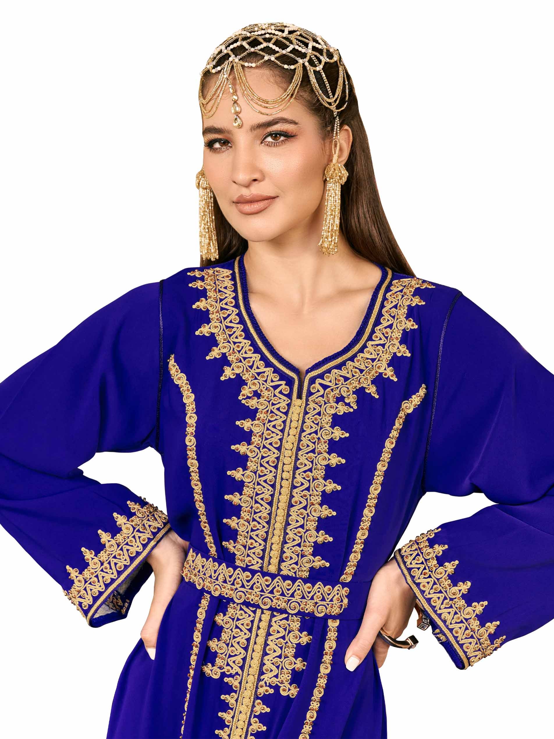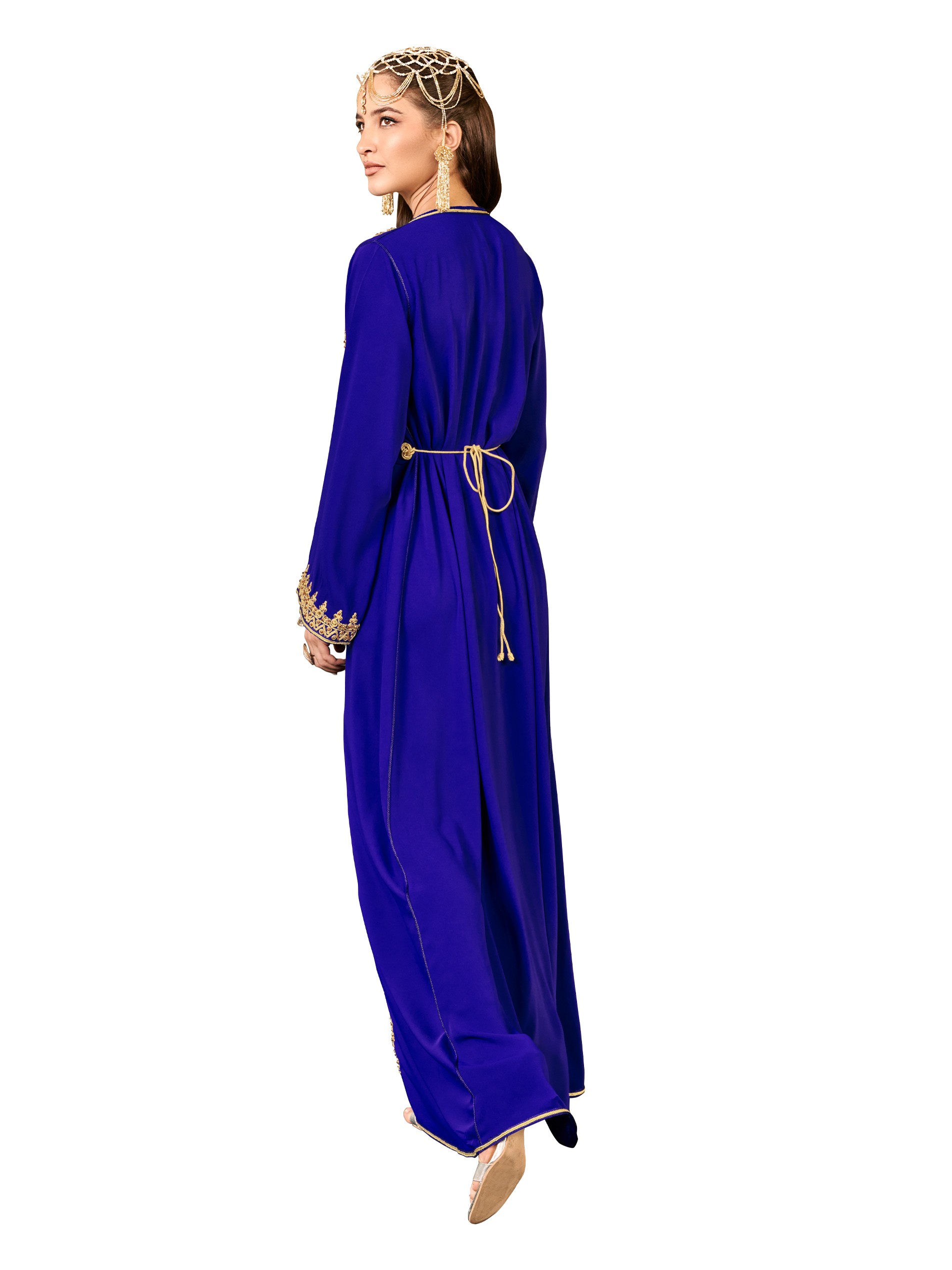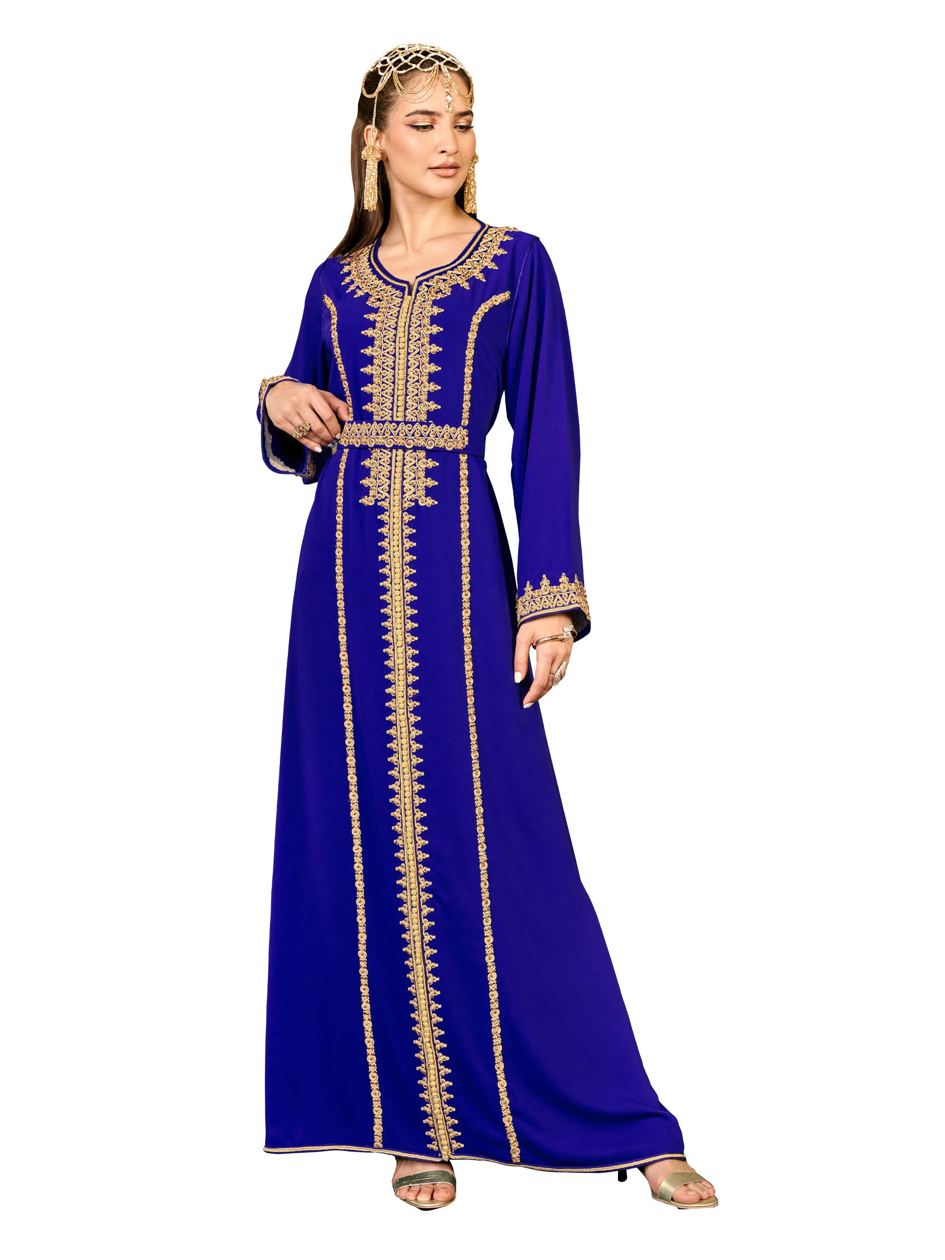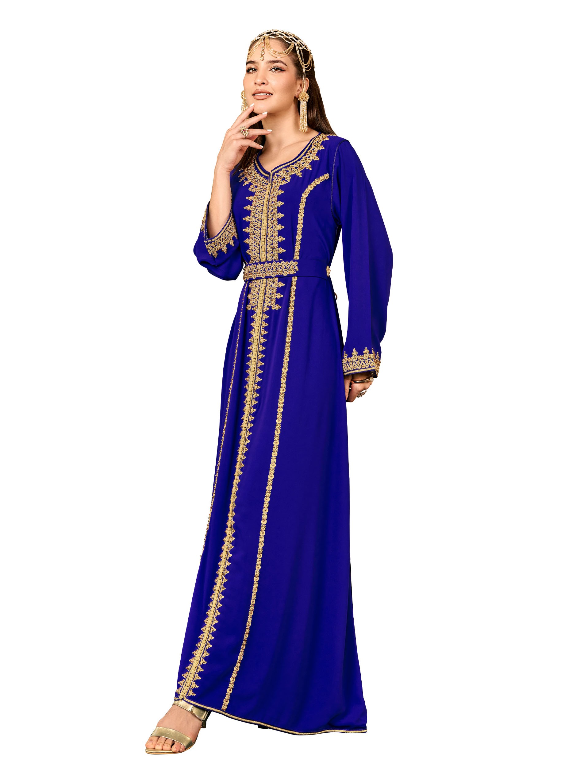 تألقي في رمضان بجلابية كريب زرقاء اللون بقصة A-line مصممة بتطريز ذهبي رائع من الدانتيل مع أكمام طويلة بأساور ذهبية وحزام على الخصر.