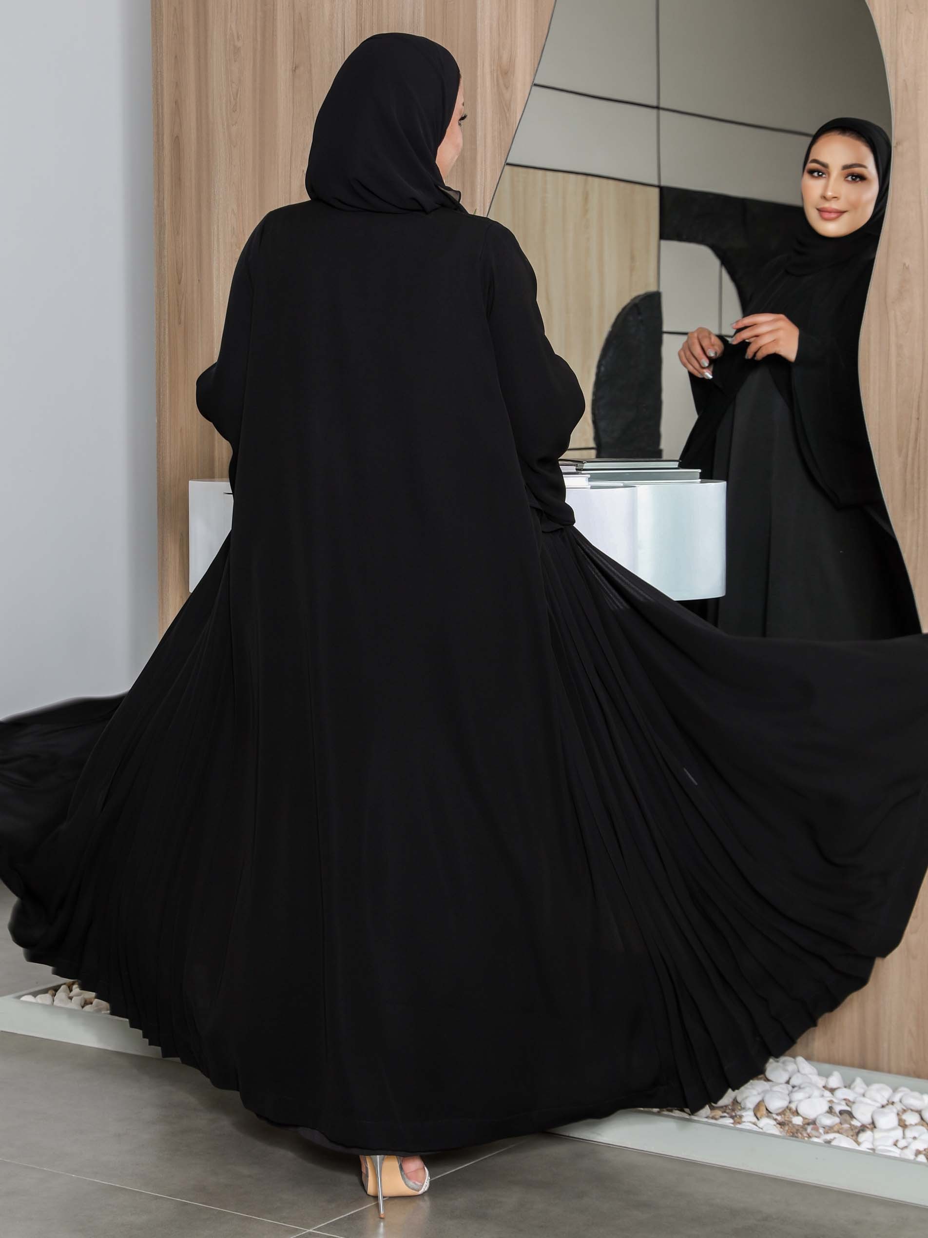 عباية فاخرة سوداء اللون بقصة A-line مع أكمام طويلة ورقبة مغلقة لاطلالة فريدة من نوعها في رمضان.