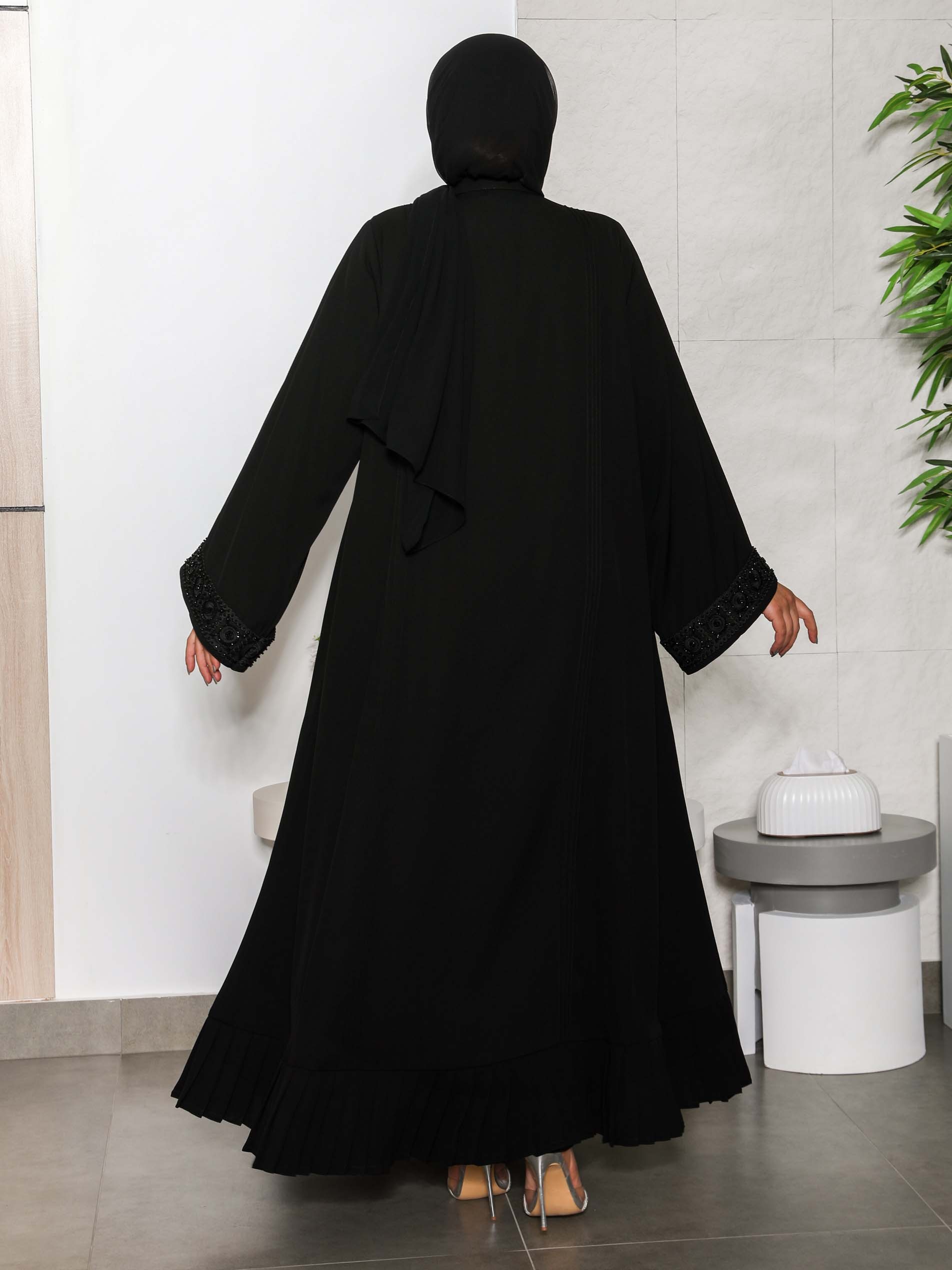 تألقي بثقة عند ارتدائك عباية سوداء سادة بأكمام طويلة مصممة بتطريز أنيق يمتد بطول العباءة مع أساور متطابقة.