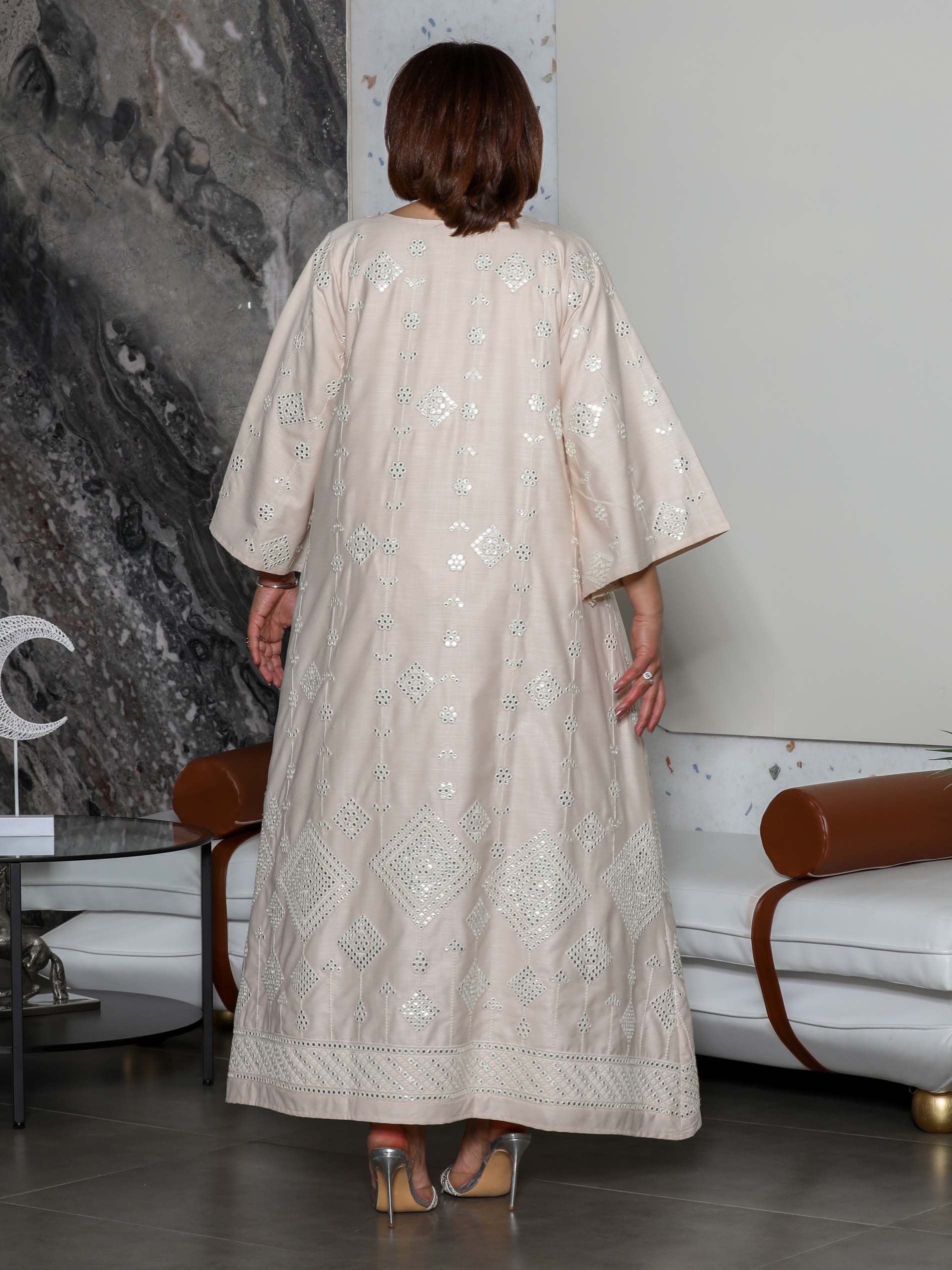 تألقي في جلابية قطنية باللون الأوف وايت مصممة بأنماط متنوعة ومرصعة بقليل من الألماظ لاطلالة تجمع بين البساطة والأناقة في رمضان.