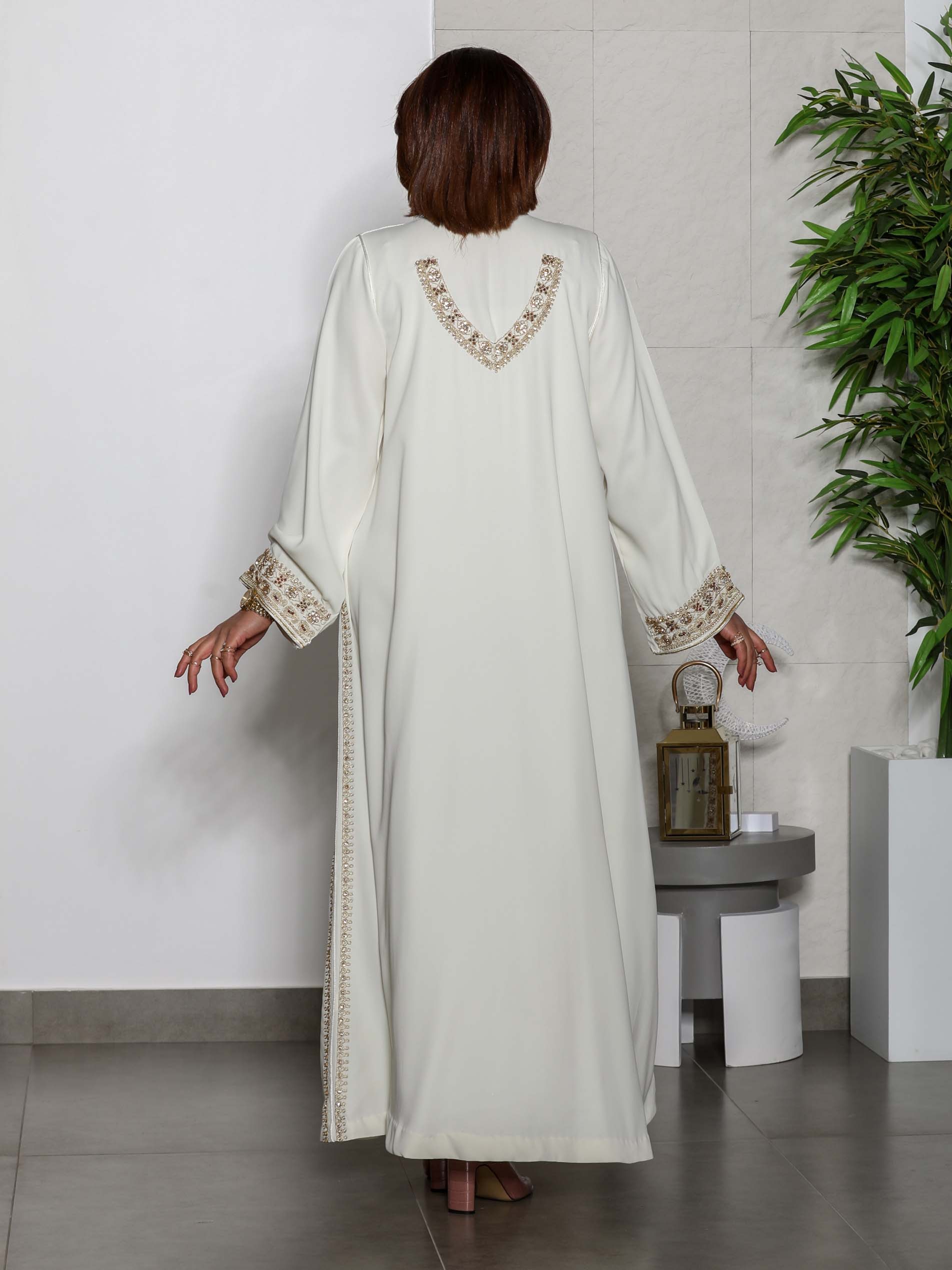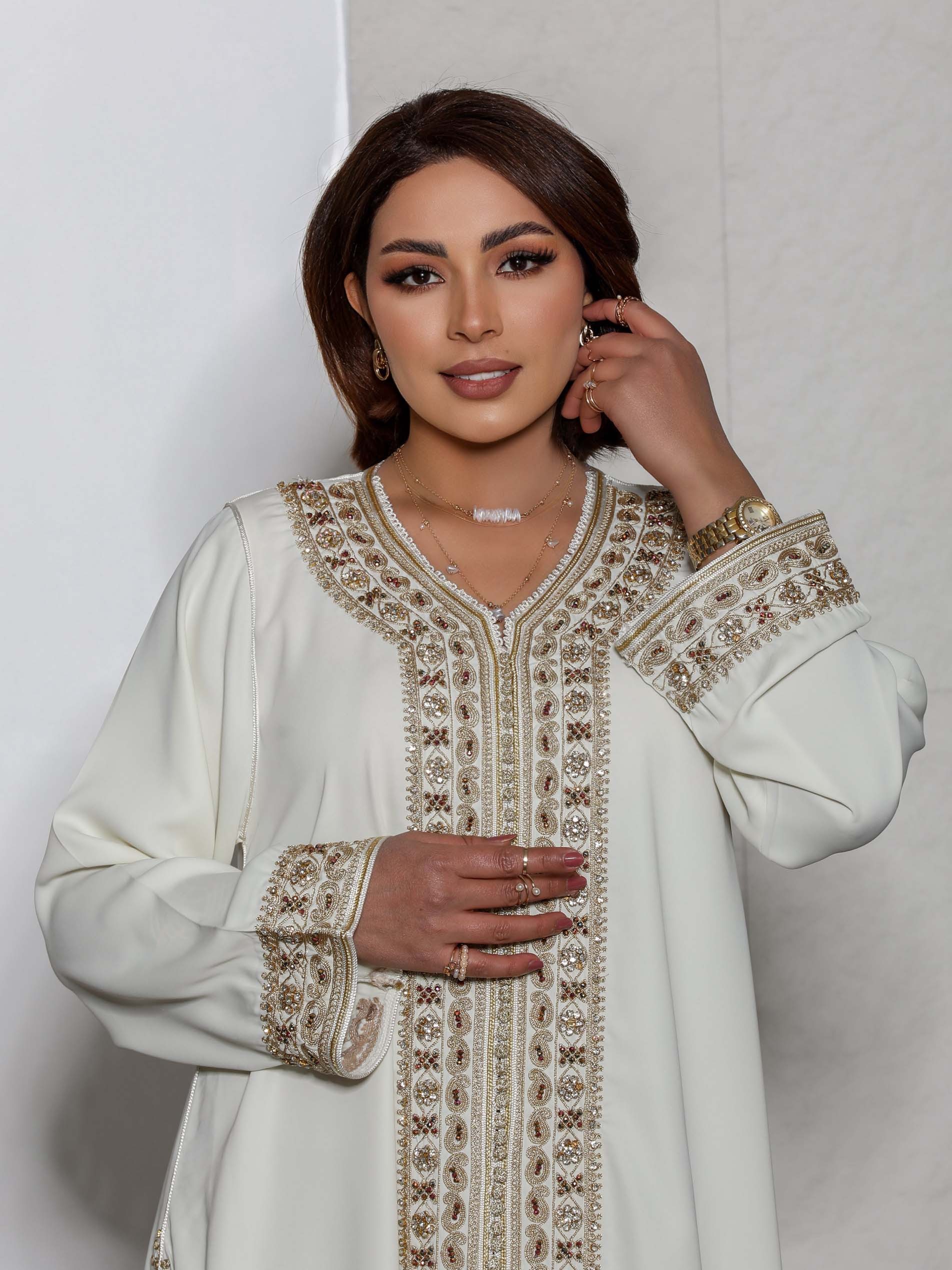 جلابية ساتان بيضاء بأكمام طويلة، مطرزة بفصوص ملونة لامعة مع أساور متناسقة لإطلالة رمضانية رائعة.