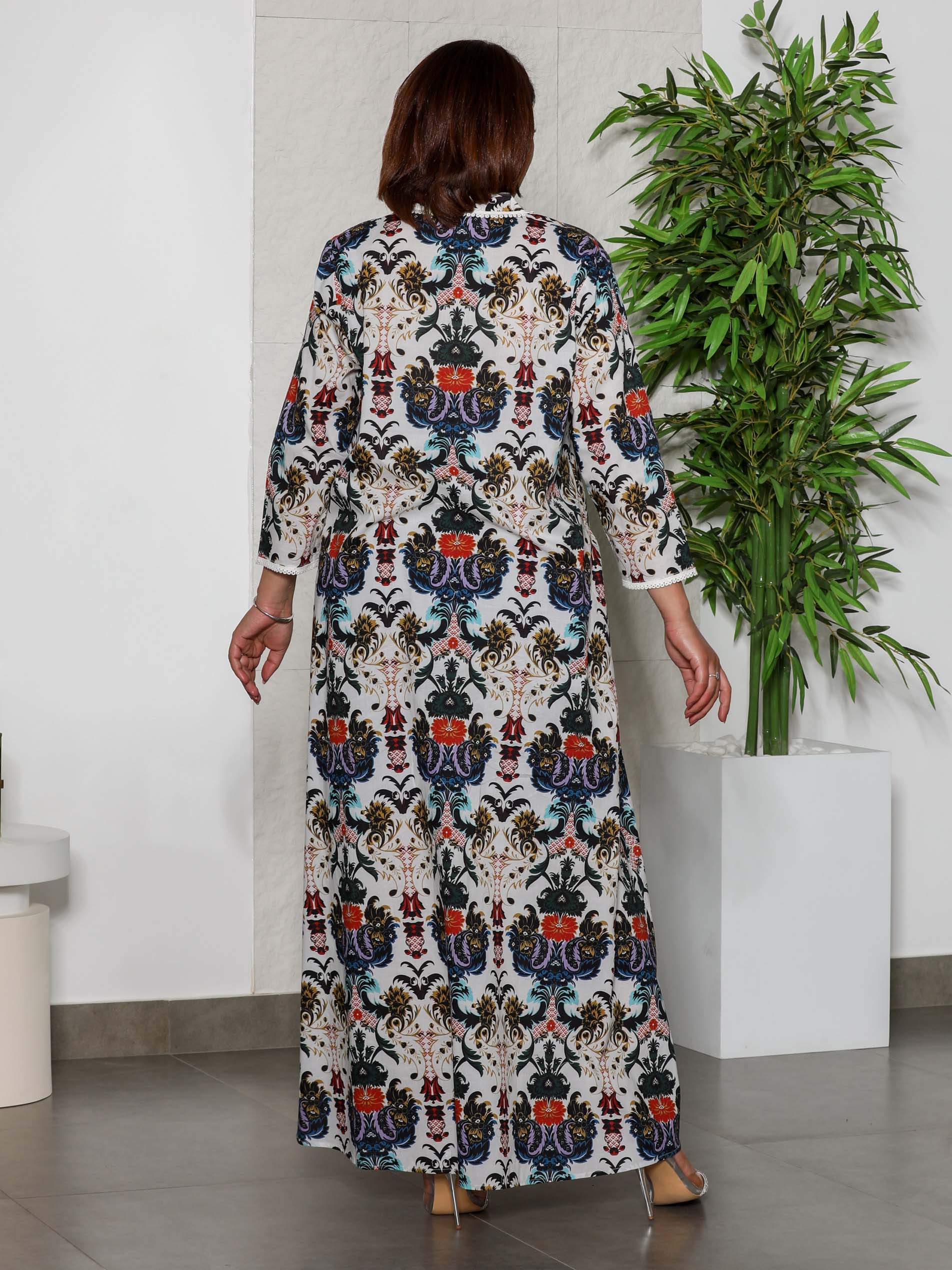 جلابية قطنية بيضاء اللون مصممة باللونين البرتقالي والأزرق لإطلالة رمضانية مذهلة.