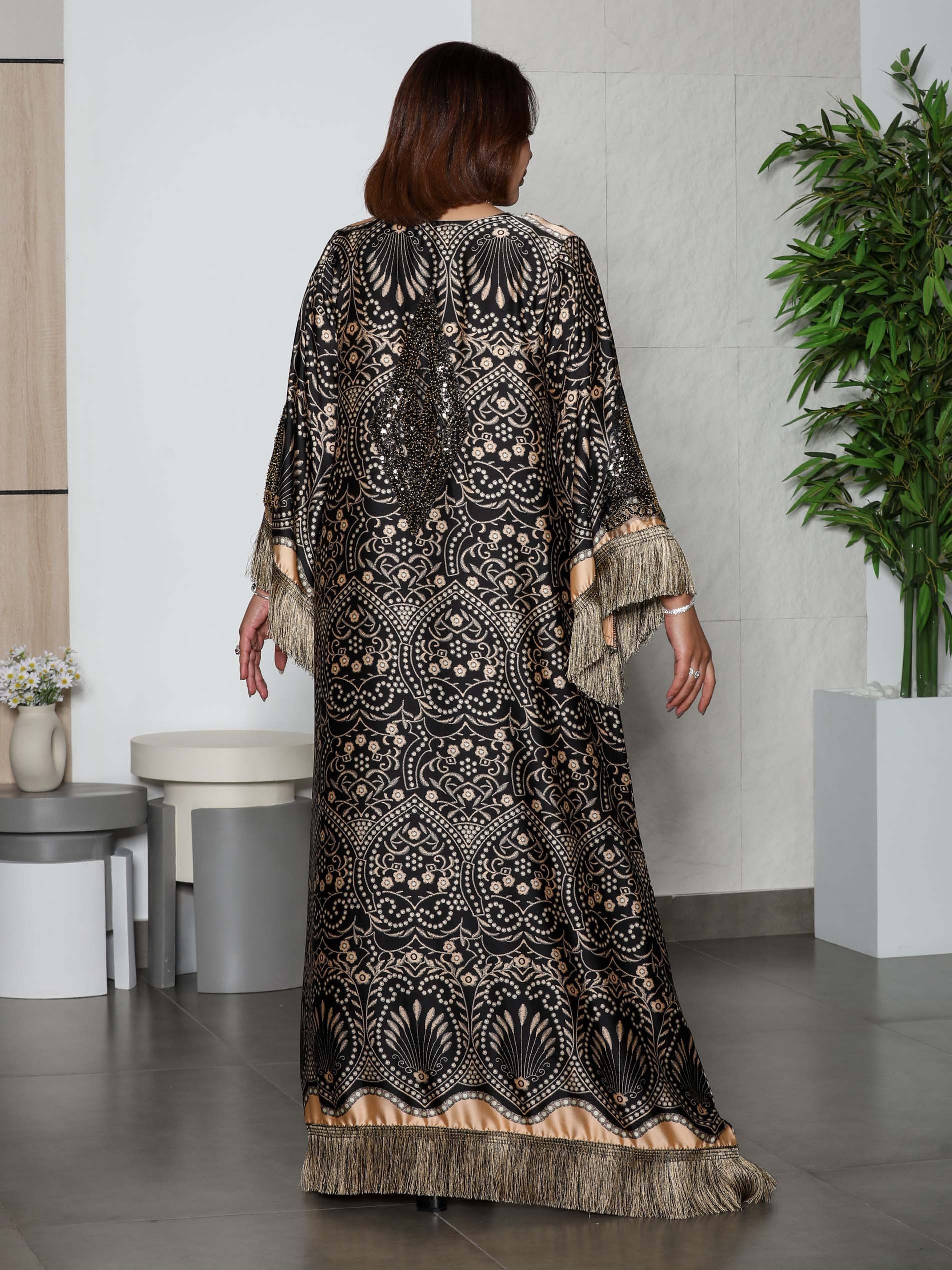 مصنوعة من القطن عالي الجودة، تتميز هذه الجلابية بلوحة ألوان مميزة تجمع بين الأسود والذهبي مع نقوش مطبوعة، مما يضفي تصميمًا يمزج بين الفن الإسلامي التقليدي والأناقة العصرية. يزداد التصميم جمالاً بفضل التفاصيل الدقيقة من الشراشيب على الحواف والأكمام، مما يضيف لمسة من الفخامة والحركة. تضفي النقوش المطبوعة مظهرًا متقنًا ومتعدد الاستخدامات، مما يجعلها قطعة بارزة مثالية للمناسبات الخاصة. يمنح القص الفضفاض انسيابية أنيقة للثوب، مما يضمن الراحة والأناقة معًا.