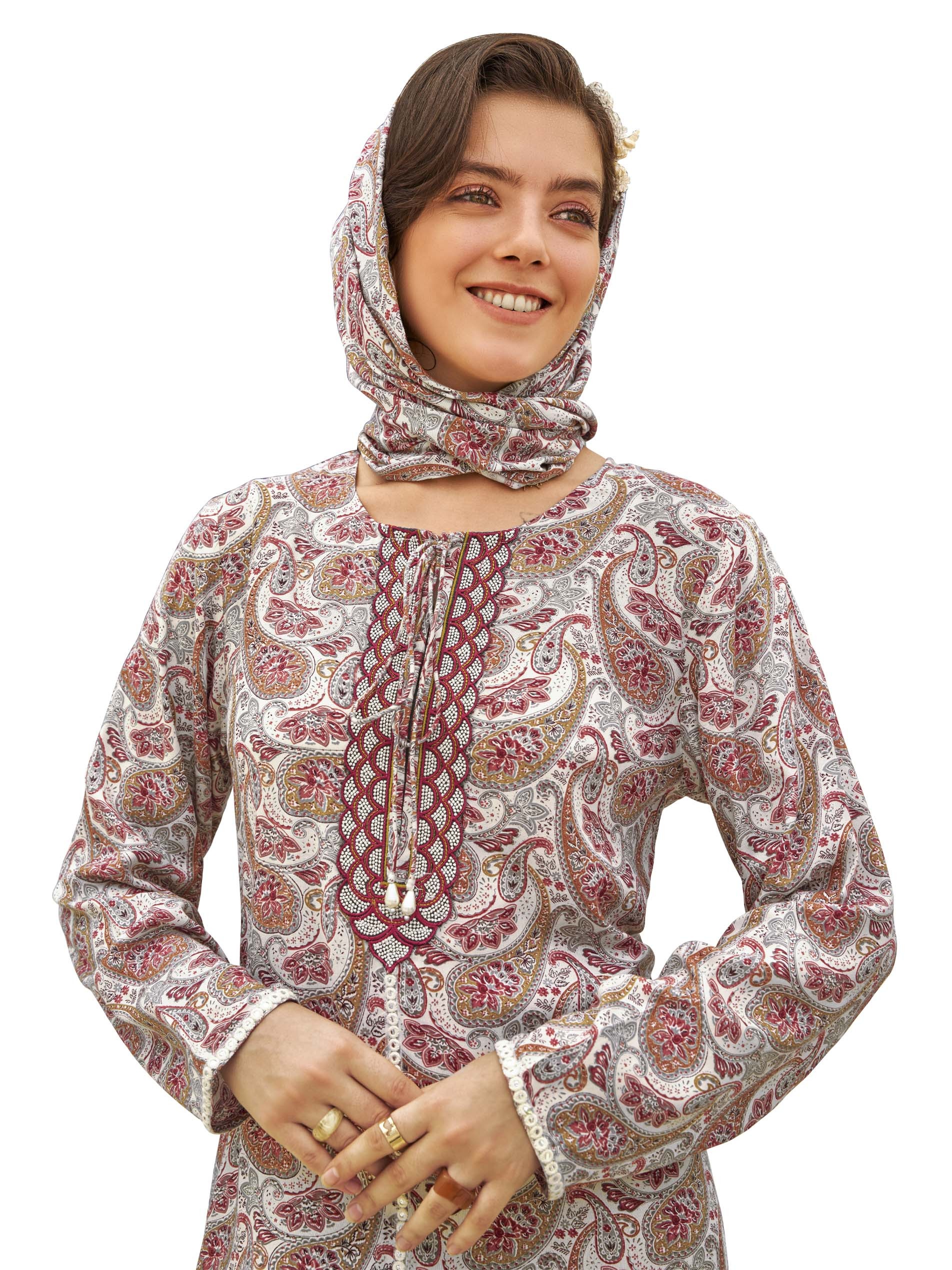 جلابية مطبوعة من الحرير الصناعي مصممة باللونين الأبيض والأحمر مع لمسة من اللون الأحمر. ويكتمل التصميم بغطاء على الرأس من نفس النقشة.