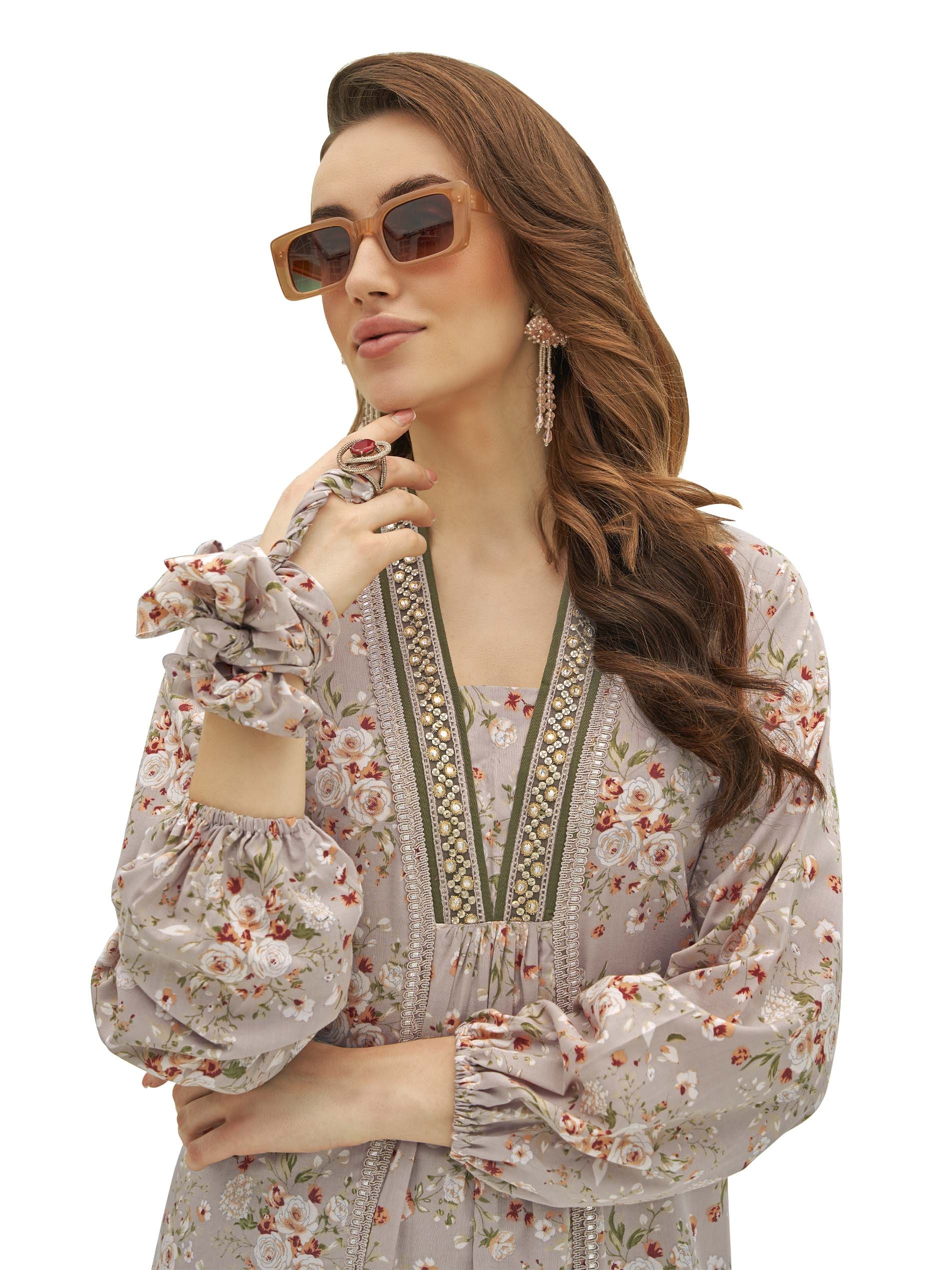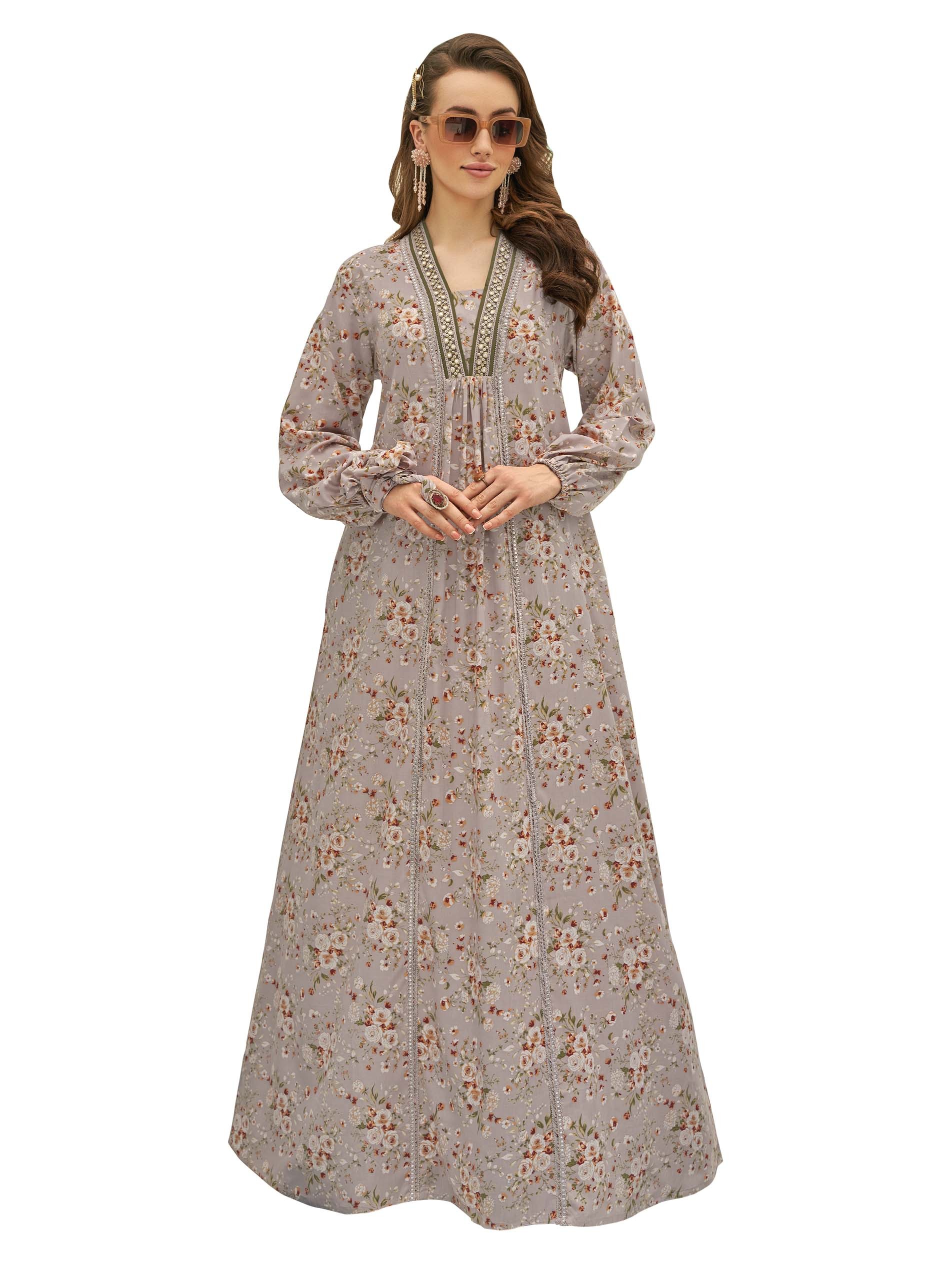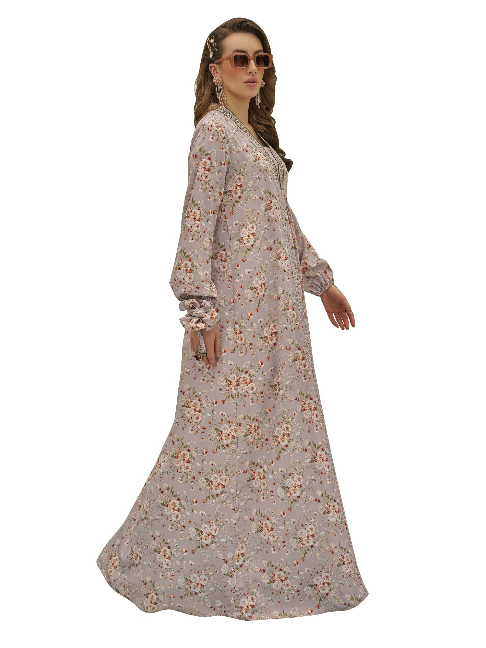 تألقي في جلابية رمادية اللون من الحرير الصناعي مصممة بنقشة الزهور البيضاء مع لمسة من اللون الوردي الفاتح. ويكتمل التصميم بأكمام طويلة وفتحة رقبة على شكل حرف V لاطلالة فريدة من نوعها.