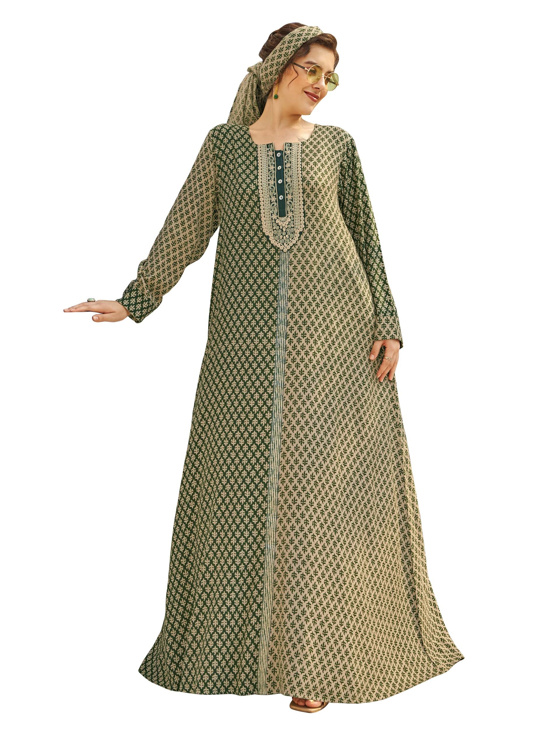 جلابية من الفيسكوز بقصة A-line مصممة باللونين البني الفاتح والأسود ومزودة بطبعة مميزة مع أكمام طويلة وأزرار أمامية