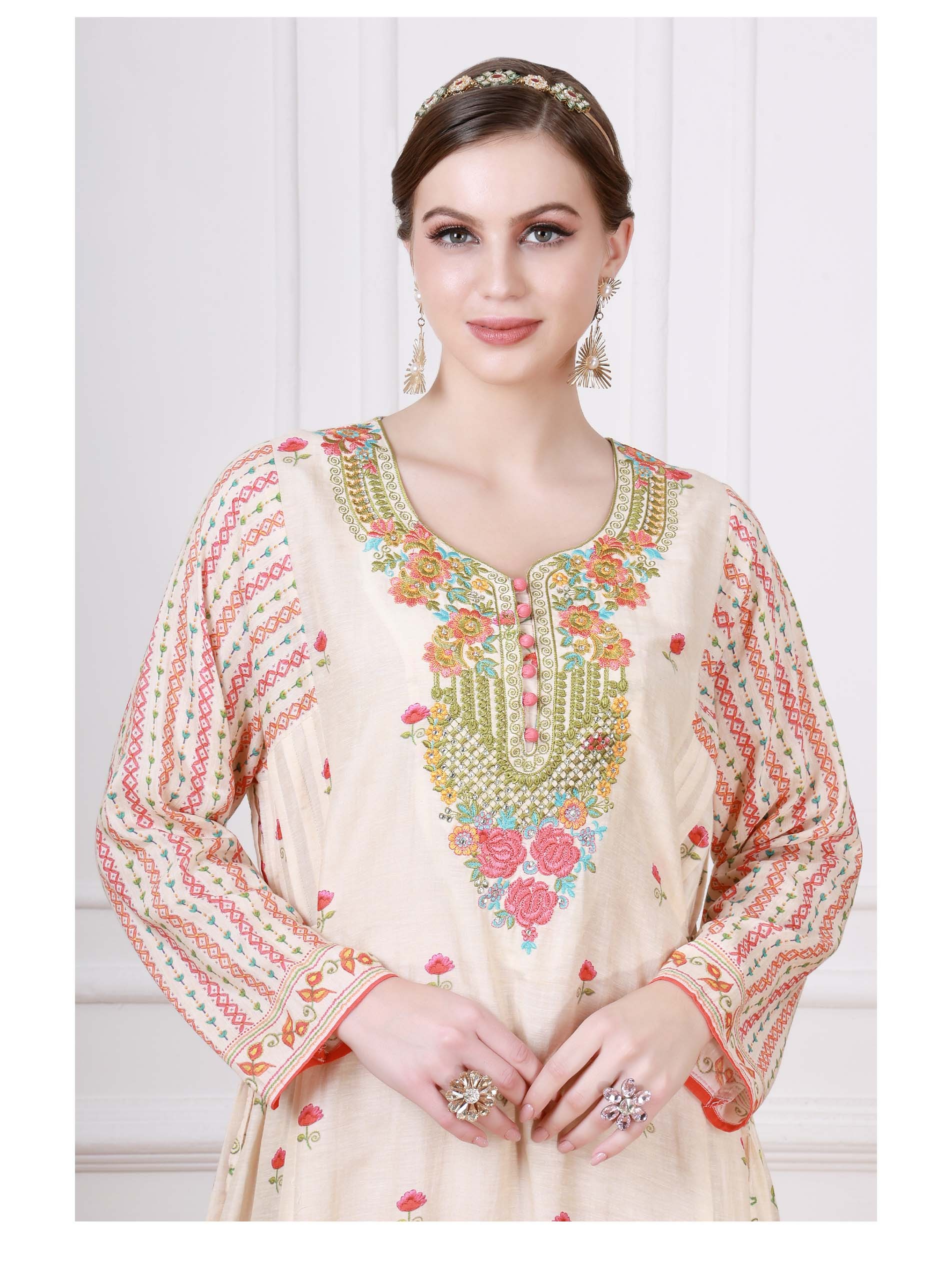 هذه الجلابية من الفيسكوز بتصميم A-line مثالية للارتداء في الصيف غير الرسمي. يتميز قماشها الناعم بالتنفس، بينما القصّة تبرز القوام الجذاب و سهولة في الحركة. يتضمن التصميم خطوطًا وردية رأسية على الأكمام، وتنتشر الأزهار بشكل أنيق وتزداد حجمًا على الحافة السفلية. يتم تزيين ياقة الجلابية بأشكال زهور، مع إبراز ألوان وردية، وخضراء، وصفراء زاهية. تعرض الجلابية اشغال متعددة، و تدمج تقنيات مختلفة لخلق مظهر فريد.