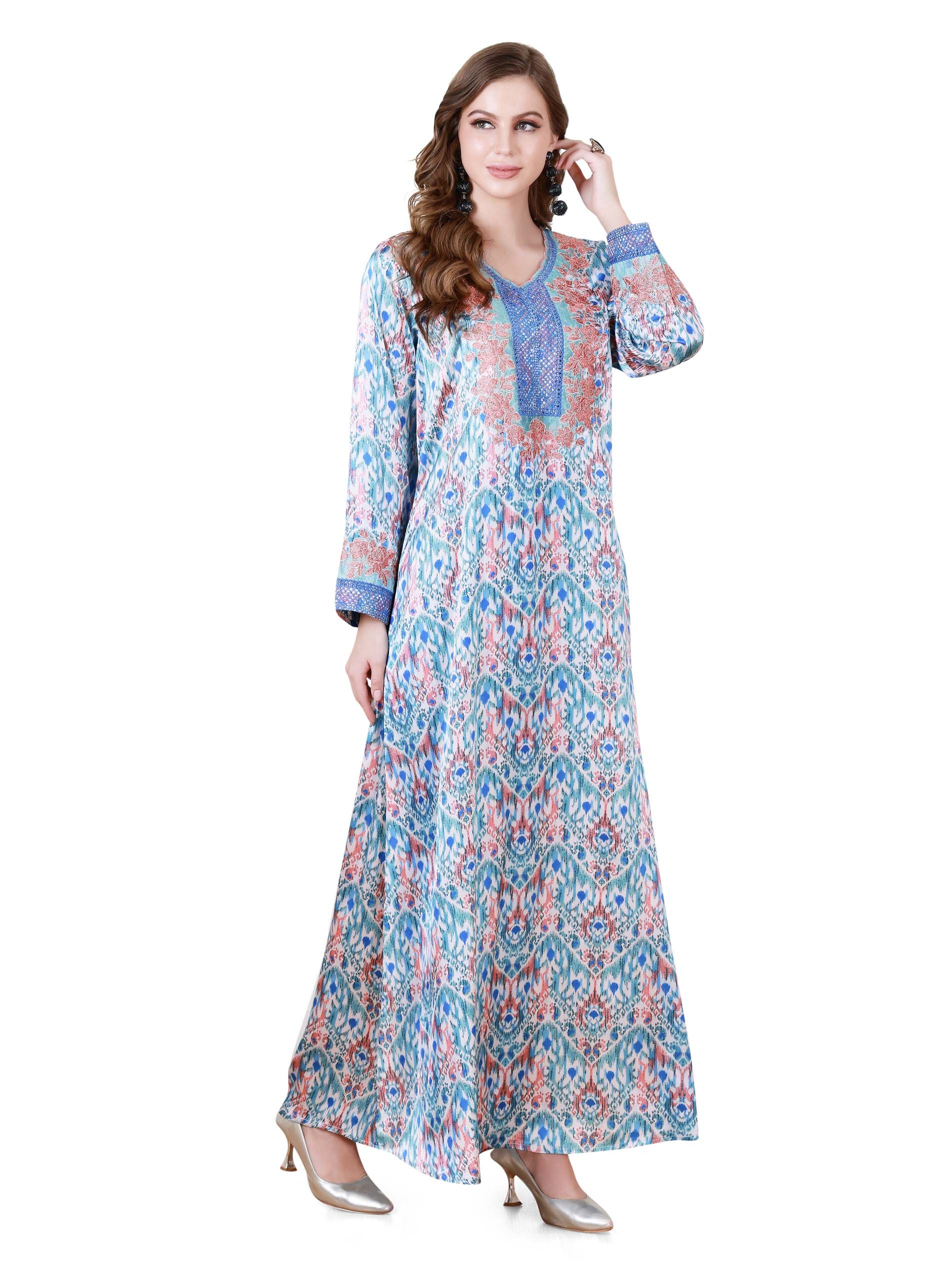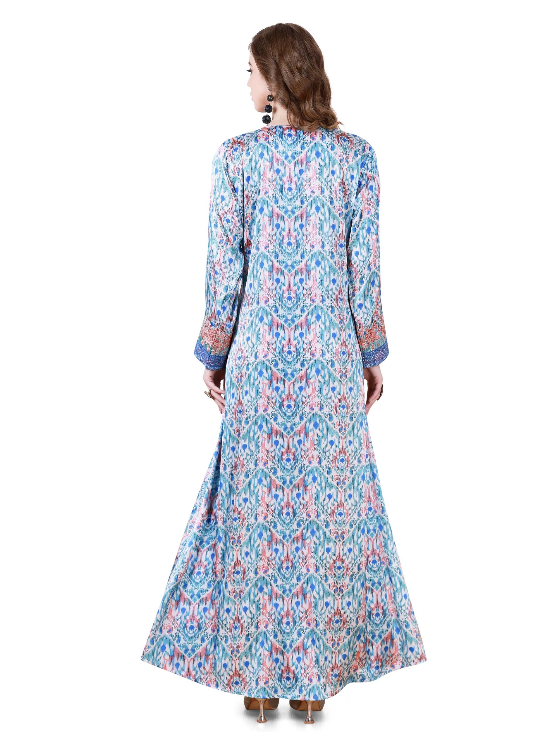 تتميز هذه الجلابية المصنوعة من الساتان بقصة A-line وتمزج بين الألوان الزاهية والنقوش المعقدة، مما يجعلها مثالية للارتداء في الصيف غير الرسمي. تبرز درجات الأزرق والوردي الهادئة مع الخلفية البيضاء، مما يخلق تباينًا بصريًا جذابًا. وتغطي الجلابية بالكامل بطباعة إيكات تشمل الأشكال الهندسية والألوان الدقيقة.