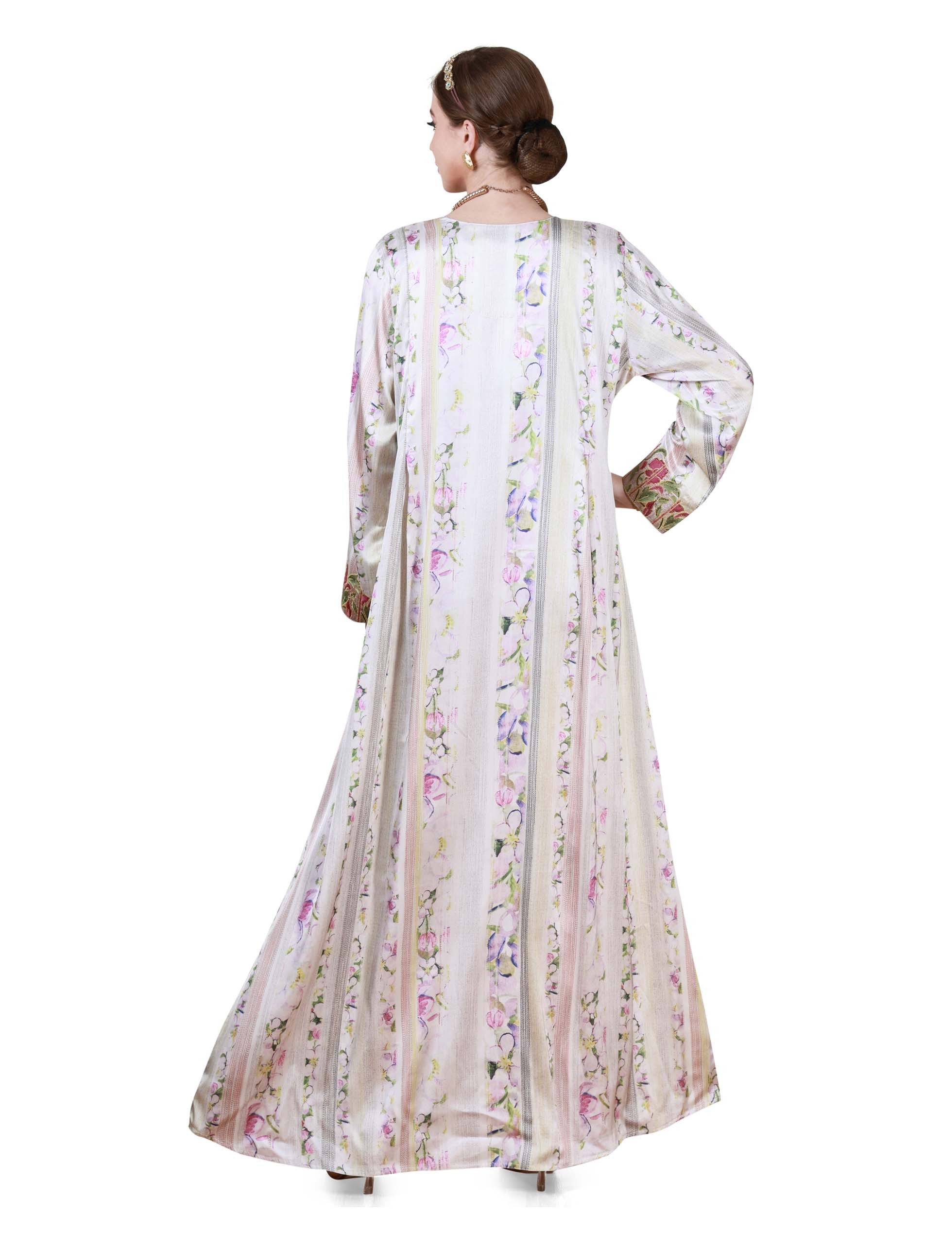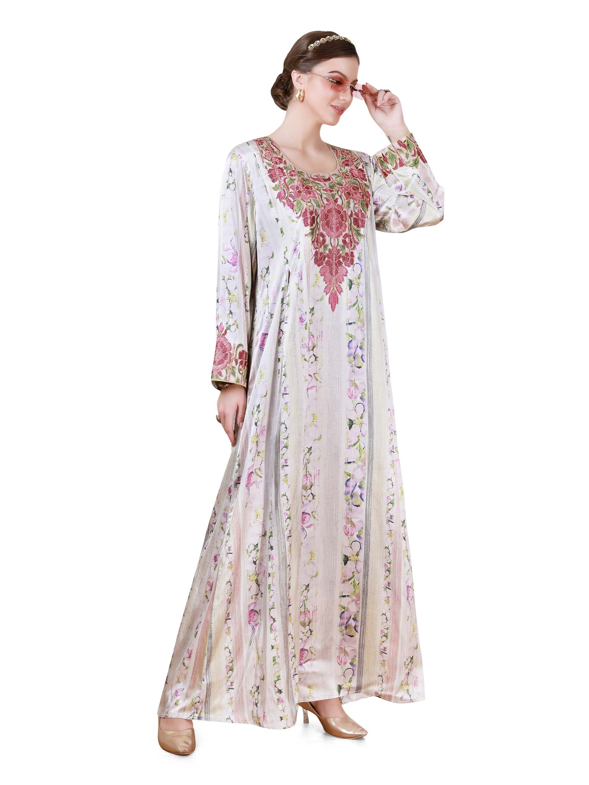 تتميز هذه الجلابية المصنوعة من الساتان بتصميم A-line مع قاعدة بلون بيج ناعم وزخارف زهرية حيوية باللونين الوردي والأخضر، مما يجعلها مثالية للارتداء الصيفي غير الرسمي. يضيف التركيز الزهري على ياقة الأكمام لمسة راقية من الطبيعة. كما يتم تزيين الجسم بنمط إيكات يغطي الجلابية بالكامل، مما يمنحها قوام وعمقًا. يضمن التصميم الواسع والأكمام الطويلة الراحة والعملية.