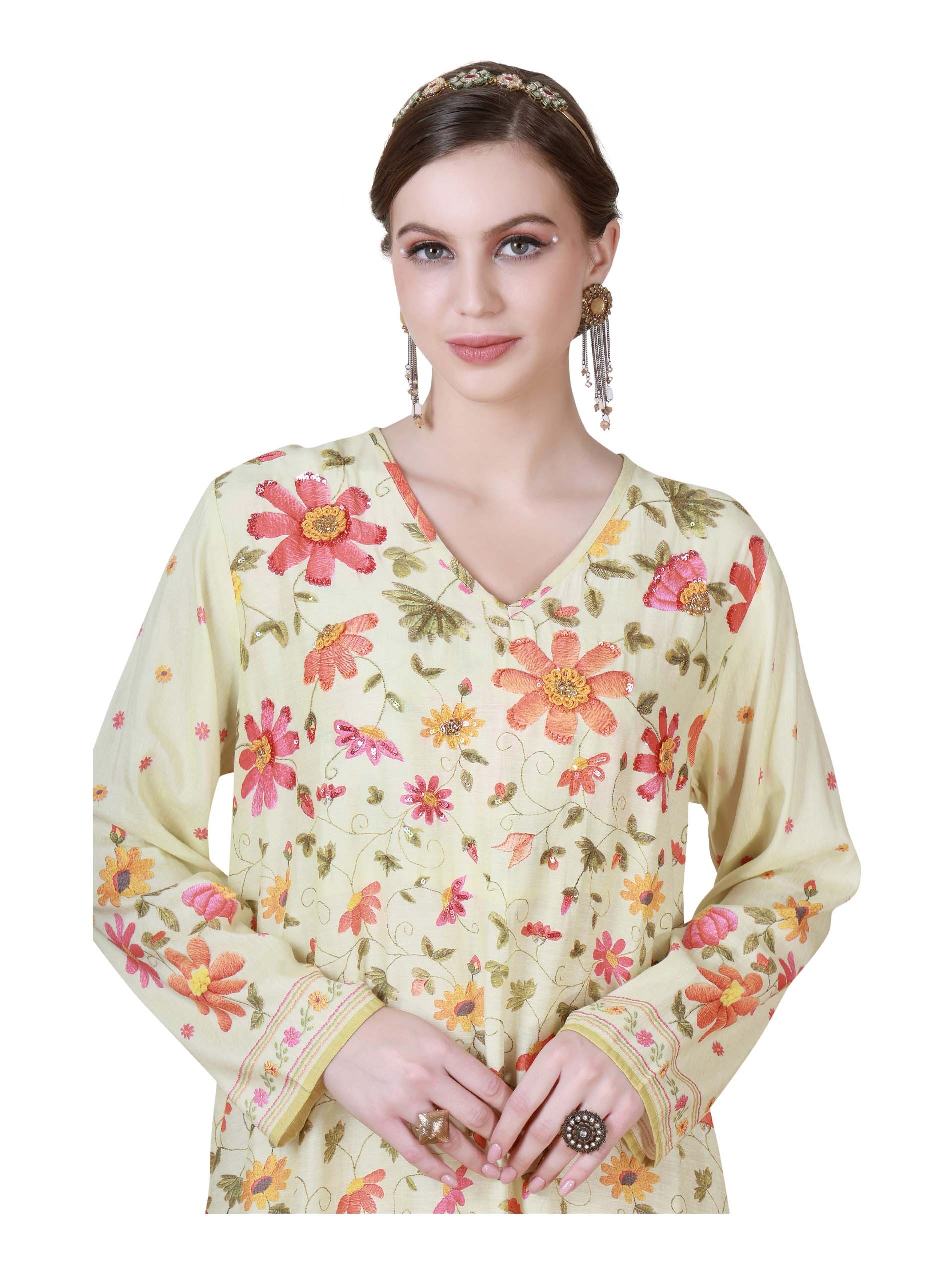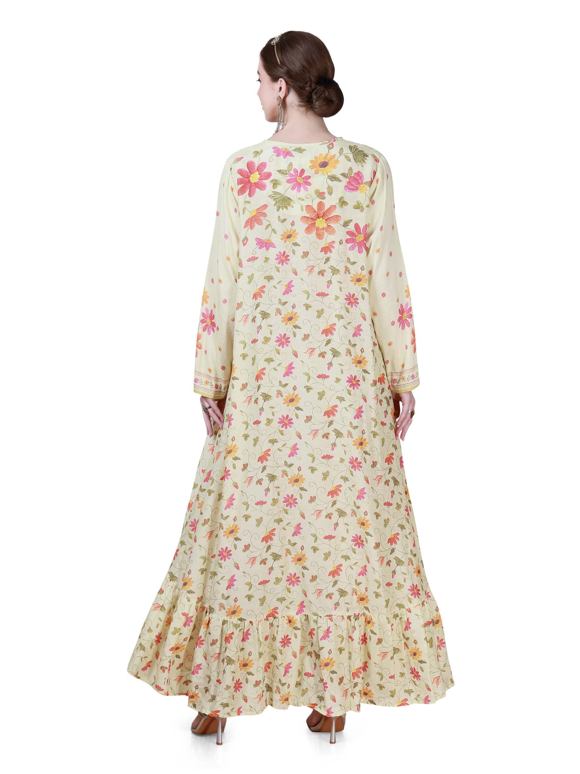 هذا الجلابية A-line يعرض شغل متعدد من أنماط الأزهار الرائعة. مصنوع من قماش الكتان، مثالي لموسم الصيف الدافئ. يحتوي على مجموعة متنوعة من الأزهار بألوان الوردي والأصفر والأخضر، مما يخلق مظهرًا حيويًا. استخدام القاعدة البيج الفاتح يسمح للألوان بالظهور. تضيف الحافة المموجة عنصرًا مرحًا، مما يضفي الحركة والأناقة مع كل خطوة. يلتقط التصميم جمال الطبيعة، مما يجعله قطعة فنية قابلة للارتداء، مناسبة للحفلات.