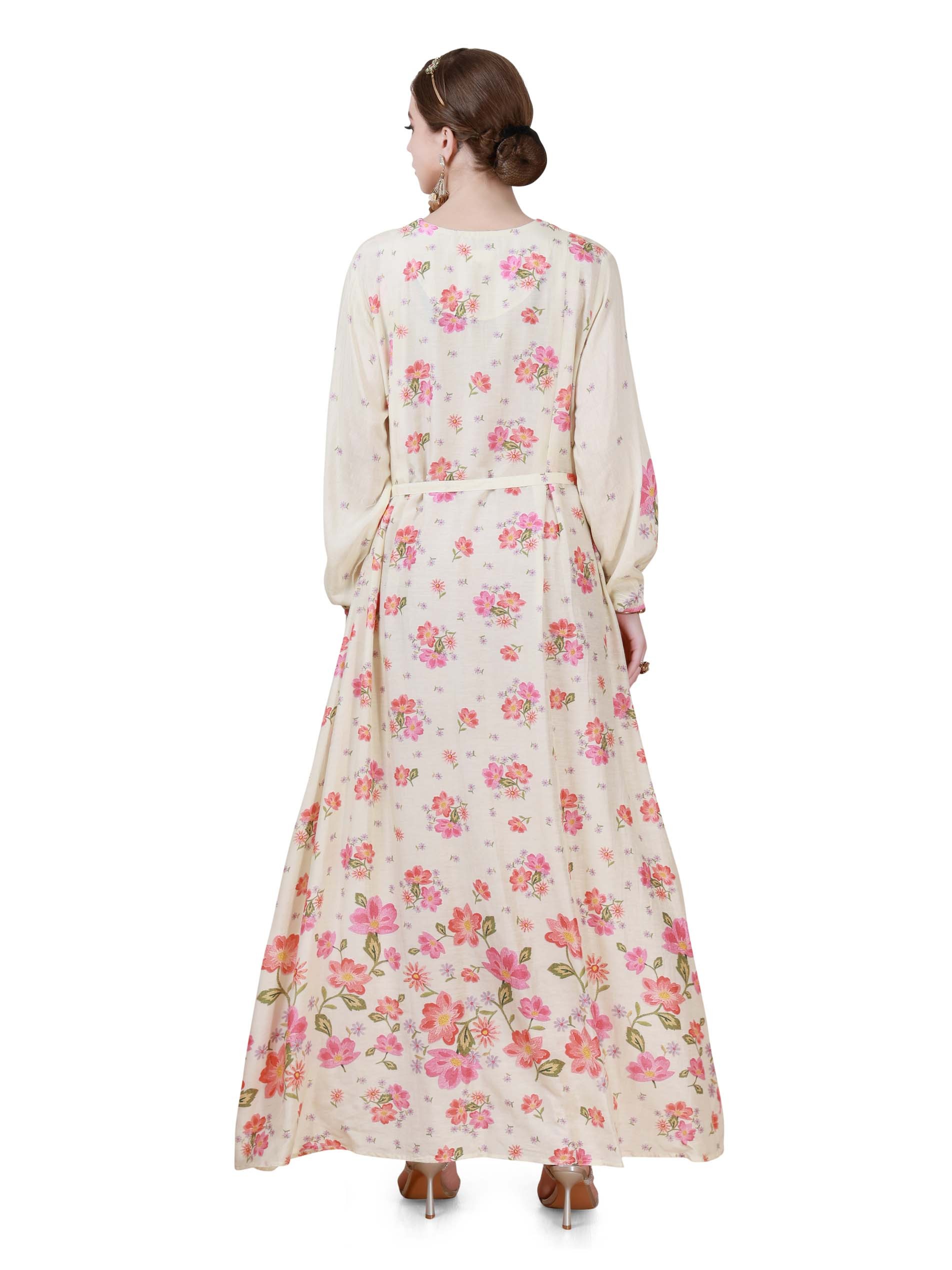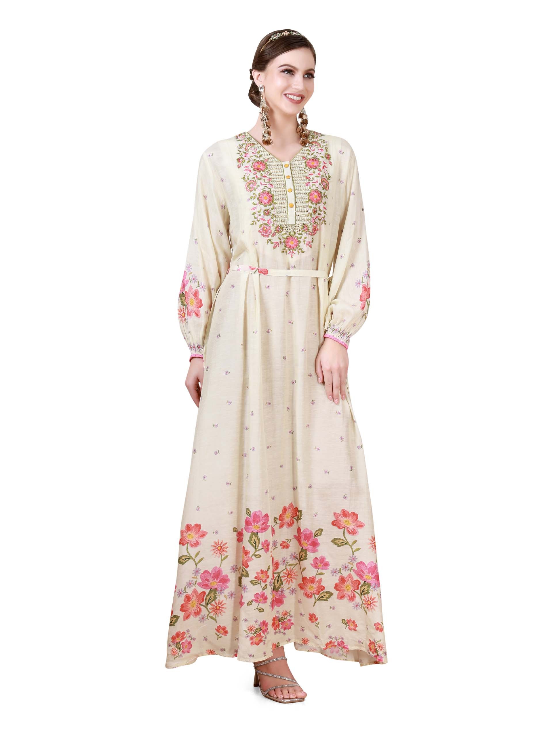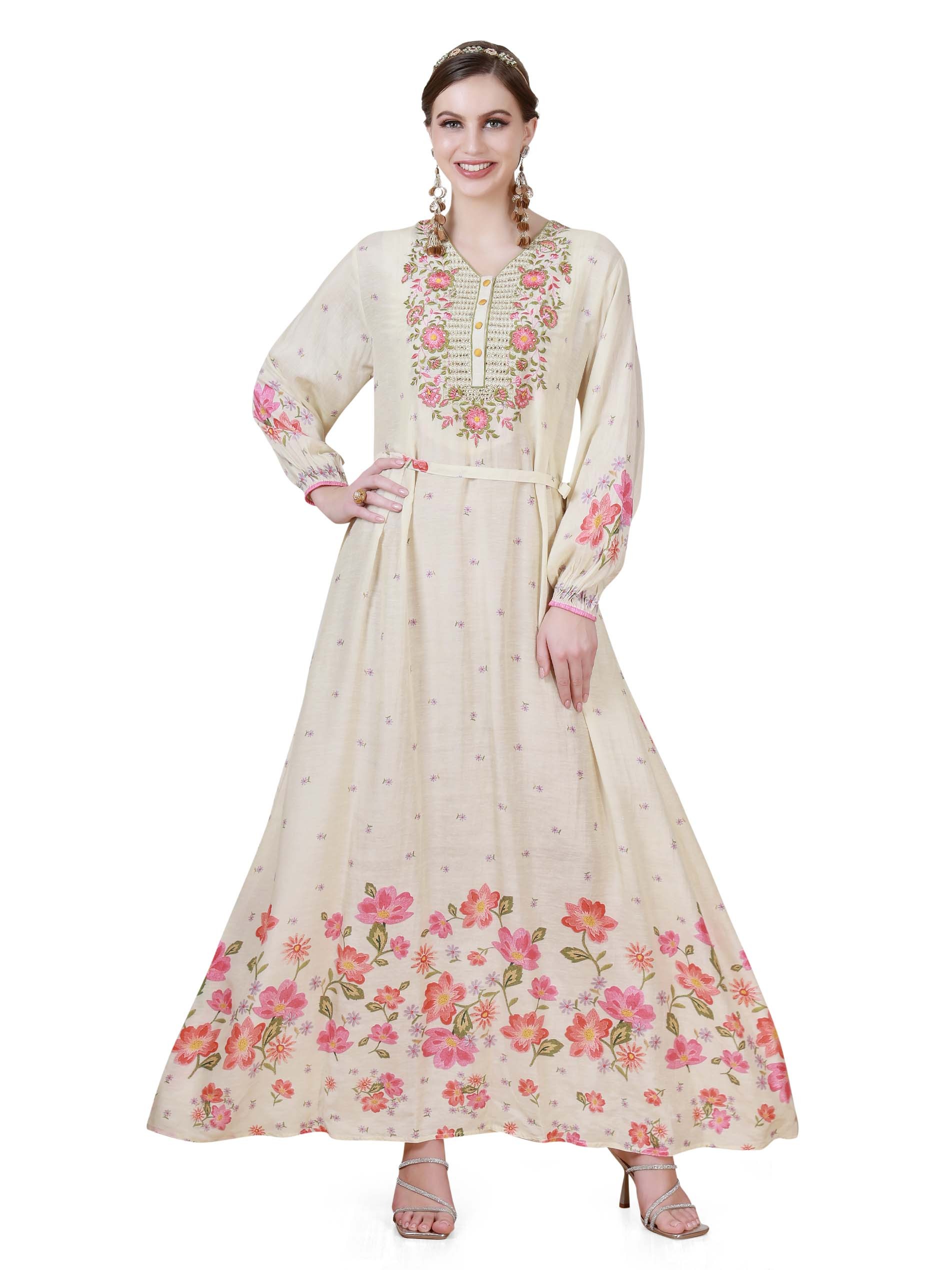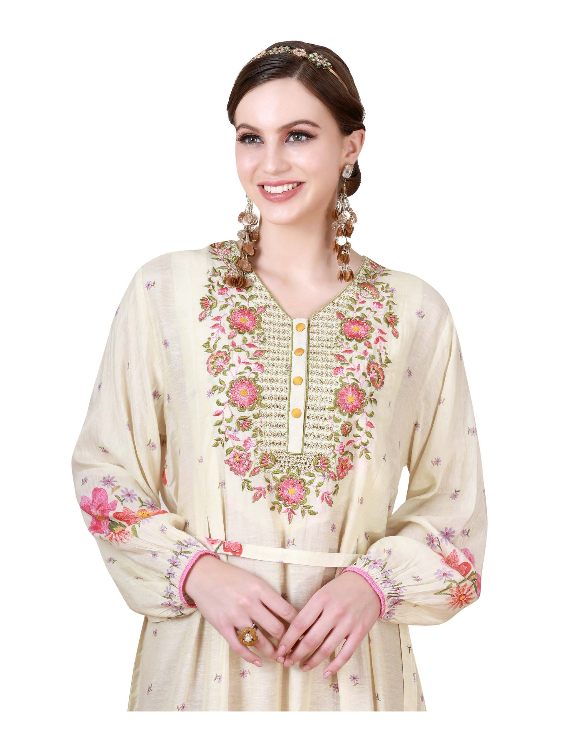 تتميز هذه الجلابية المصنوعة من الكتان بشغل متعدد تشمل نقوشاً زهرية بألوان زاهية من الوردي والأصفر والأخضر، مع لمسات خفيفة من البنفسجي الفاتح، مما يجعلها مثالية لحفلات الصيف. يعزز اللون الكريمي الفاتح القاعدة ويبرز الألوان الزاهية، مما يخلق مظهراً مشرقاً ومبتهجاً. القصّة الواسعة والحافةالمزخرفة تسمح بحركة رشيقة، بينما يبرز الحزام الخفيف الخصر. و الأساور المجمعة، تخلق تأثيراً منتفخاً قليلاً عند المعصمين، مما يكمل التصميم العام.