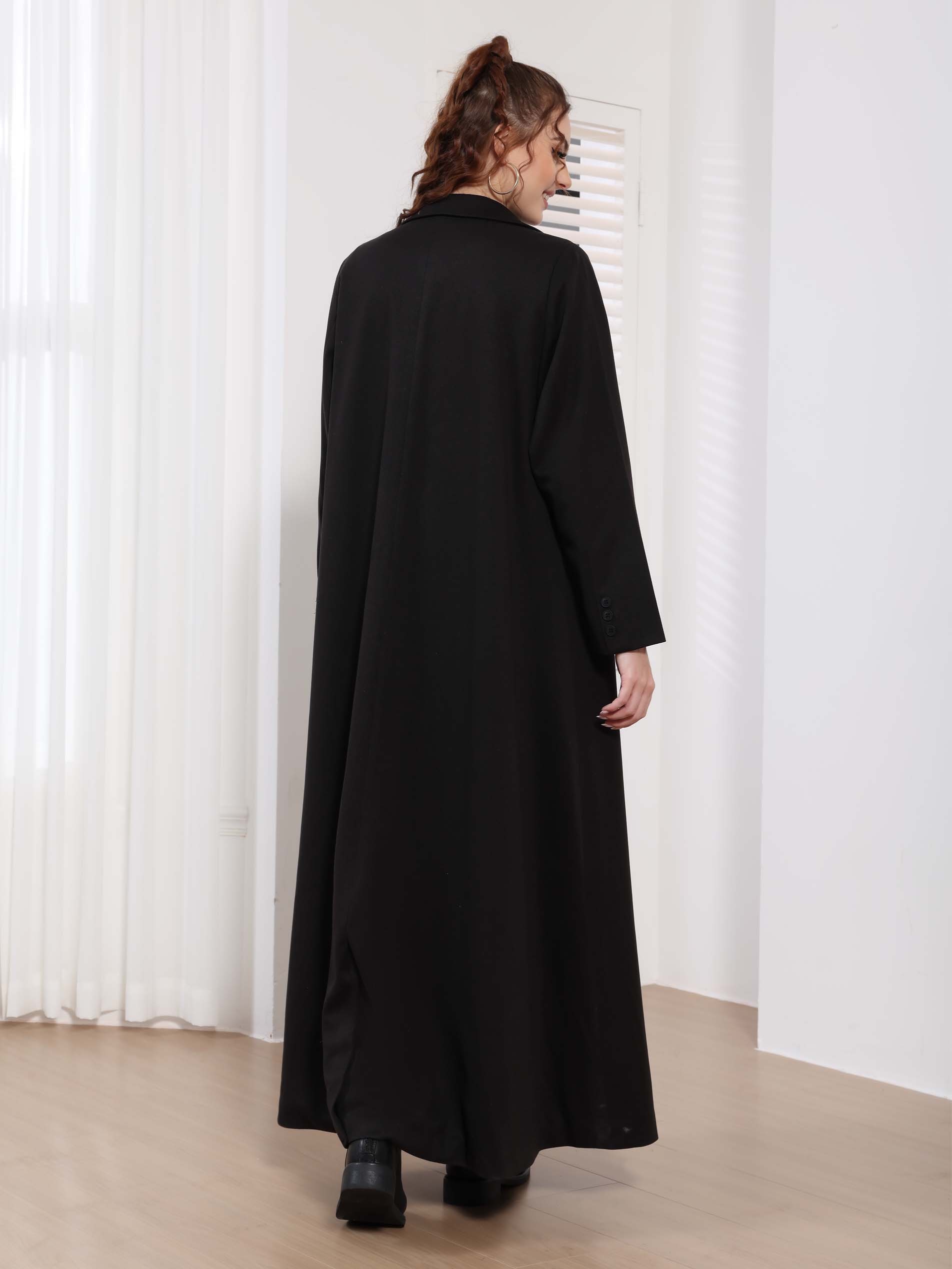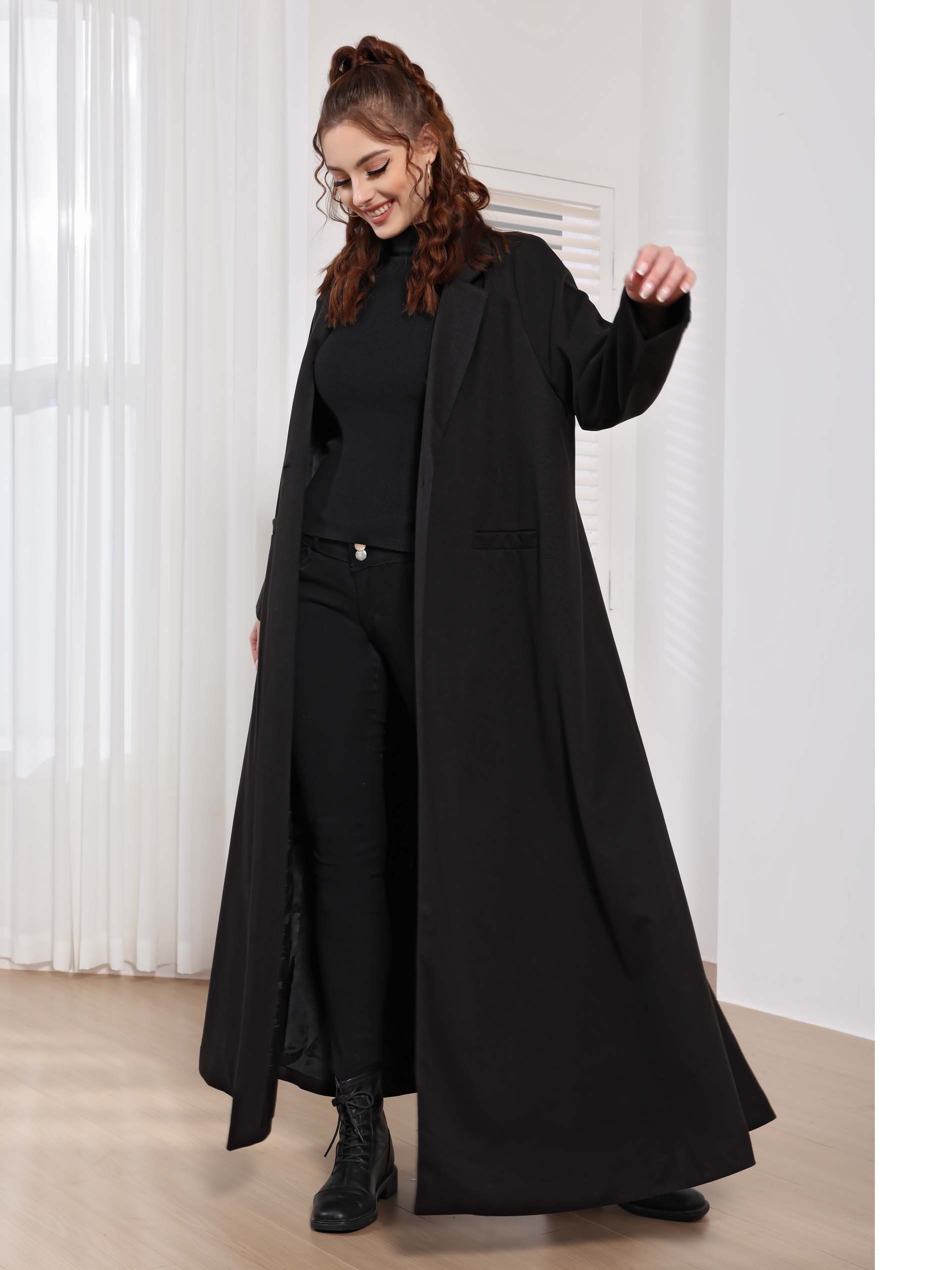 تم تصميم هذا الجاكيت من قماش القطن الذي يوفر الدفء والراحة في فصل الشتاء. الشغل السادة للتصمم و اللون الأسود الموحد يسهل تنسيقه مع أي ملابس، مما يجعله إضافة رائعة لأي زي، ويجعله خيارًا مثاليًا للمناسبات الاحتفالية.