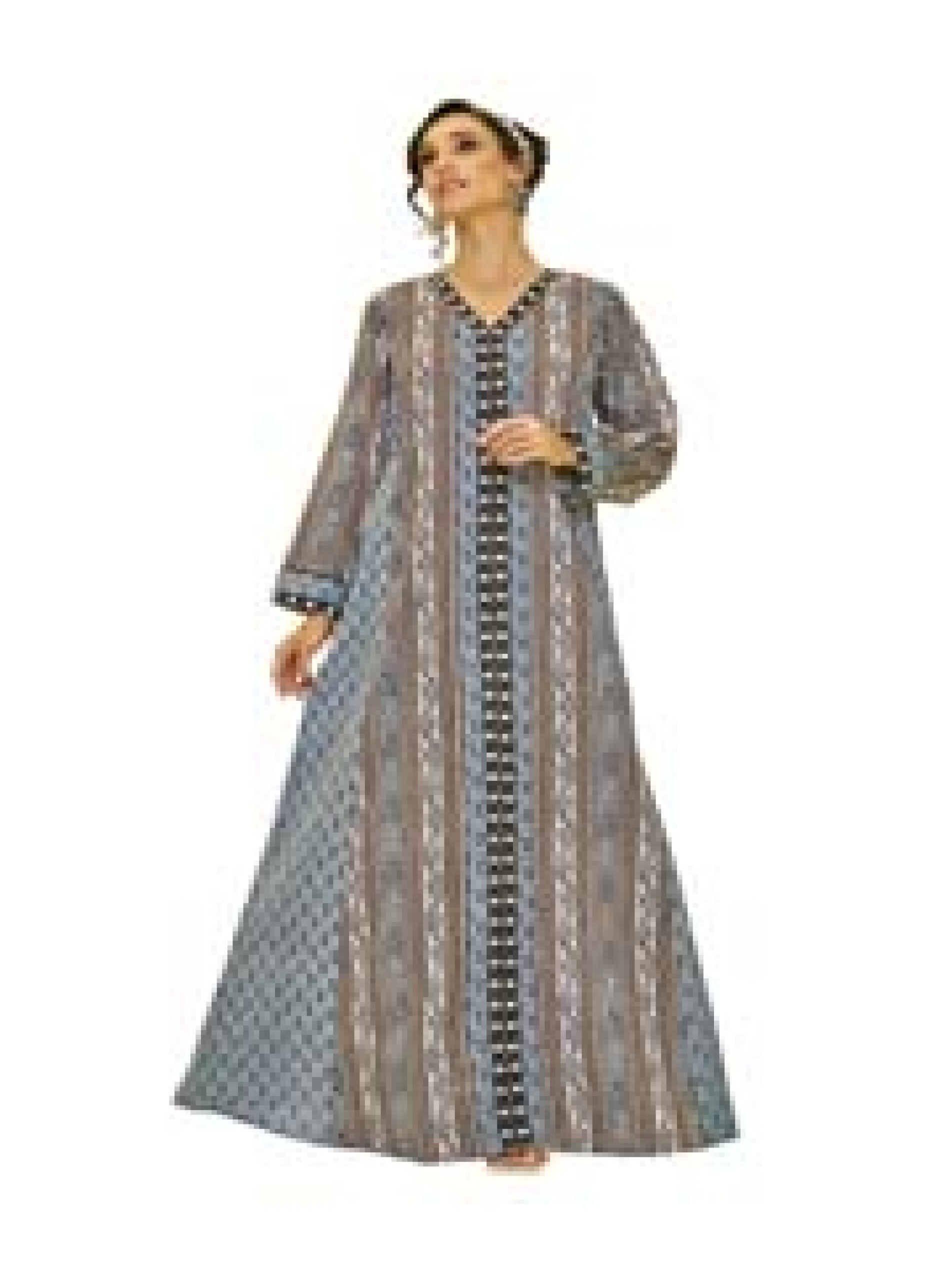 تتميز هذه الجلابية الأنيقة ذات القَصّة المُتَوَسِّعة المصنوعة من القطن القابل للتنفس بالراحة والنعومة للمناسبات الصيفية. تجمع بين الزخارف الزهرية والشرائط الهندسية بألوان الأزرق، والرمادي، والأبيض، والبني، مما يخلق مزيجًا من الأنماط الحيوية مع لمسة من الرقي. يضيف لوح التطريز لمسة إضافية من التفاصيل، مما يجعلها خيارًا مثاليًا للارتداء غير الرسمي مع لمسة من الأناقة.