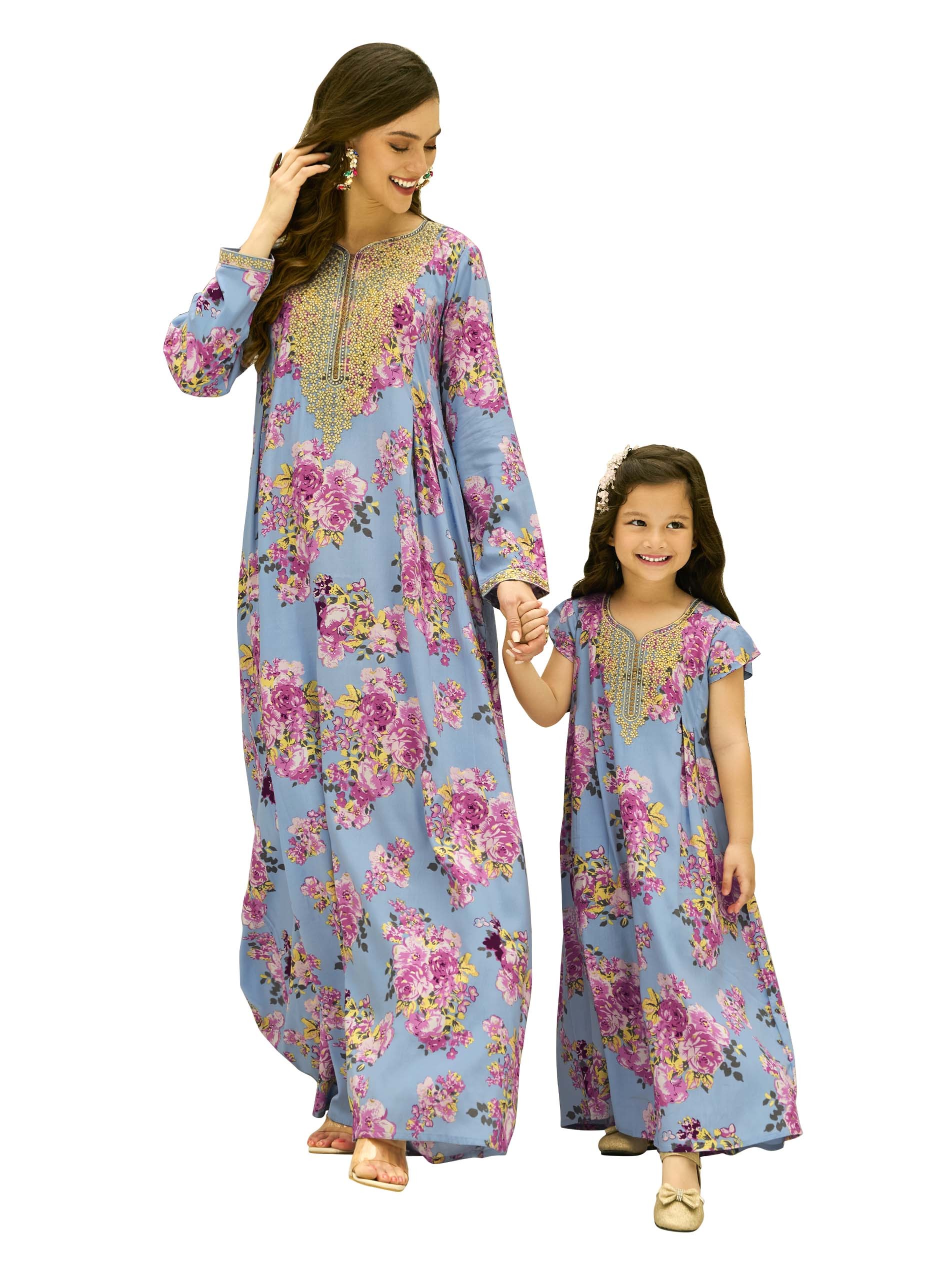 تتميز هذه الجلابية المصنوعة من القطن الرايون للأطفال بلون أزرق باستر مزينة بطبعات زهور باللونين الوردي والأصفر والأخضر، مع زهور صفراء ساطعة عند الياقة. توفر القصّة المُتَوَسِّعة ملاءمة مريحة، بينما يضمن القطن القابل للتنفس والأكمام القصيرة حرية الحركة للأطفال النشيطين خلال حفلات الصيف. يضيف تطريز الياقة لمسة ساحرة، مما يجعلها مثالية للاحتفالات غير الرسمية.