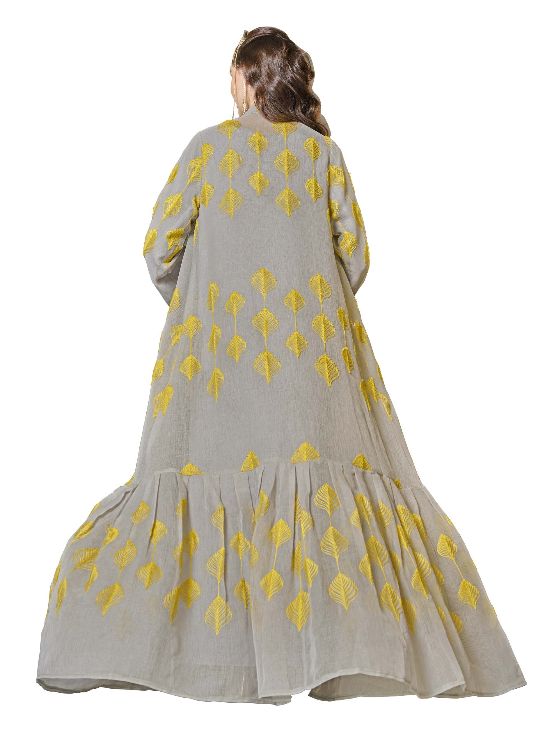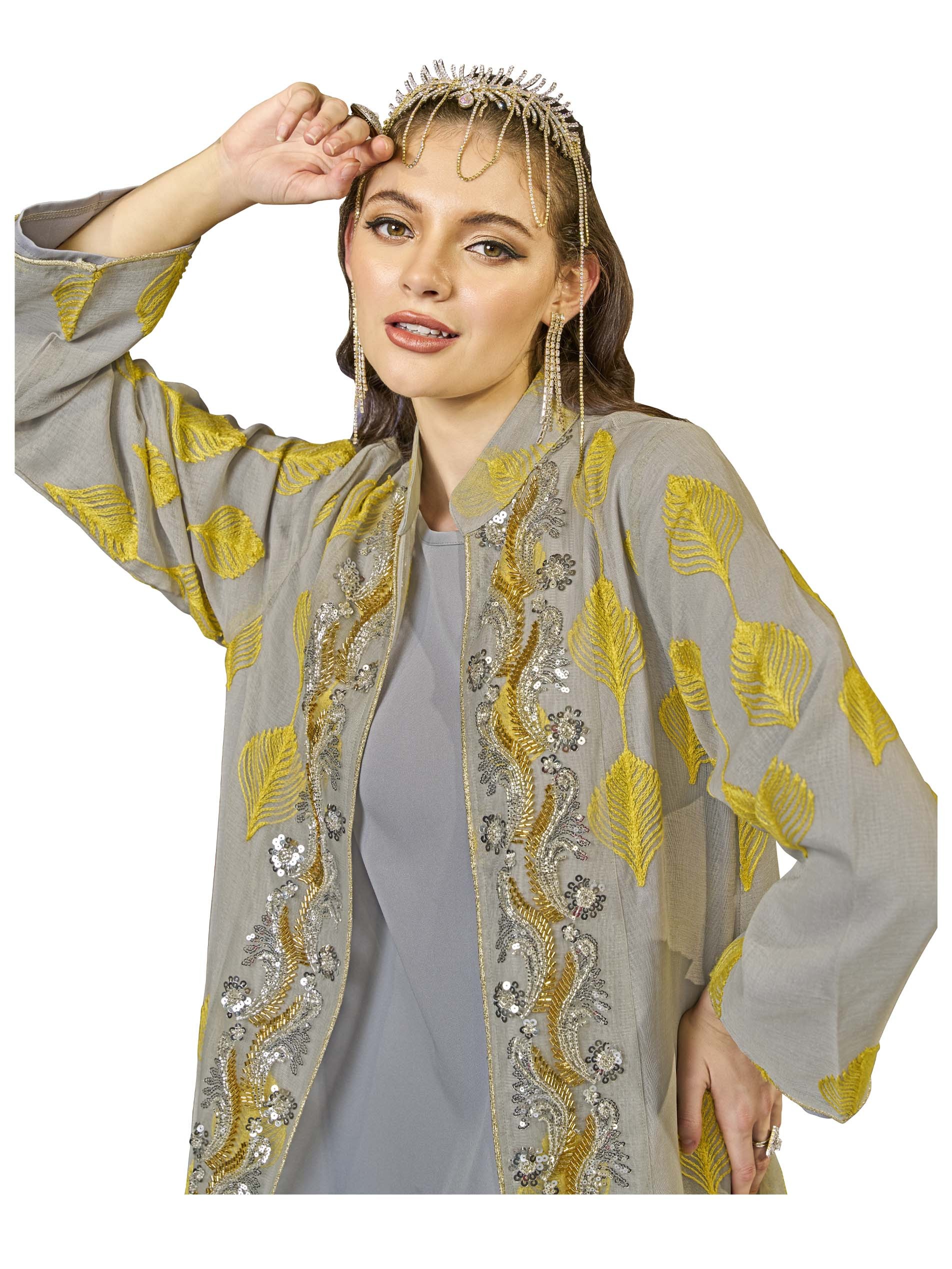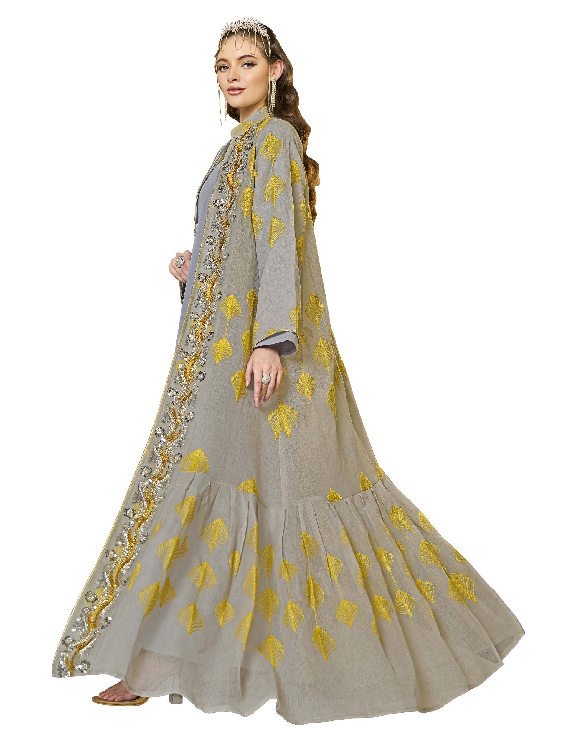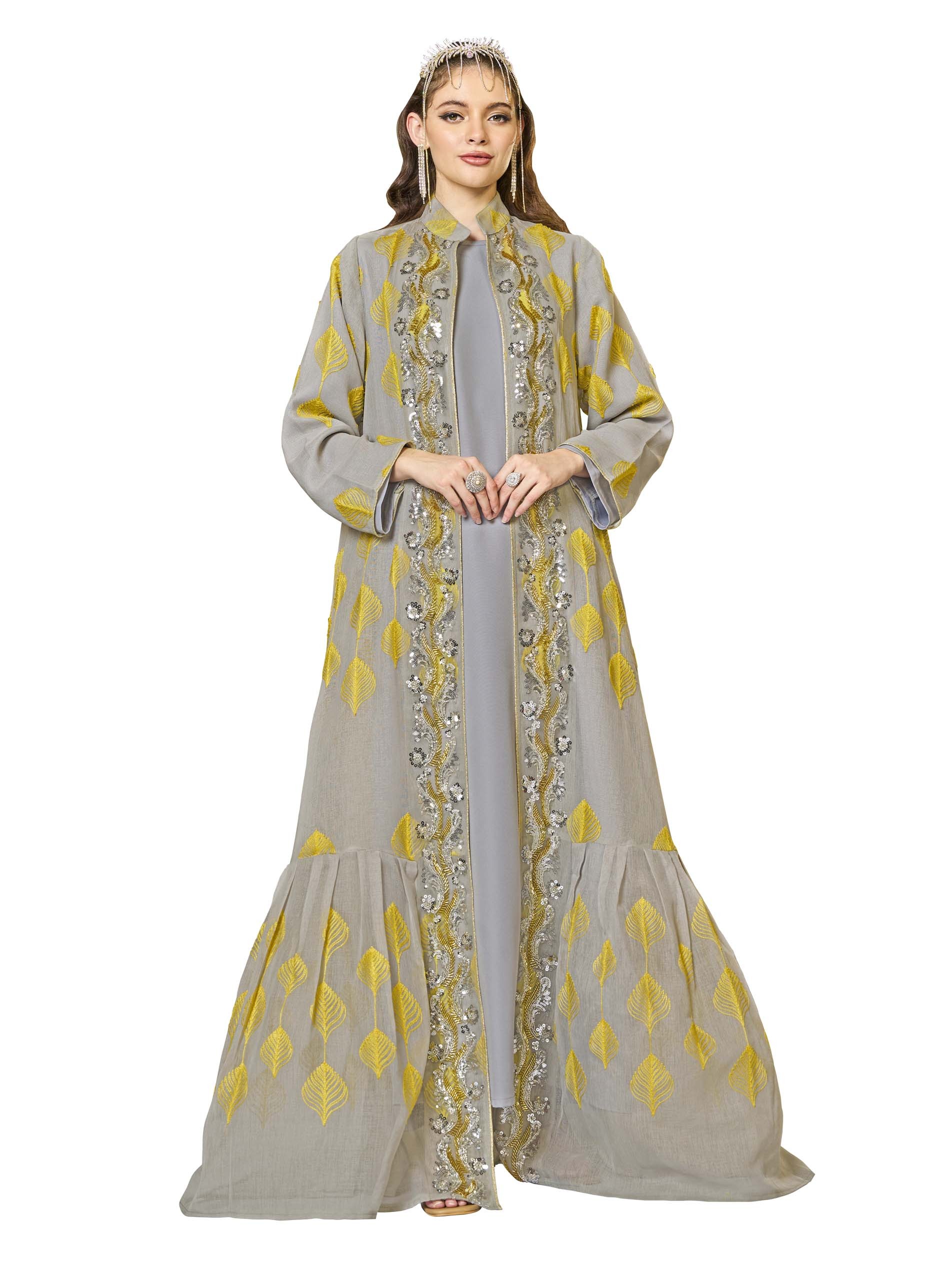 هذه الجلابية المصنوعة من الكتان المطرز تتميز بقصّة مفلّورة مع قاعدة باللون الرمادي الهادئ، مزينة بشكل جميل بأنماط أوراق ذهبية وتفاصيل فضية على طول الجبهة. السترة متعددة الطبقات مع الزخارف من الخرز تضيف لمسة أنيقة، مما يجعلها مثالية لمناسبات رمضان. مصنوعة من قماش دانتيل خفيف الوزن، توفر الراحة والأناقة خلال فصل الصيف.