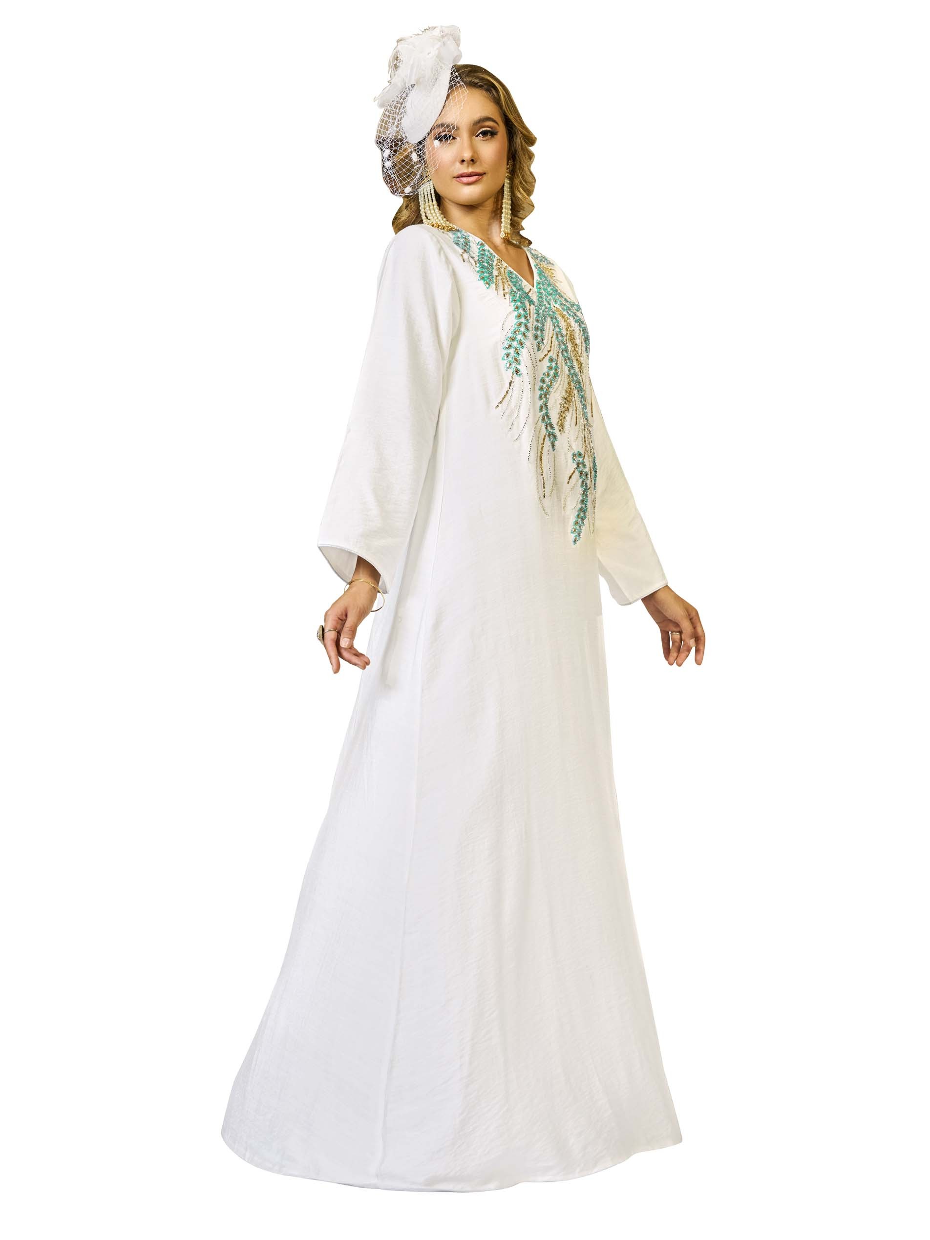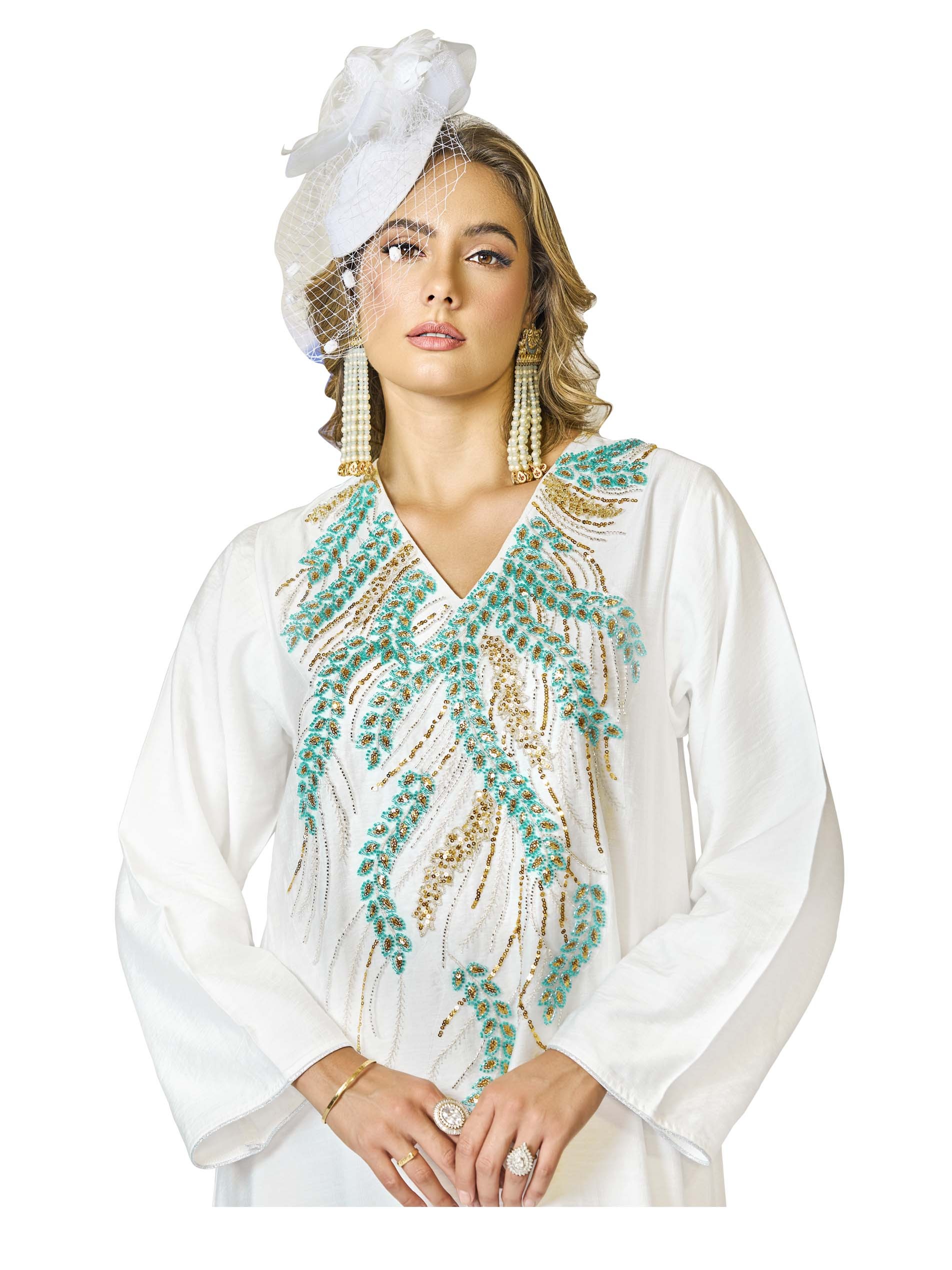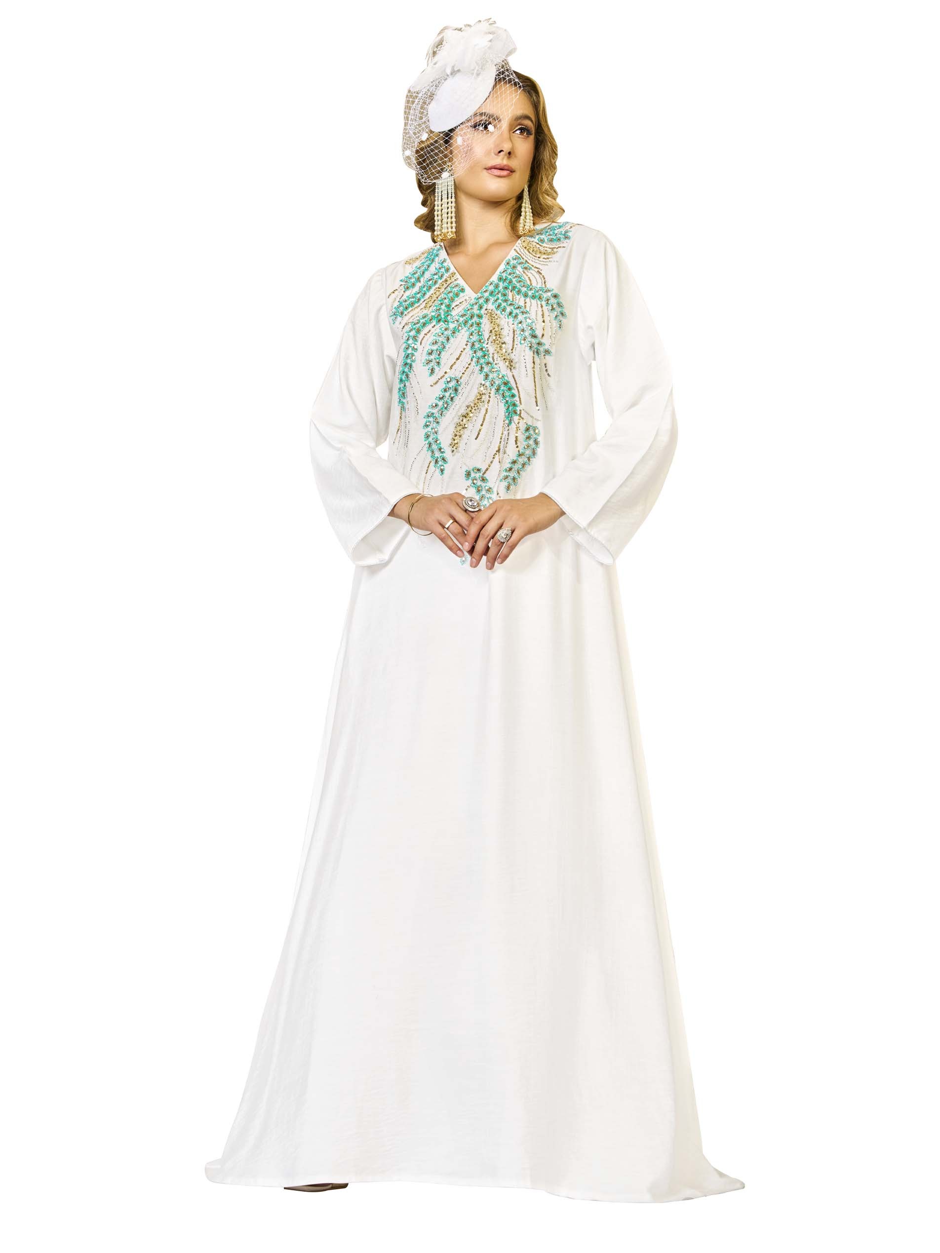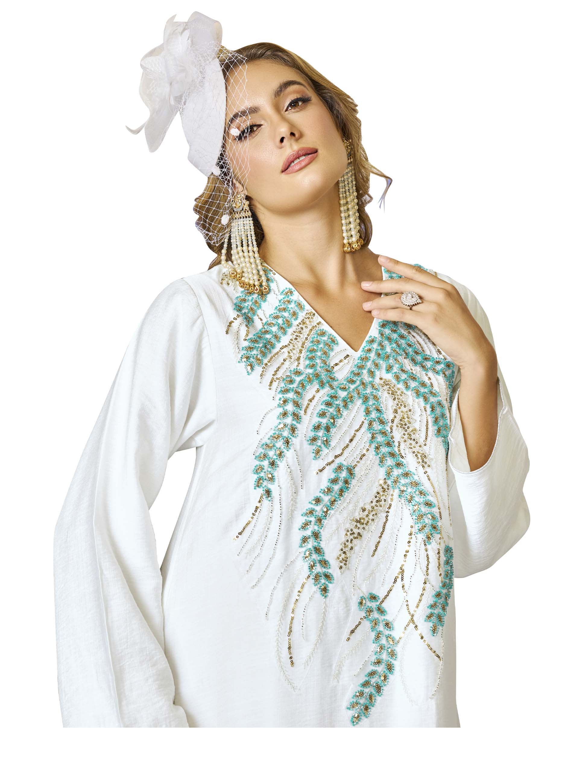 هذه الجلابية الأنيقة بقصّة متوسعة، المصنوعة من الكتان القابل للتنفس، تتميز باللون الفيروزي والذهبي مع تطريزات دقيقة من الخرز والخرز اللامع. القاعدة البيضاء الناعمة تعزز التصميم الجميل، مما يجعلها مثالية لمناسبات رمضان. مريحةوأنيقة، توفر مزيجاً مثالياً من الرقي والعملية لموسم الصيف.