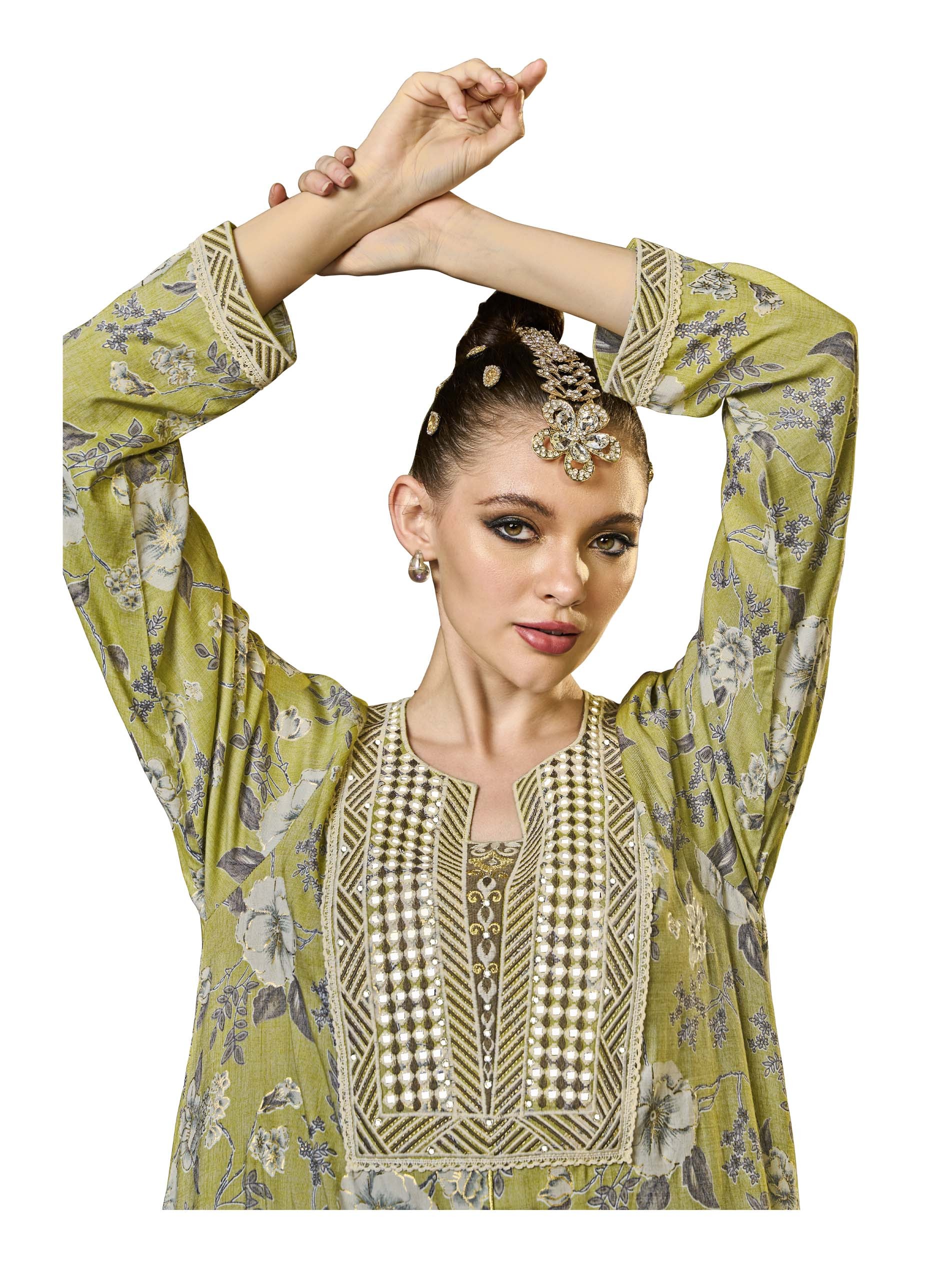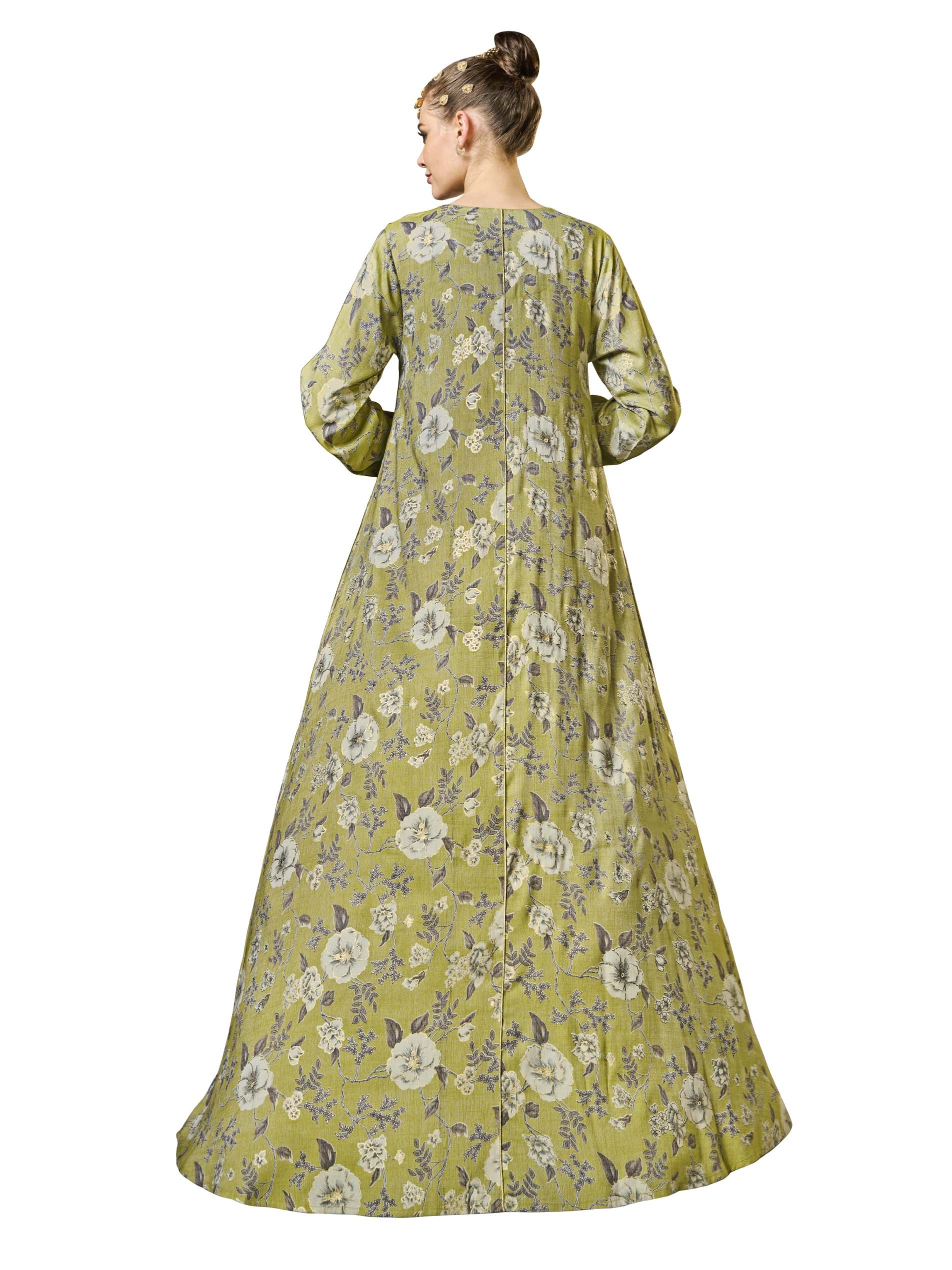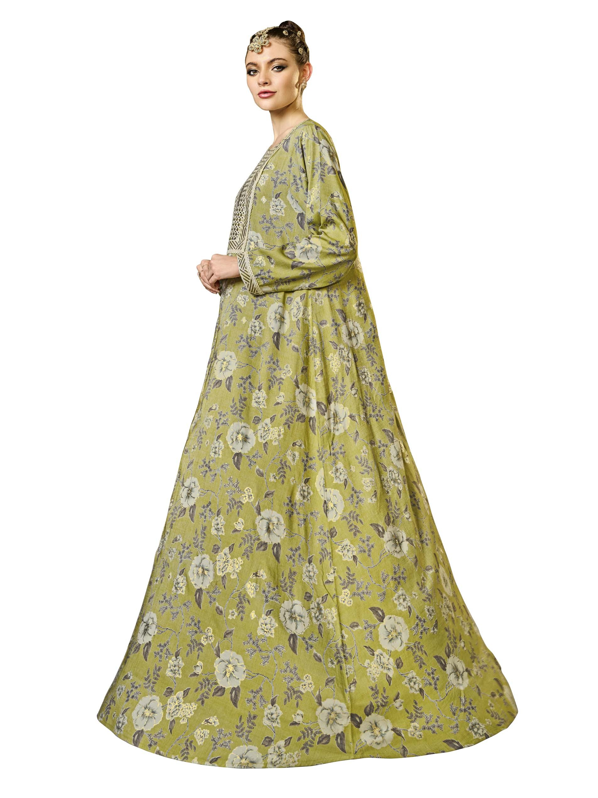 تتميز هذه الجلابية ذات القَصّة المُتَوَسِّعة، المصنوعة من القطن القابل للتنفس، بمزيج من الأناقة الكلاسيكية مع لمسة معاصرة، مما يجعلها مثالية للاحتفالات الرمضانية. يتم تعزيز اللون الأخضر الفاتح بطبعة زهور دقيقة وتطريز ذهبي، مما يخلق تصميمًا مستوحى من الطبيعة. يضمن تصميمها المنساب الراحة والأناقة خلال موسم الصيف الدافئ.
