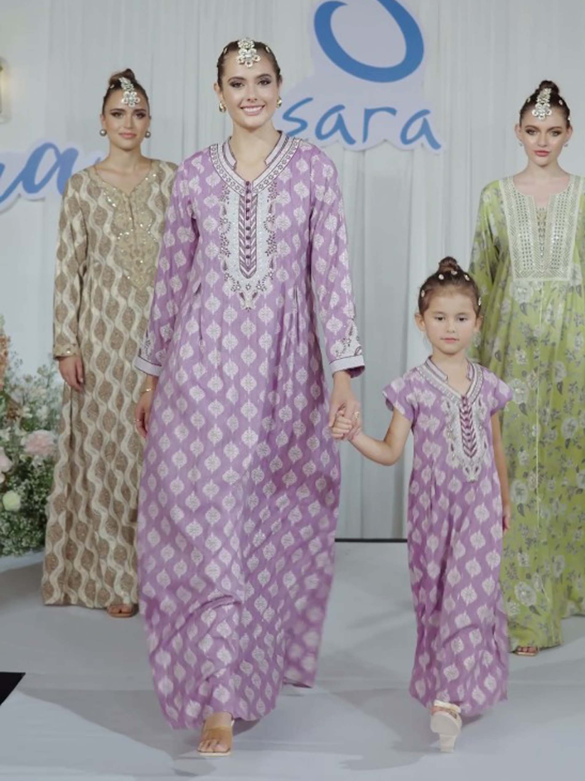 تتميز هذه الجلابية ذات القَصّة المُتَوَسِّعة المصنوعة من الفيزيكوس بطبعة داماسك لوريكس رائعة باللون الأرجواني الغني، مع تطريز دقيق وتفاصيل الأزرار. يجعل القماش الناعم والقَصّة المنسابة منها مثالية لأيام الصيف الدافئة، خاصة خلال رمضان. يجمع التصميم الأنيق بين الأناقة والراحة، مما يجعلها الخيار المثالي لهذا الموسم.