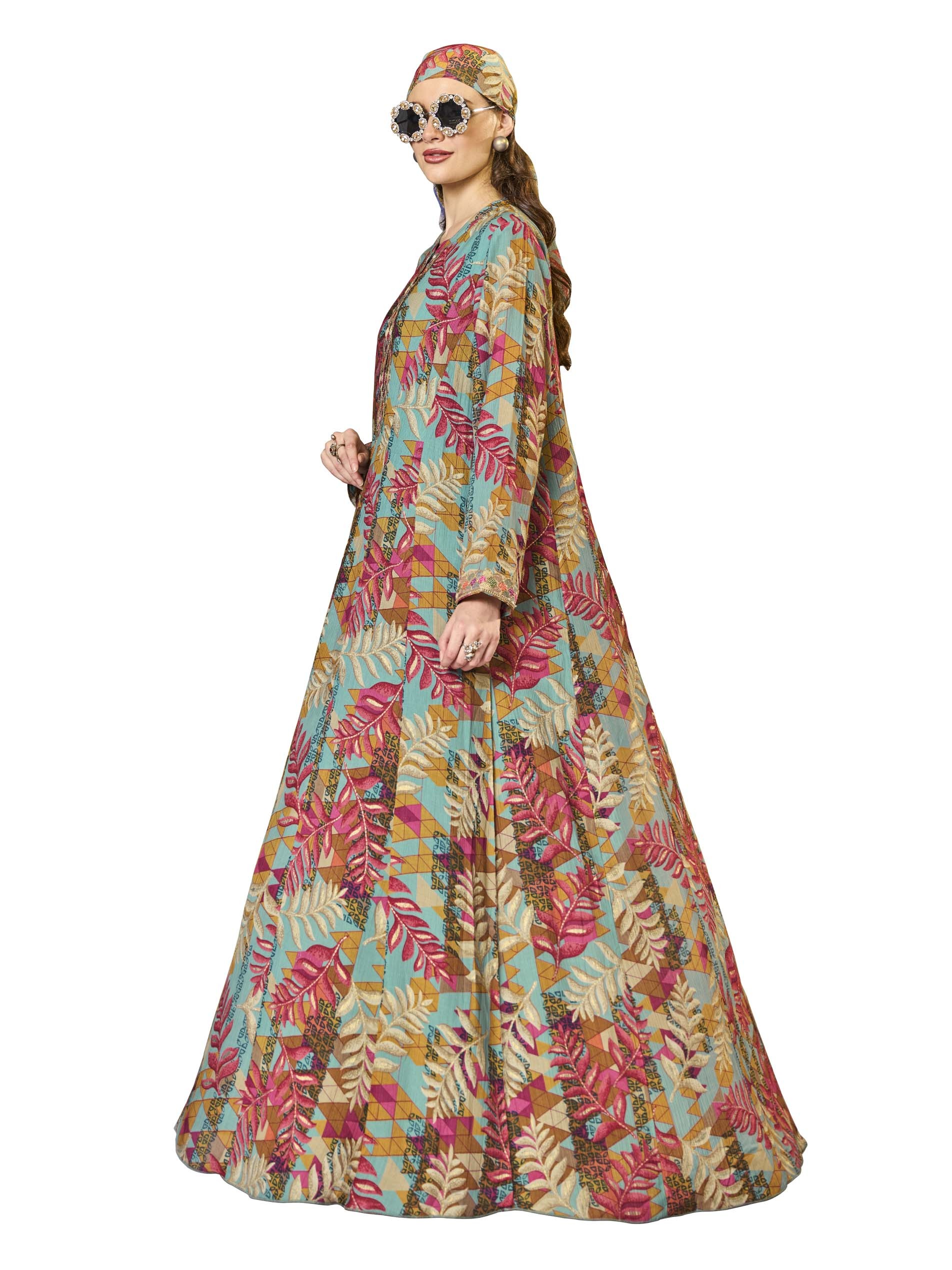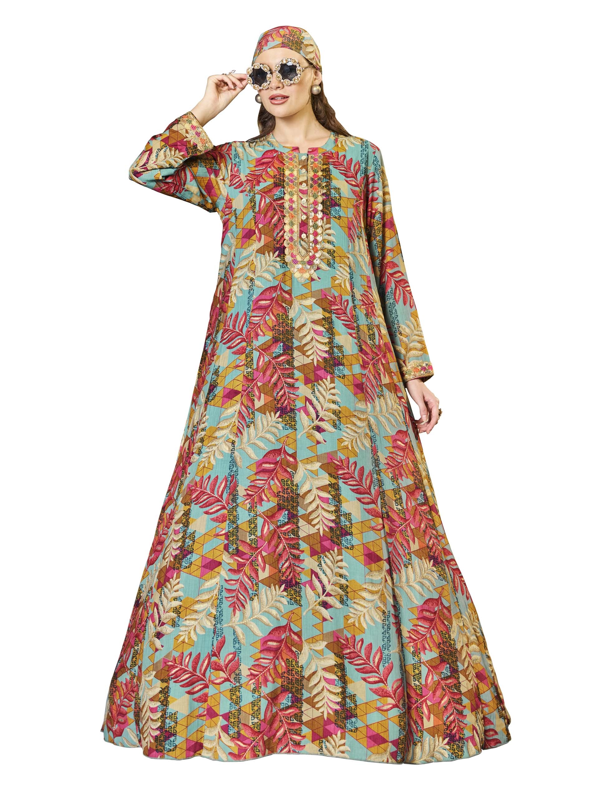 تتميز هذه الجلابية ذات القَصّة المُتَوَسِّعة، المصنوعة من القطن القابل للتنفس، بأنها خيار لافت وجذاب لحفلات الصيف. تحتوي على نقوش هندسية ورسوم أوراق تجريدية بألوان تركواز، وردي، وأصفر خردلي، مما يضفي عليها طابعًا مبهجًا وحيويًا. كما يتم تعزيز التصميم بعمل تطريزي دقيق باستخدام الفويل، مما يجعلها قطعة مميزة.