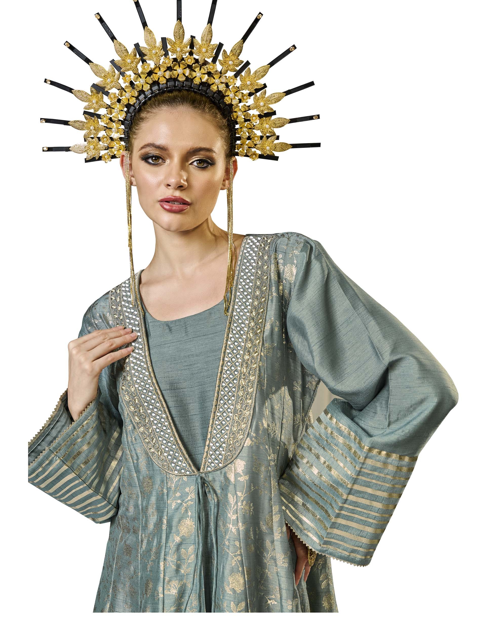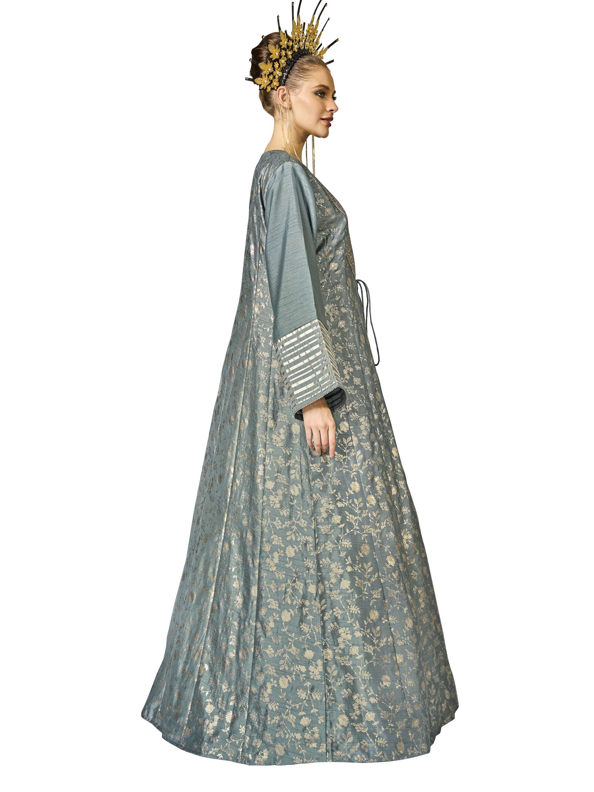 تتميز هذه الجلابية ذات الطراز الجاكيت، المصنوعة من القطن القابل للتنفس، بطبقة داخلية باللون الرمادي الناعم التي تتكامل مع الطباعة الزهرية الرقيقة على الجاكيت الخارجي. يضيف طبع الفويل والتطريز الذهبي لمسة من الأناقة، بينما يضيف القطع العصري للجاكيت لمسة معاصرة على القَصّة التقليدية. مثالية لشهر رمضان المبارك، تجمع هذه القطعة بين الأناقة والأهمية الثقافية.