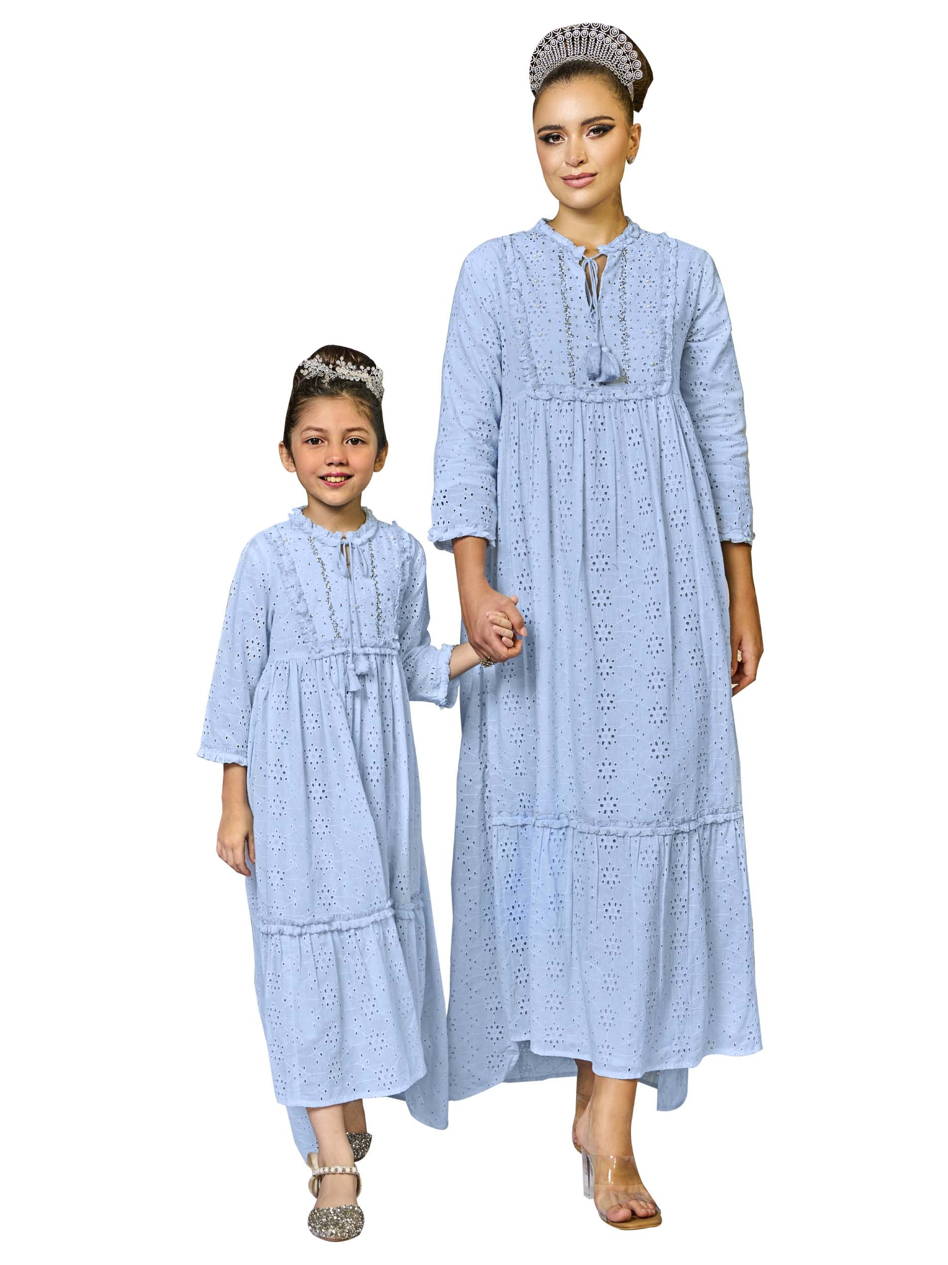 تتميز هذه الجلابية الزرقاء الناعمة للأطفال بأشكال زهرية مرحة وتفاصيل ساحرة مع شراشيب عند الياقة. تضيف القصّة المتوسعة والتصميم متعدد الطبقات لمسة مرحة وأنيقة، بينما تعزز تفاصيل الشيفلي والزخارف جاذبيتها الاحتفالية. مثالية لموسم رمضان، حيث تضمن الراحة والأناقة خلال الاحتفالات الصيفية.