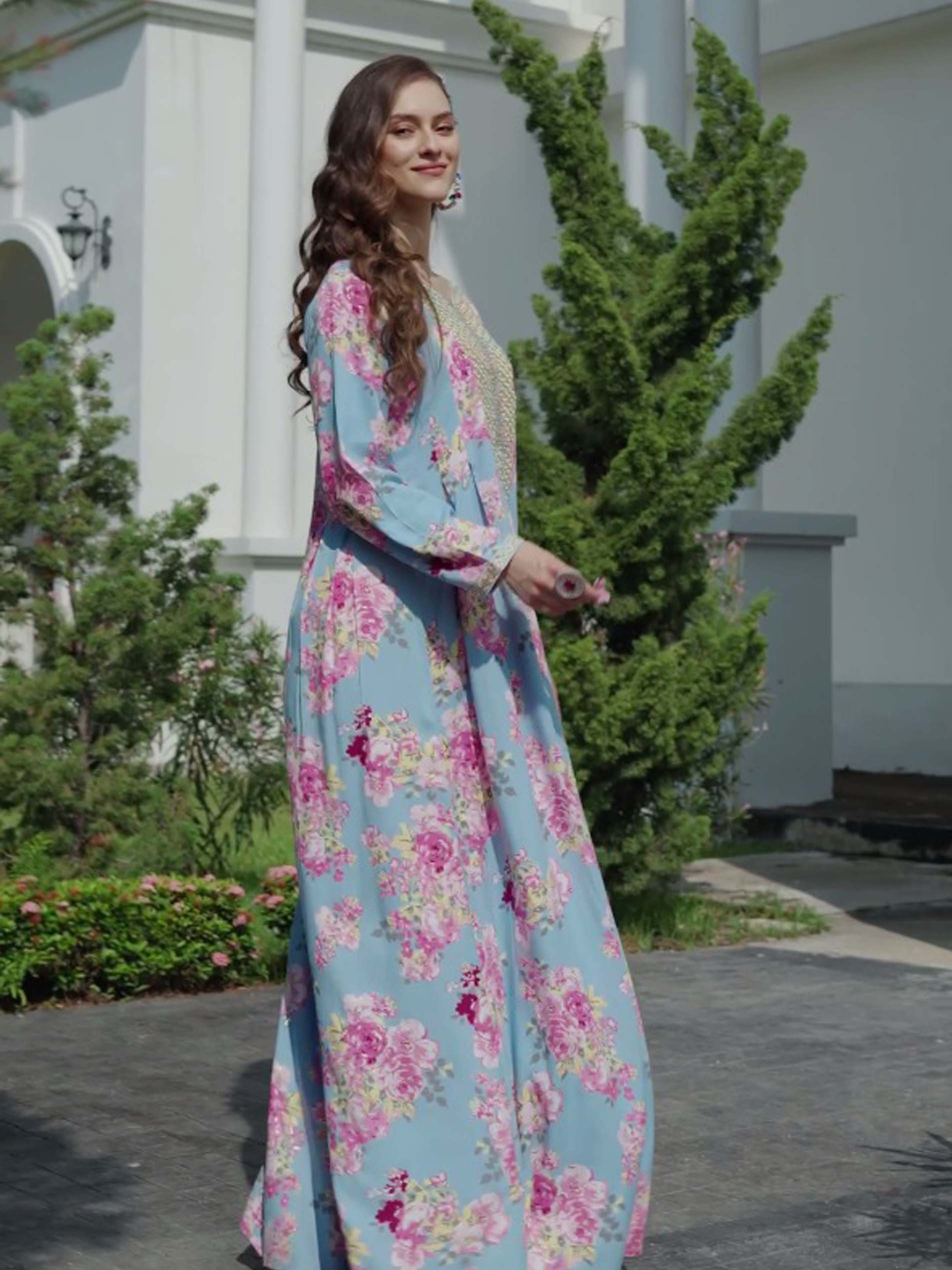 هذه الجلابية القطنية الرايون ذات القصّة المتوسعة للأطفال تتميز بلون أزرق باستر مع طبعات زهور زاهية باللون الوردي والأصفر والأخضر، وزهور صفراء زاهية عند العنق. يضيف التطريز الدقيق عند العنق لمسة أنيقة، بينما يجعل القماش القابل للتنفس والأكمام المقصوصة منها الخيار المثالي للاحتفالات غير الرسمية وحفلات الصيف للأطفال.